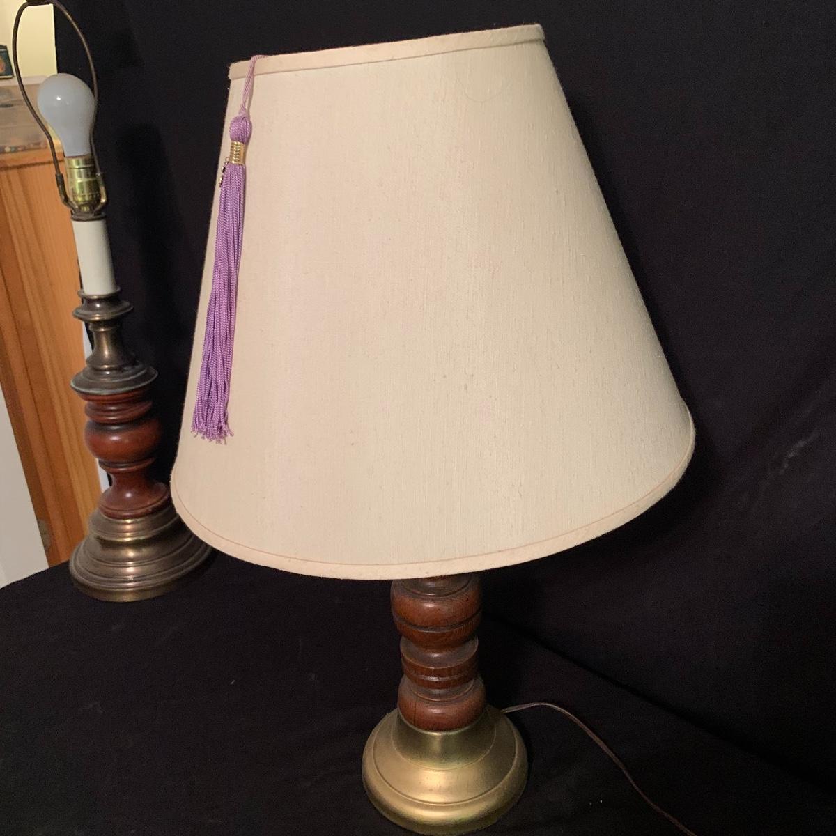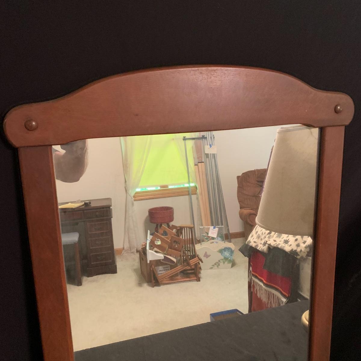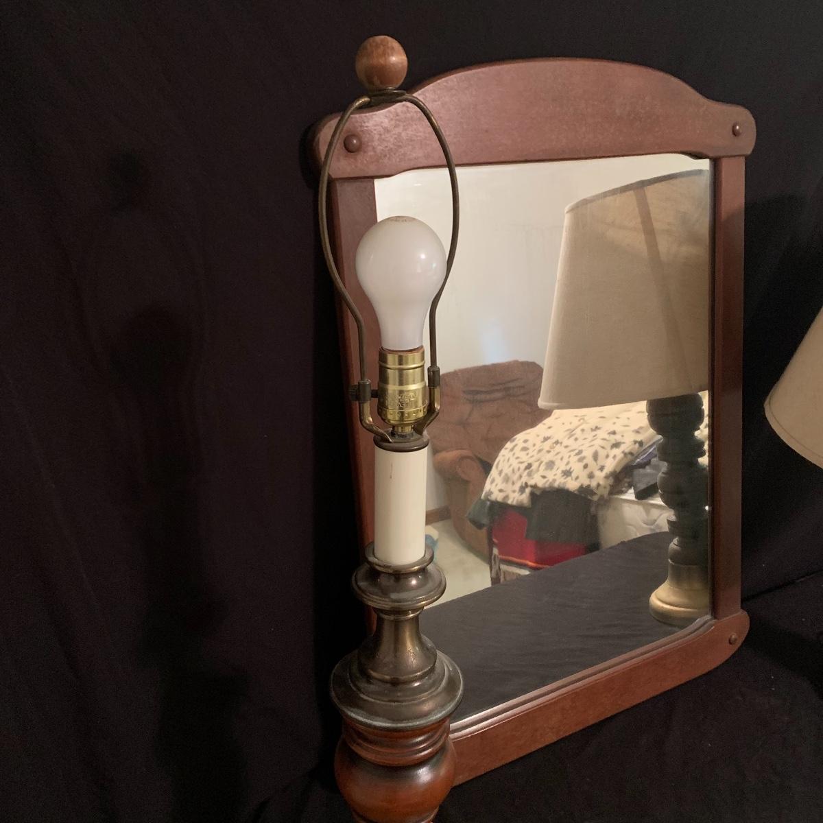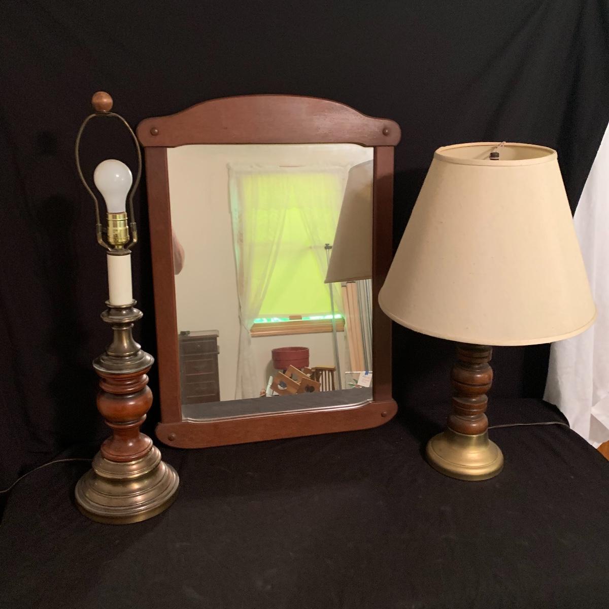 These wooden accents are gorgeous! This lot includes two wooden lamps that both feature brass bases, and turned wooden bodies. The lamp without the shade stands 30” tall, and the other is 26” tall. Both lamps were tested and turned on when plugged in. This lot also includes a wood framed mirror that is in good condition, and measures 30” X 21”. Local pickup only.