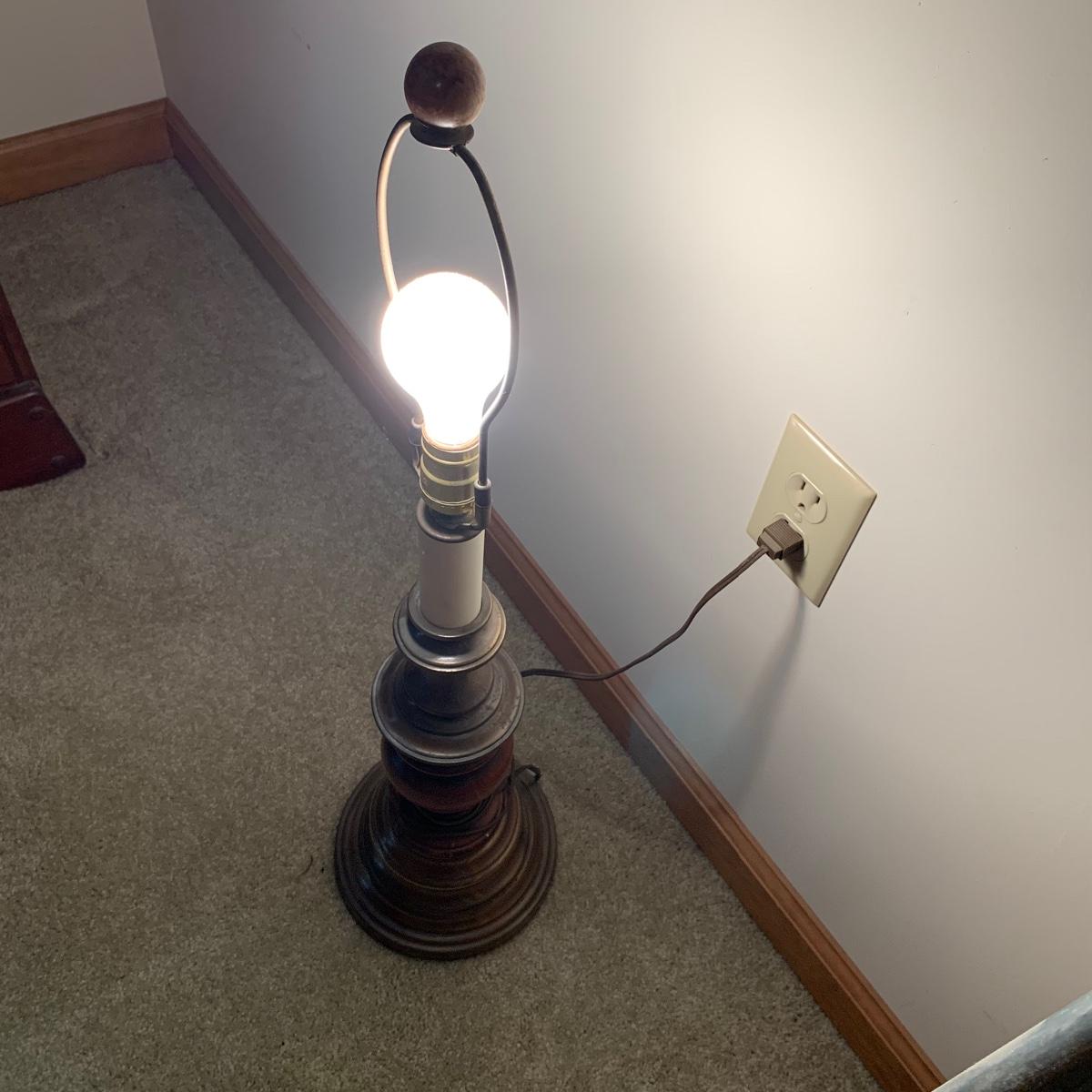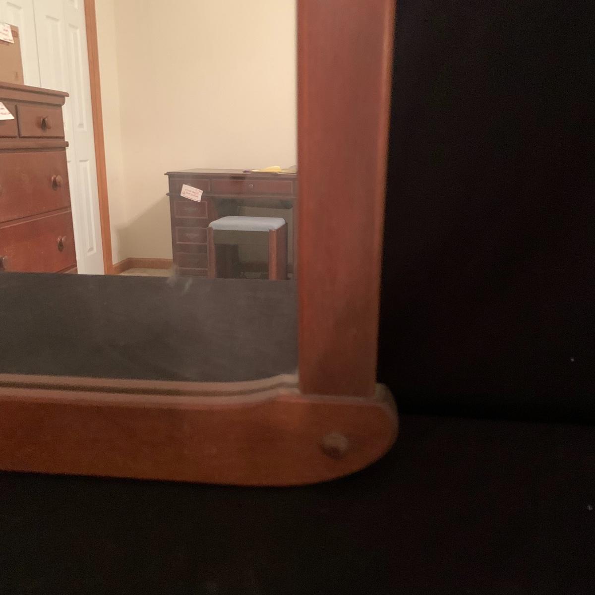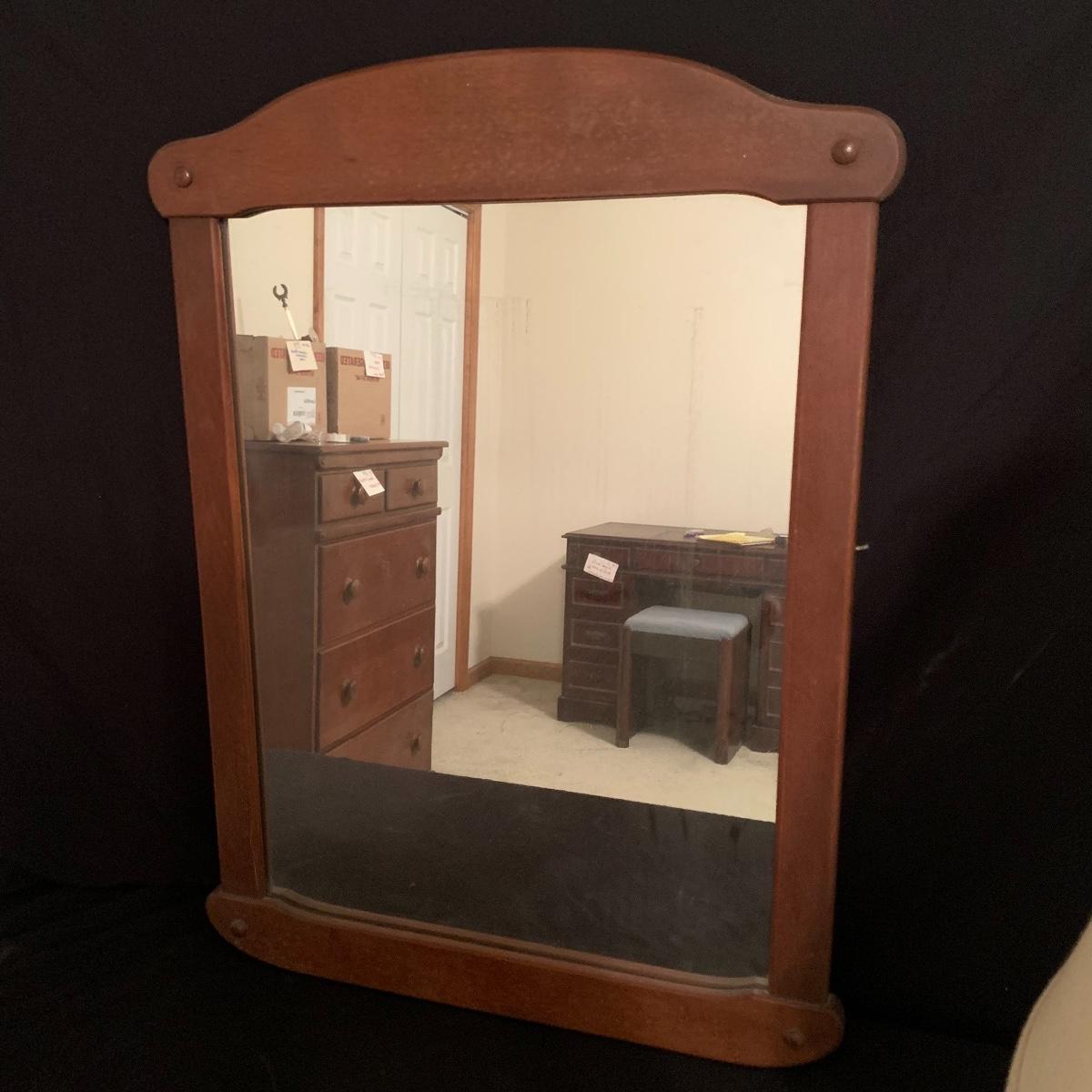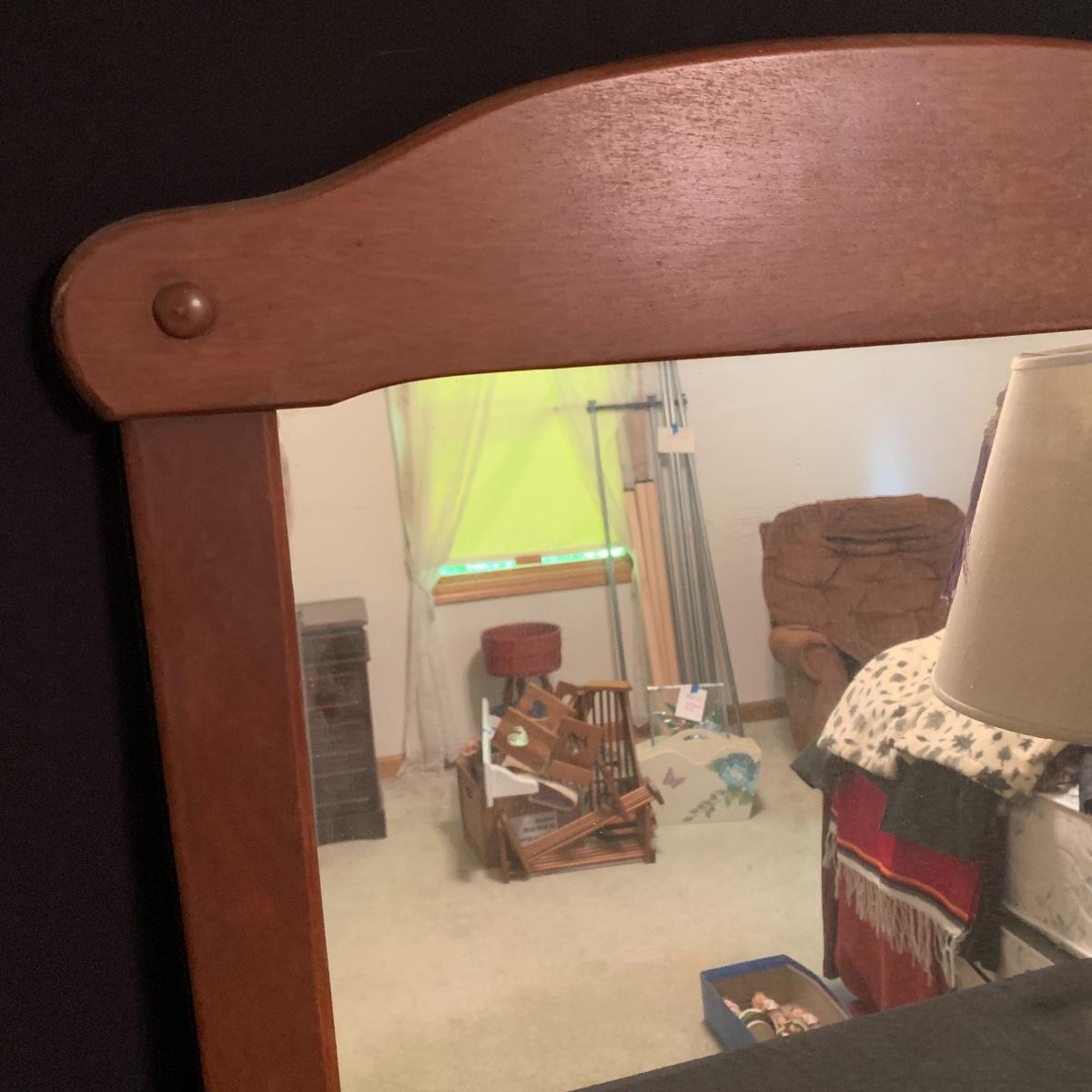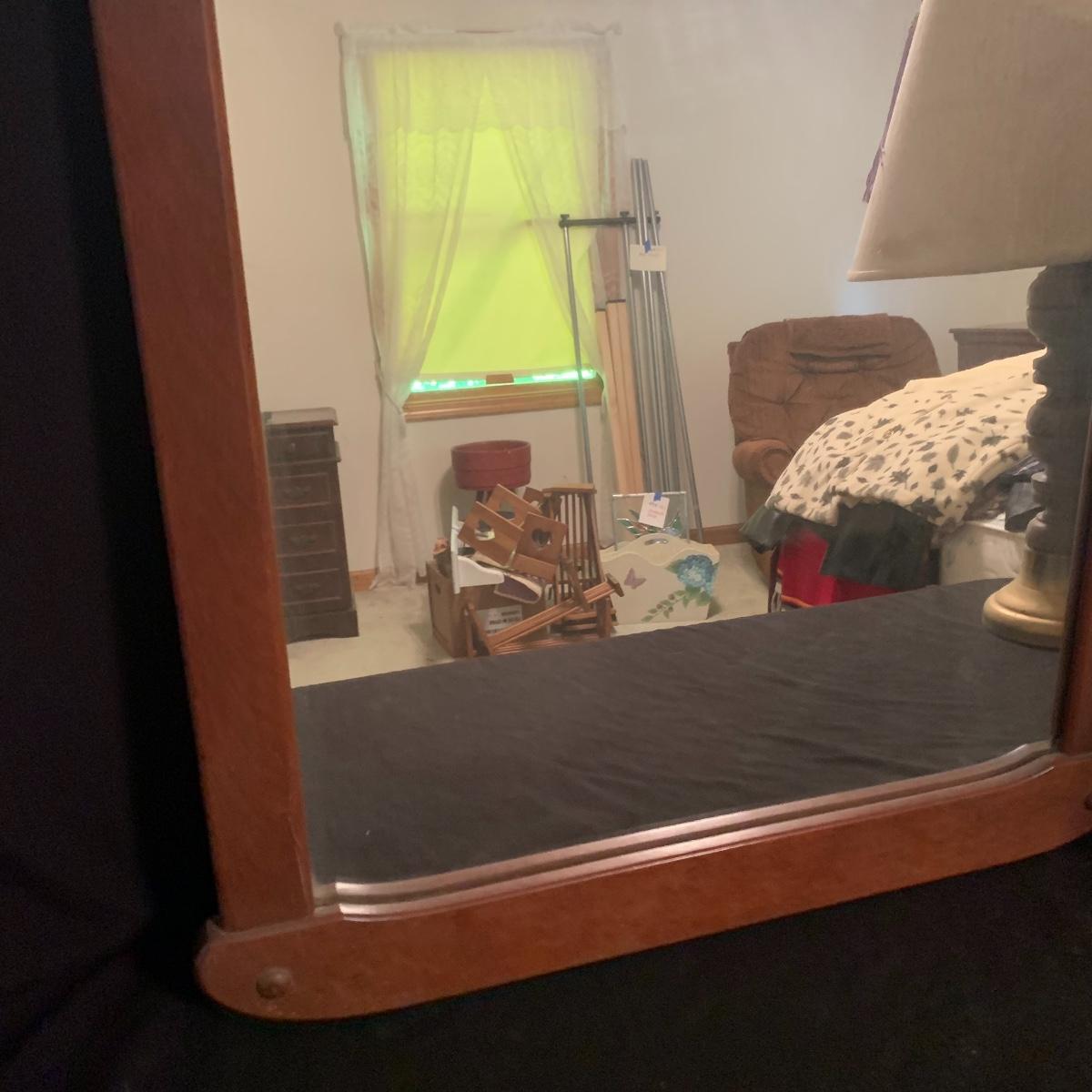 These wooden accents are gorgeous! This lot includes two wooden lamps that both feature brass bases, and turned wooden bodies. The lamp without the shade stands 30” tall, and the other is 26” tall. Both lamps were tested and turned on when plugged in. This lot also includes a wood framed mirror that is in good condition, and measures 30” X 21”. Local pickup only.