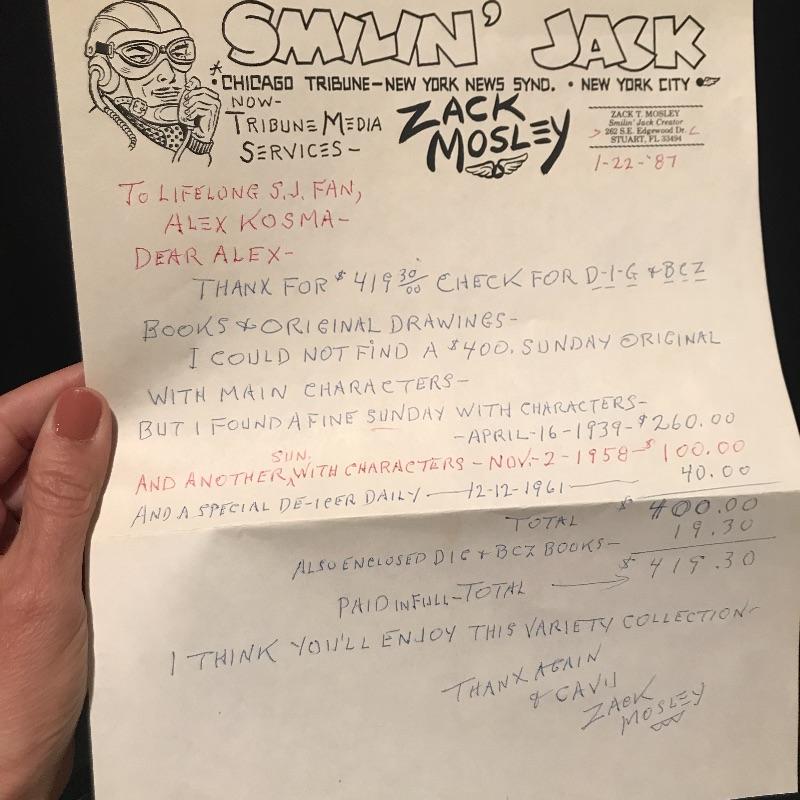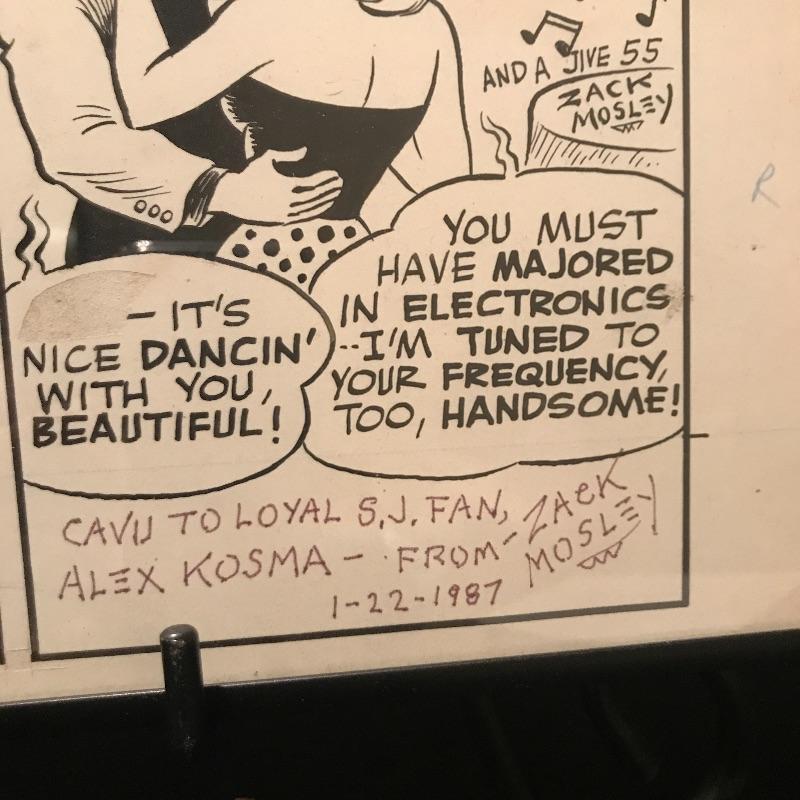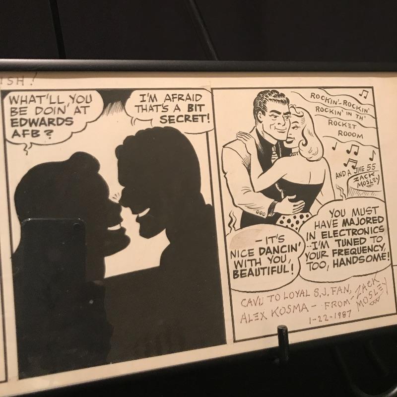 Similar to the artwork in Lot 304 and 305, this is a framed The Adventures of Smilin’ Jack comic original art panels framed and signed by Zack Mosley, the comic strip artist. The art is dated Dec 21, 1961 and the signature is dated 1-22-87. The framing covers a bit of the message and date on the top portion. See pix. Measures 22” x 7.5” Lot also includes letter from Zack Mosley regarding the purchases and a newsletter insert. Shipping available.