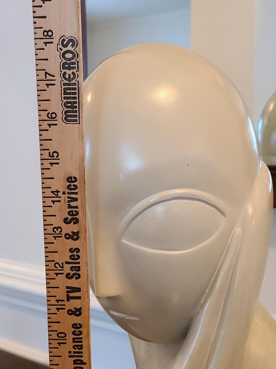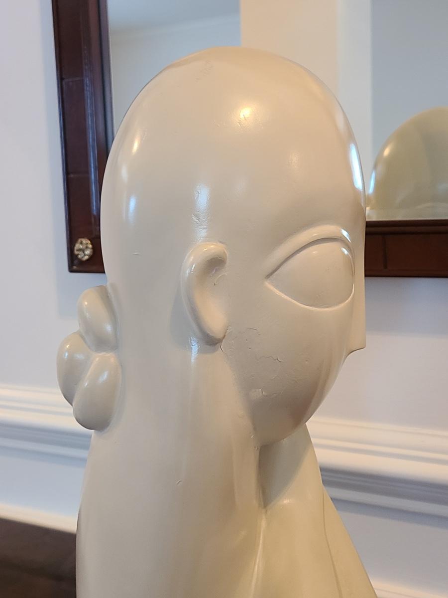 This vintage sculpture is reproduction of a famous work in the museum of modern art by Constantin Brancusi. It is titled "Head of a Woman". This looks to be a 1981 piece so around 40 years old. Looks new when you first look at, but under inspection, there is a small fleck out of surface near top of left eye (see pics). This is a larger piece, and captures your eye when you enter, because it almost looks alien instead of female. Please see all pictures as they are the best representation of the items. The pictures show condition, measurements if taken, and what is included in the lot. Due to the large amount that we photograph and the time frame, we are not always able to take measurements. All items unless noted, are pre-owned and have been used. If you purchased furniture, you must bring help. We do not allow one person to carry large furniture out on their own. Bring help, tools and a truck for the safety of our client’s homes, and your personal safety. Company policy. Thank you.