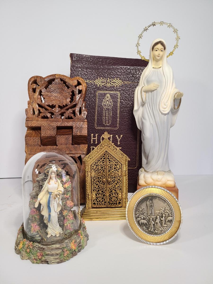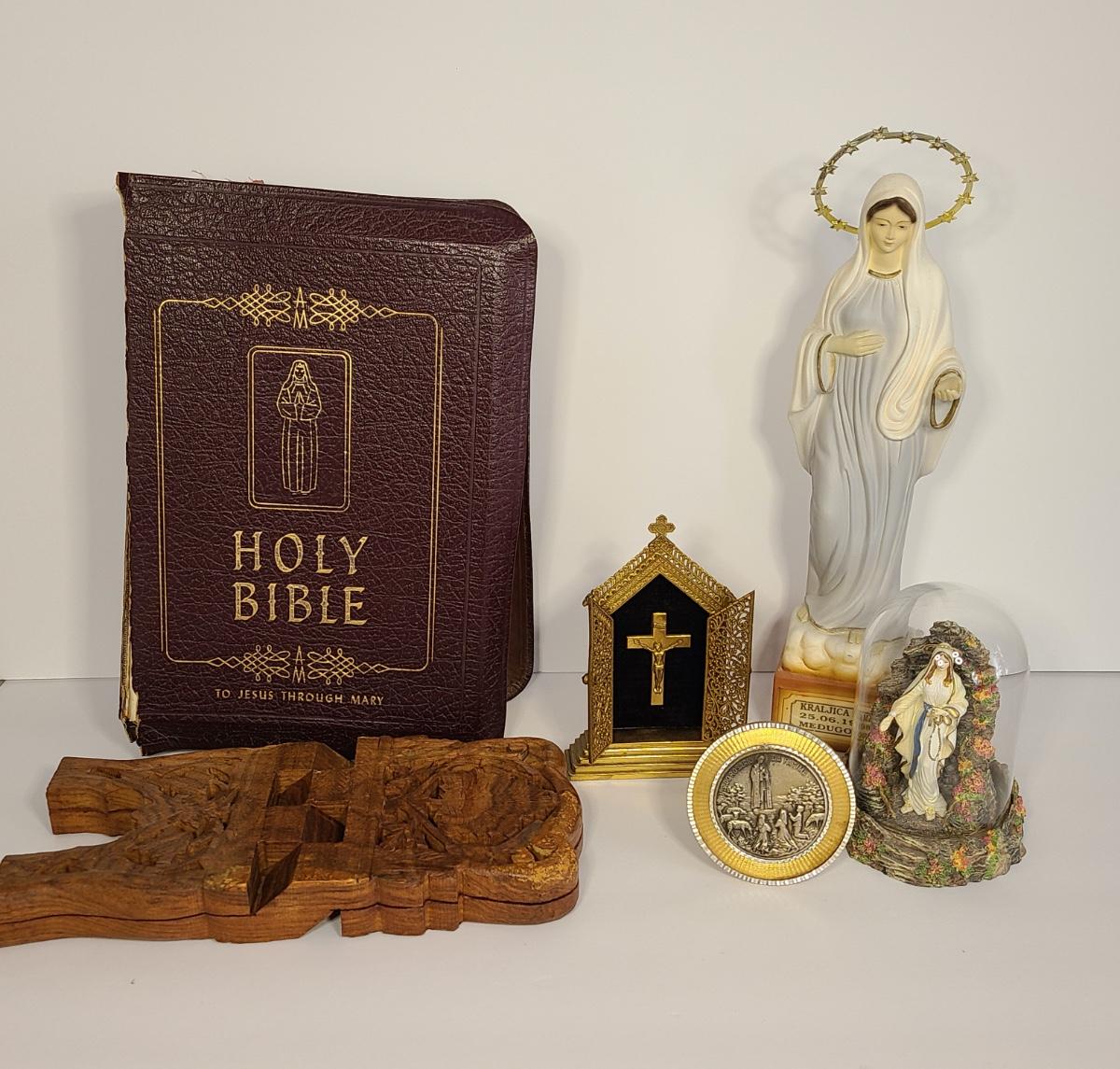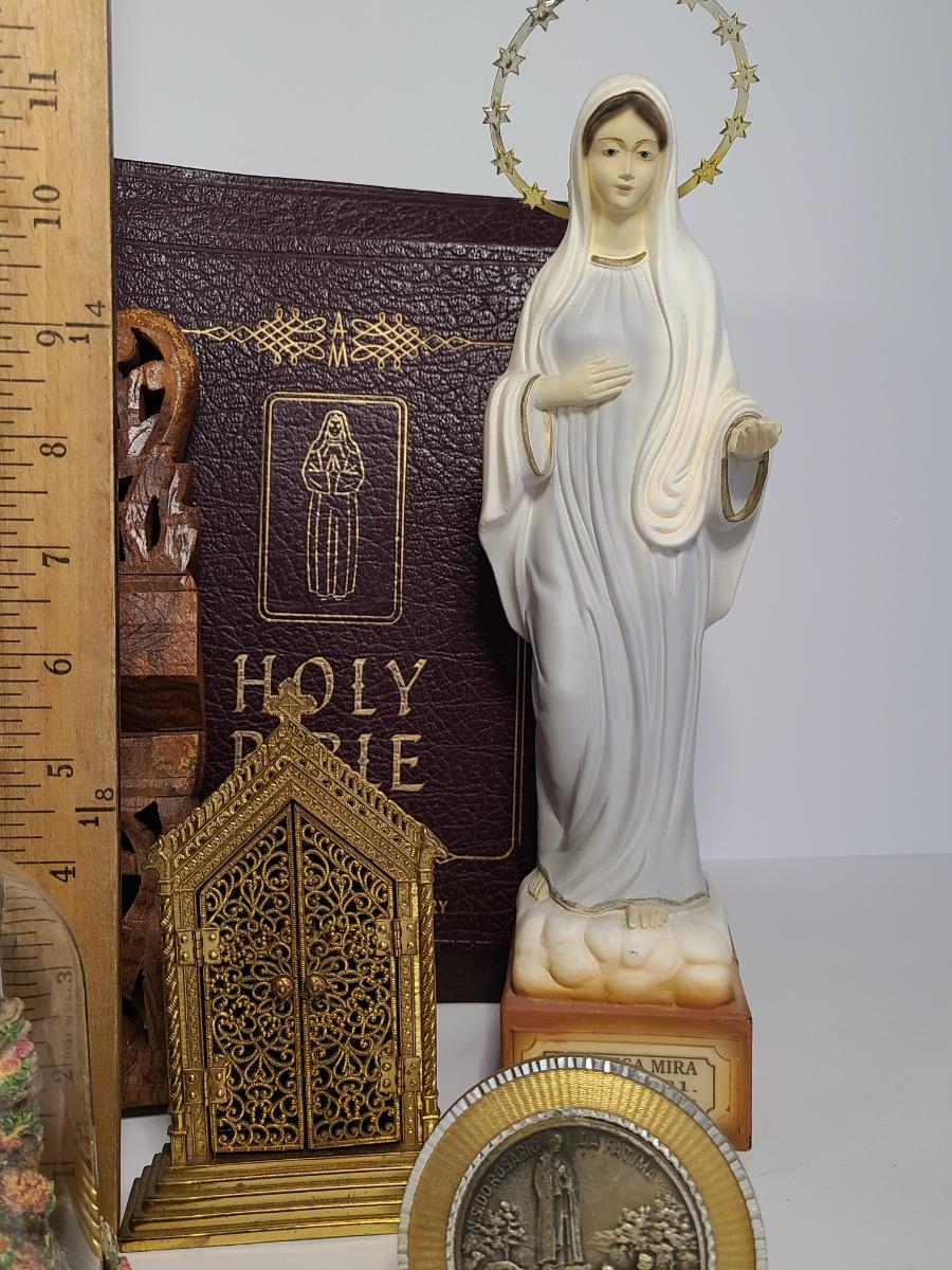 Lovely lot of religious items. The bible does show some wear. Included is a hard to find made in Italy traveling double door cased crucifix. Please see all pictures as they are the best representation of the items. The pictures show condition, measurements if taken, and what is included in the lot. Due to the large amount that we photograph and the time frame, we are not always able to take measurements. All items unless noted, are pre-owned and have been used. If you purchased furniture, you must bring help. We do not allow one person to carry large furniture out on their own. Bring help, tools and a truck for the safety of our client’s homes, and your personal safety. Company policy. Thank you.