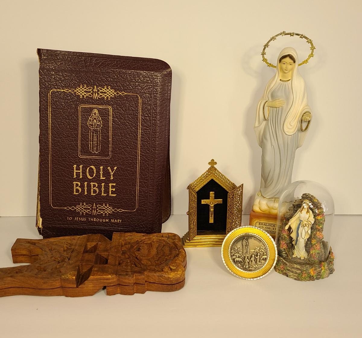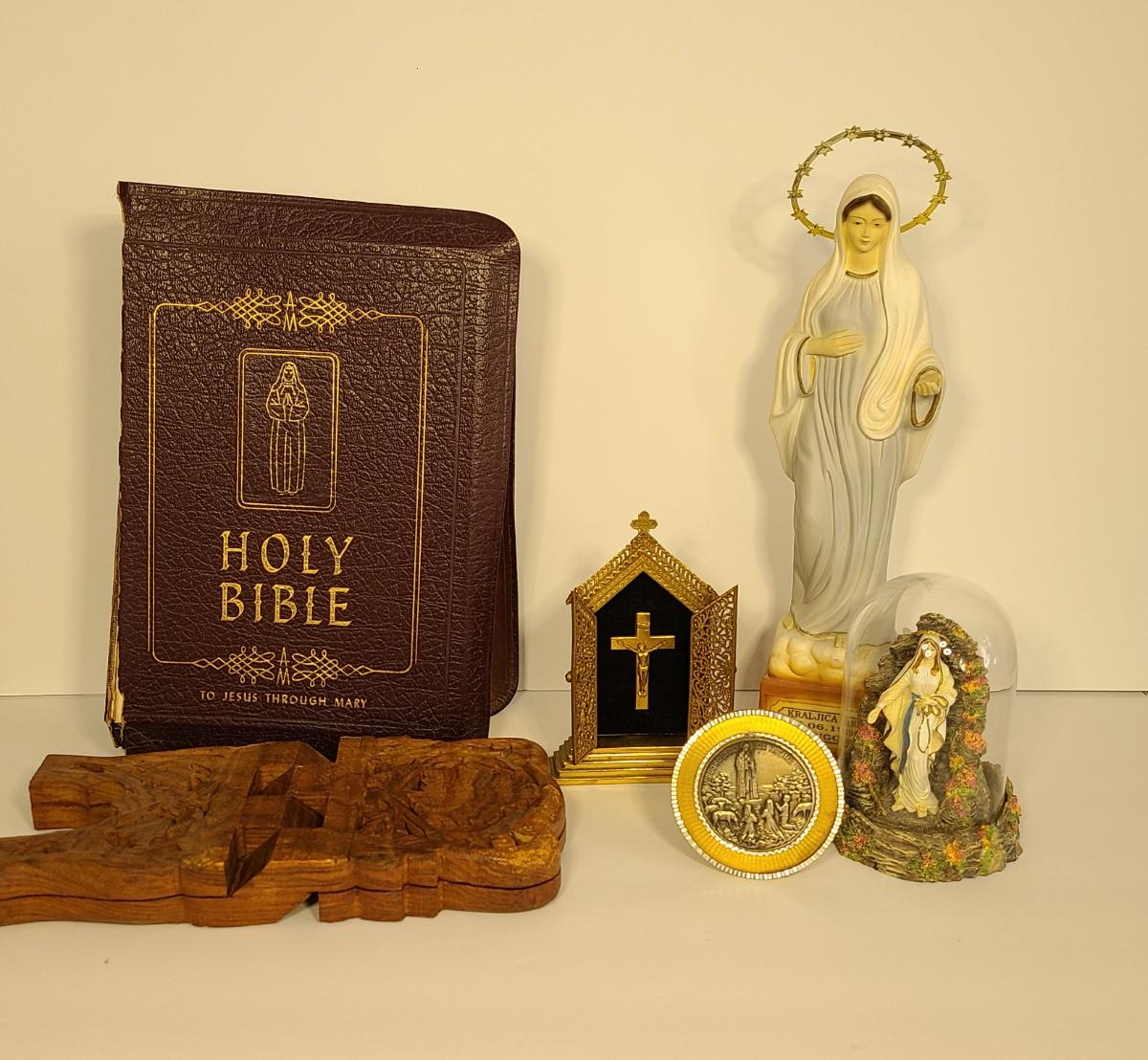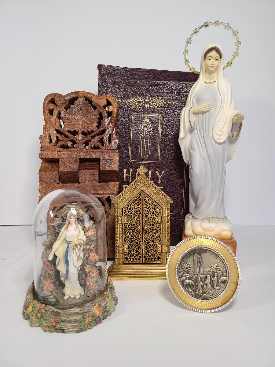 Lovely lot of religious items. The bible does show some wear. Included is a hard to find made in Italy traveling double door cased crucifix. Please see all pictures as they are the best representation of the items. The pictures show condition, measurements if taken, and what is included in the lot. Due to the large amount that we photograph and the time frame, we are not always able to take measurements. All items unless noted, are pre-owned and have been used. If you purchased furniture, you must bring help. We do not allow one person to carry large furniture out on their own. Bring help, tools and a truck for the safety of our client’s homes, and your personal safety. Company policy. Thank you.