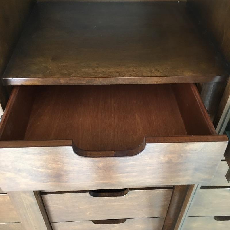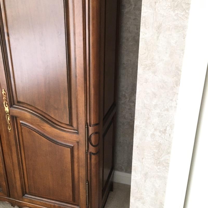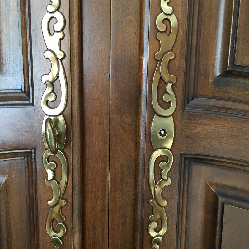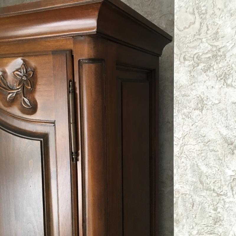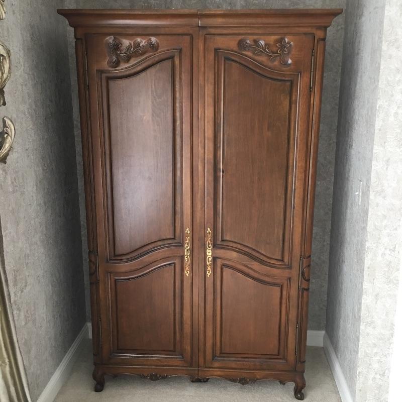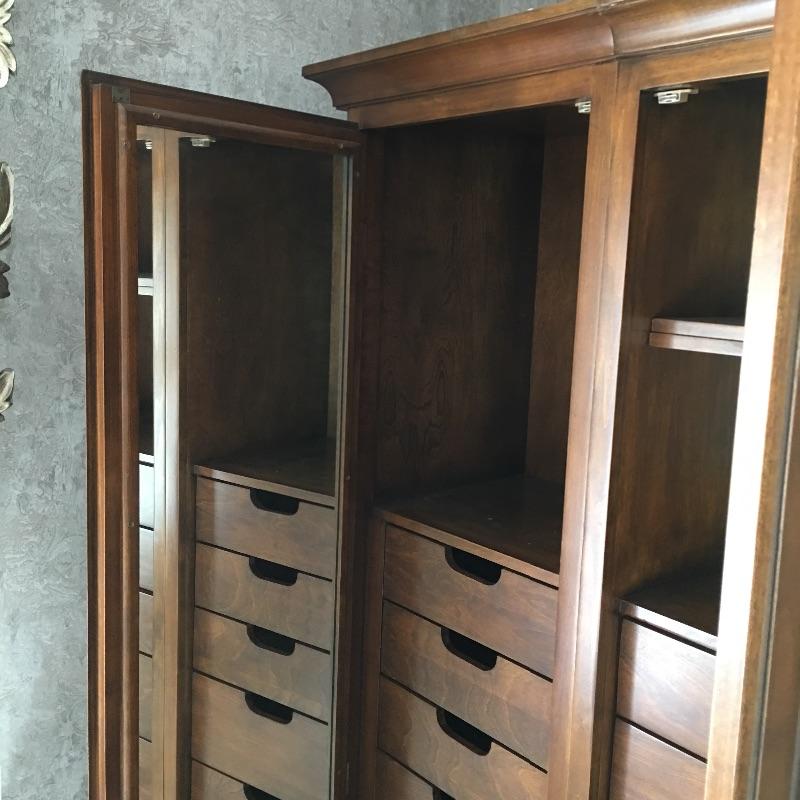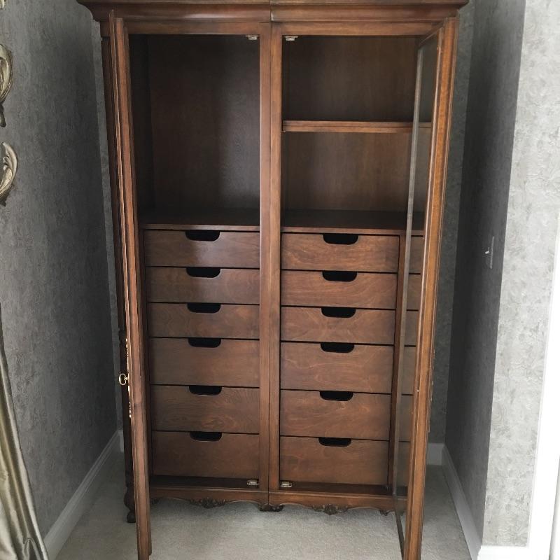 Elegant and useful, this handsome armoire has twelve drawers and a mirror on the inside of each door. You can store all your clothes and much, much more whilst adding a classic piece to your space. The armoire is missing a handle for one door, see images.