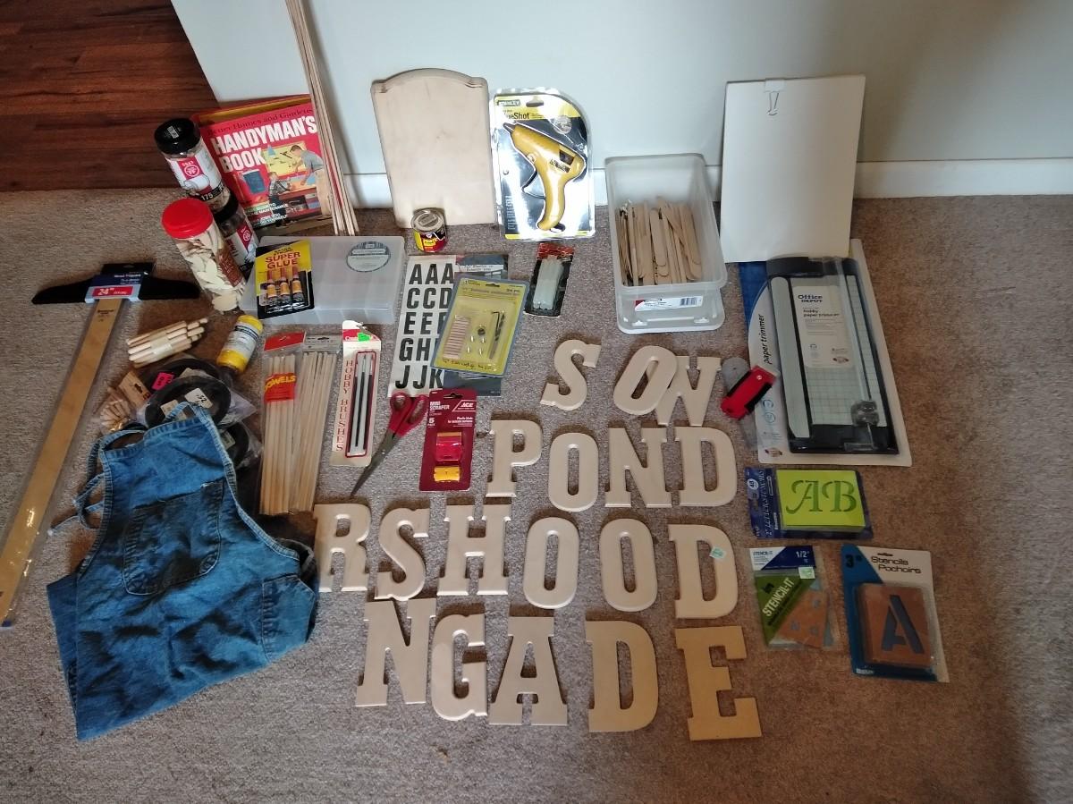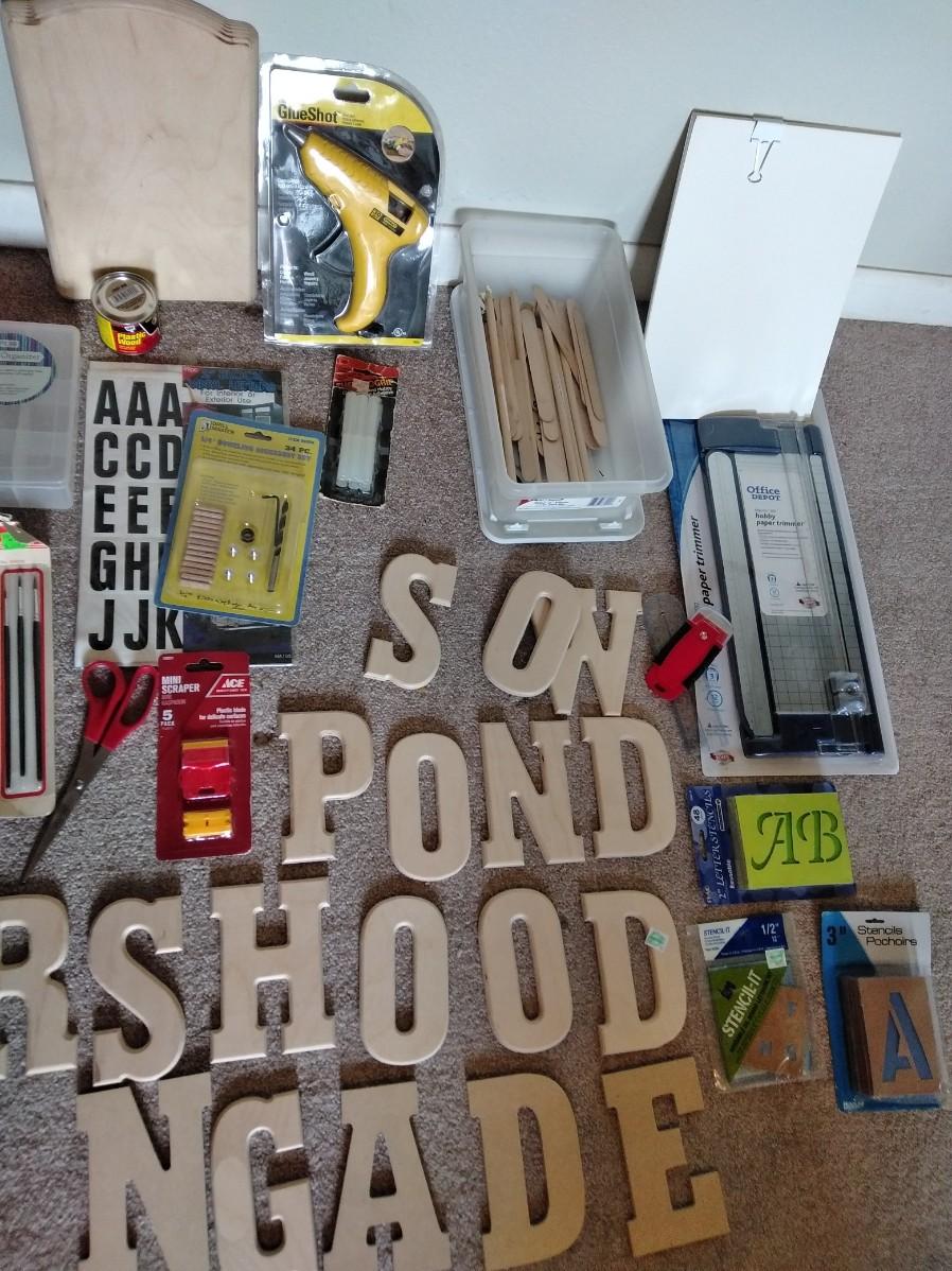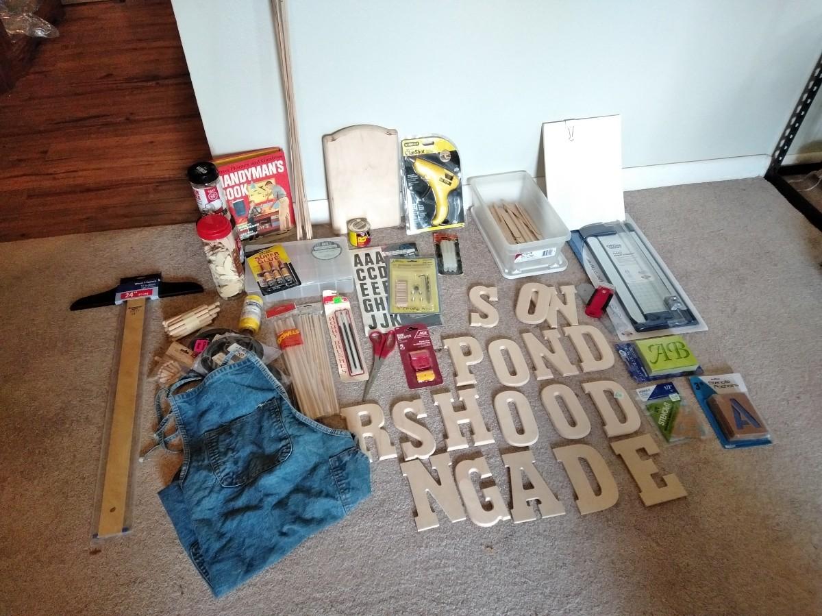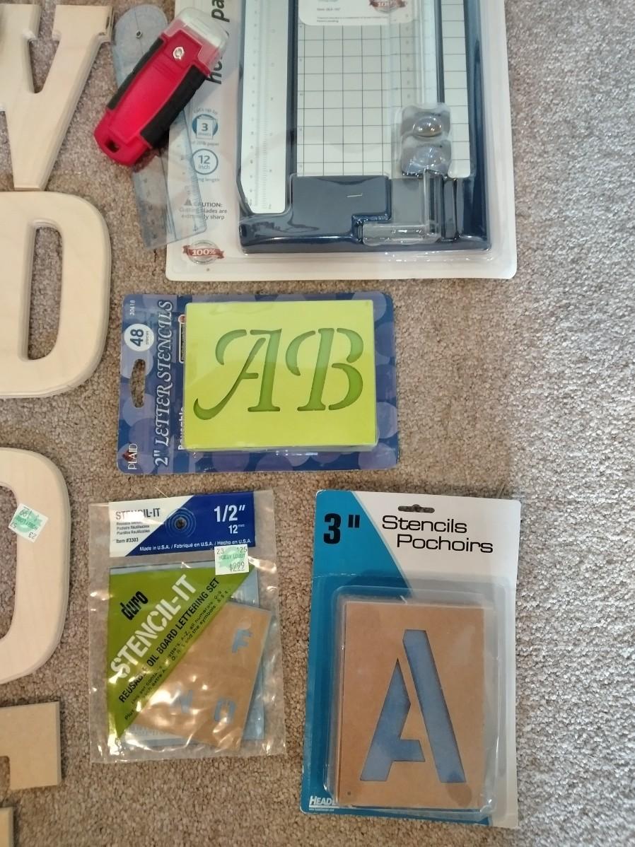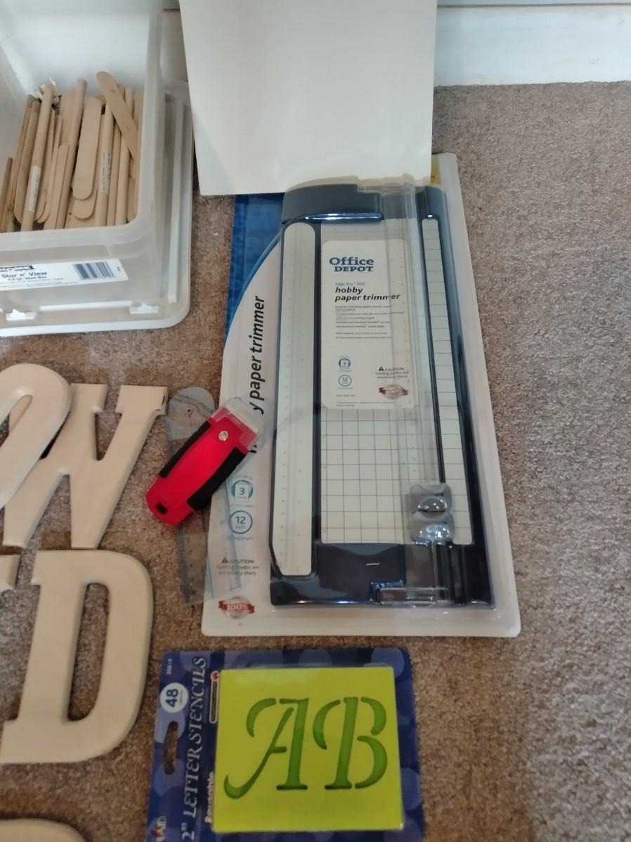 CRAFTING AND ART ITEMS, WOODEN LETTERS, STENCILS, SCISSORS, PAPER CUTTER, APRON, GLUE GUN, AND SO MUCH MORE!