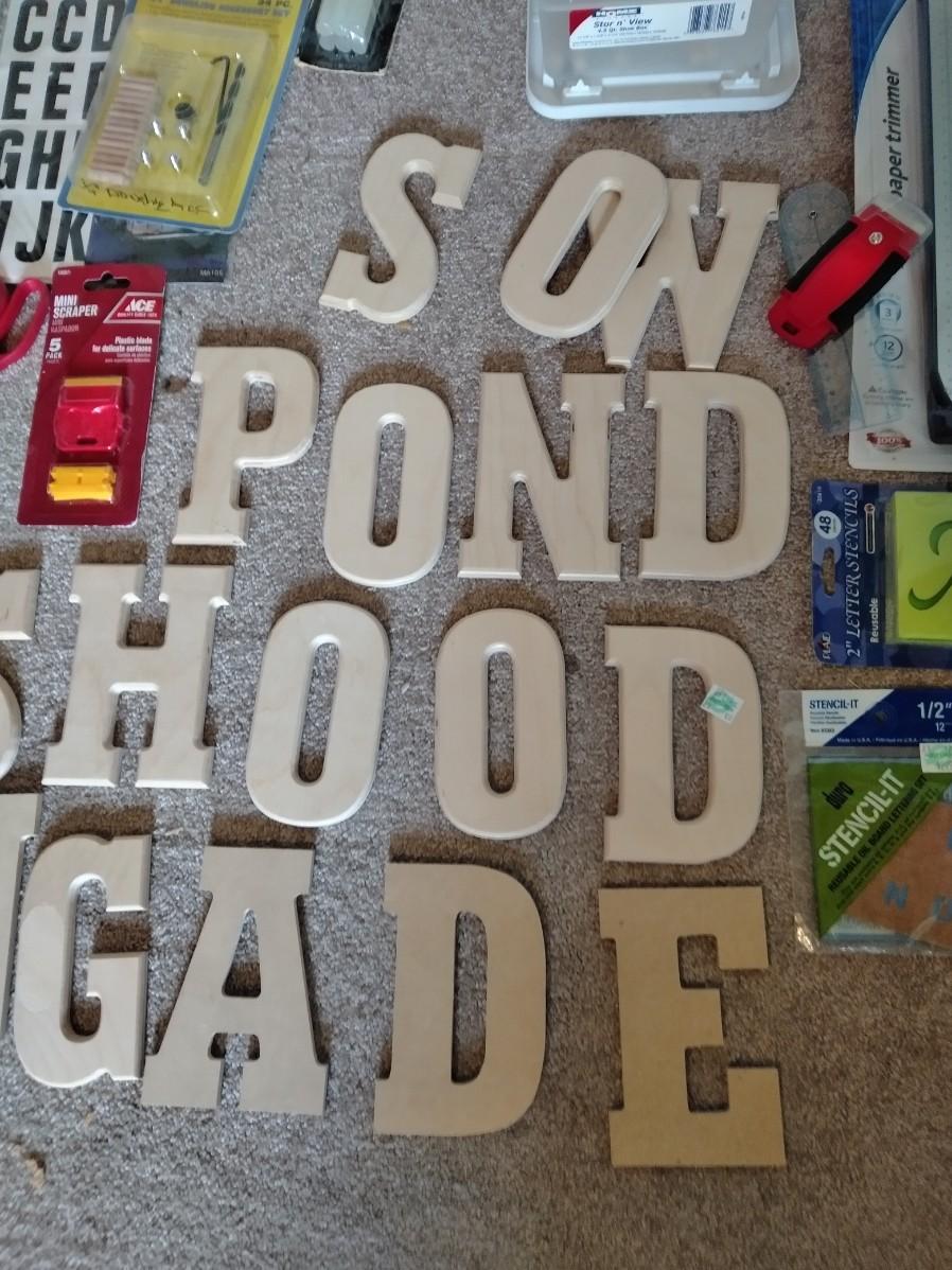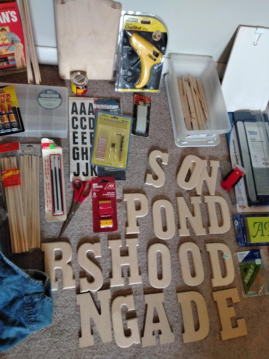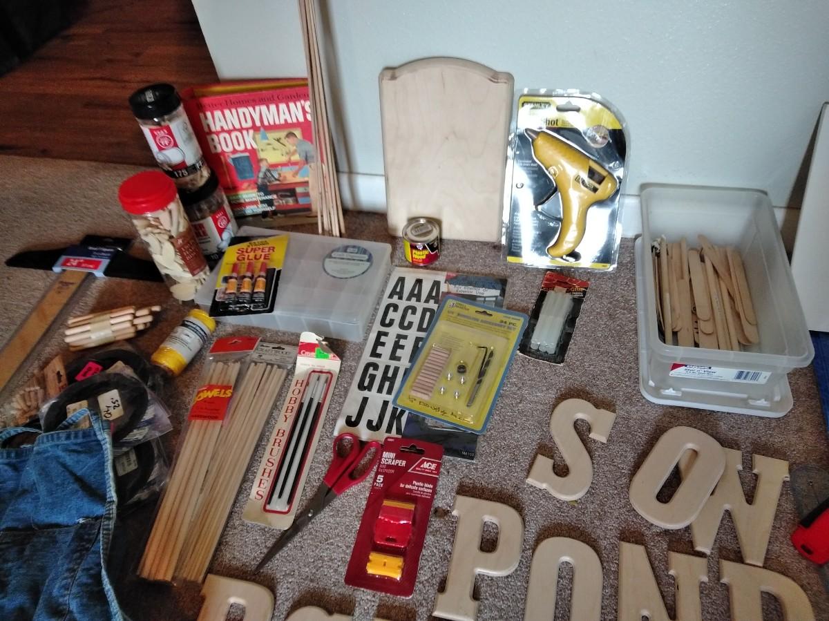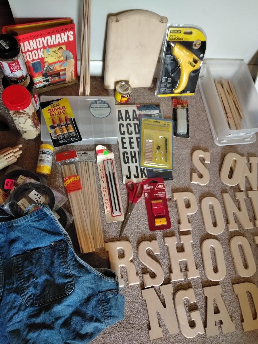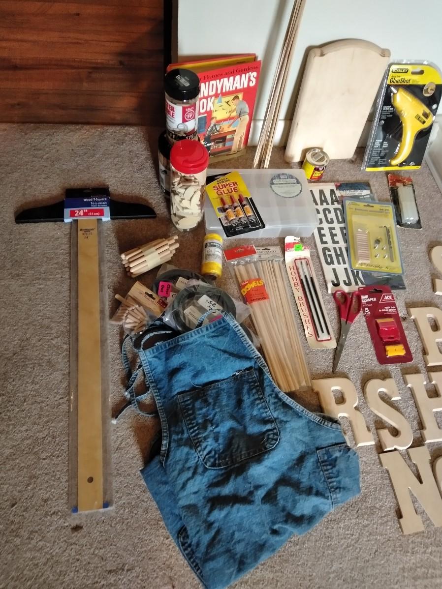 CRAFTING AND ART ITEMS, WOODEN LETTERS, STENCILS, SCISSORS, PAPER CUTTER, APRON, GLUE GUN, AND SO MUCH MORE!