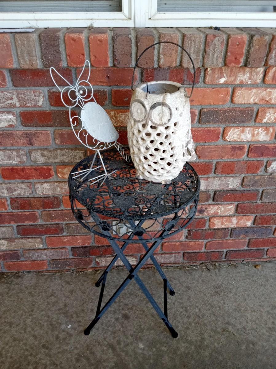 LOT 305 FOLDING METAL SIDE TABLE, OWL LANTERN AND METAL OWL (OB)