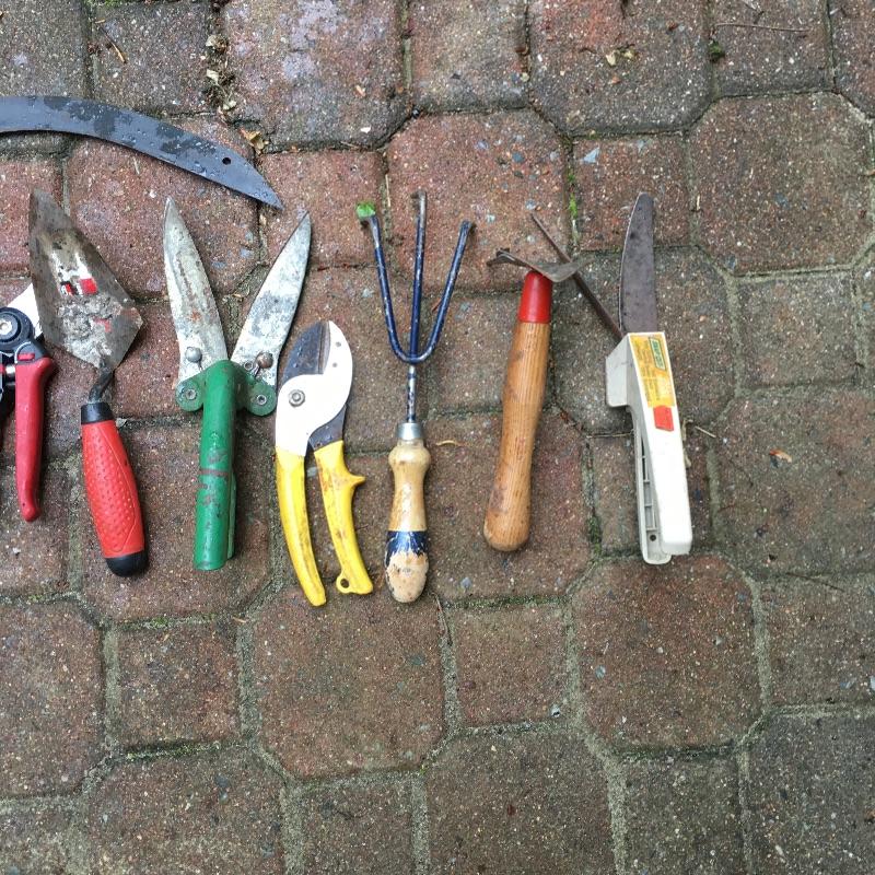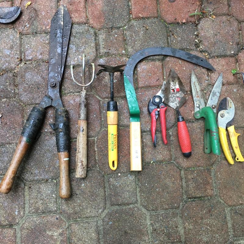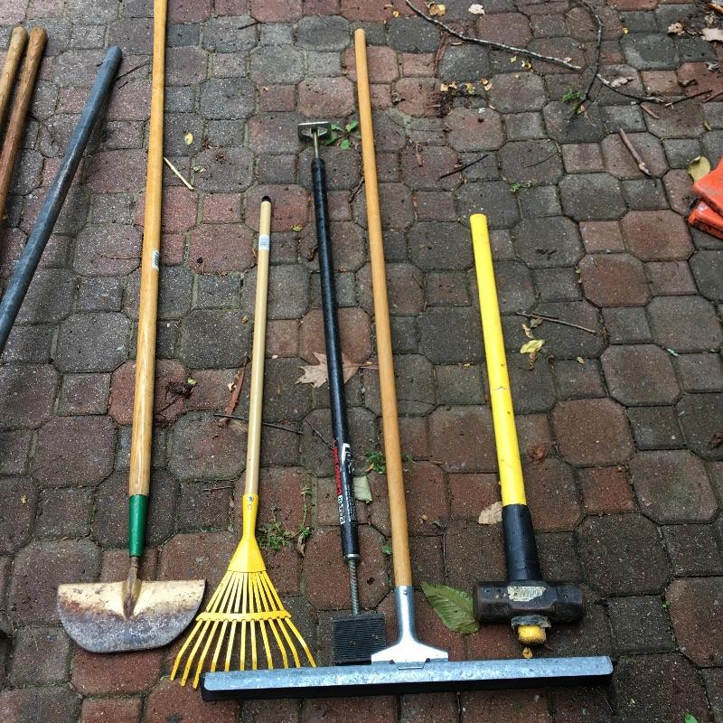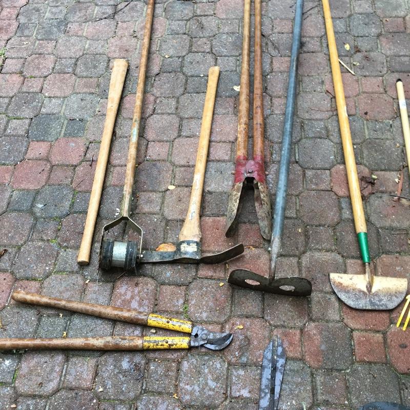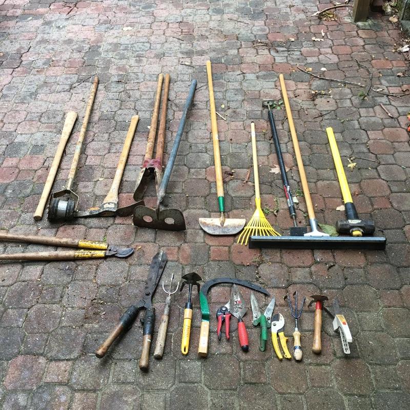 Garden tools to help you keep up with the Jones’s. Lot includes hoe, pickax, sledge hammer, loppers, post hole diggers, squeegee, Hand forks, shears, scythe, push tiller and more.