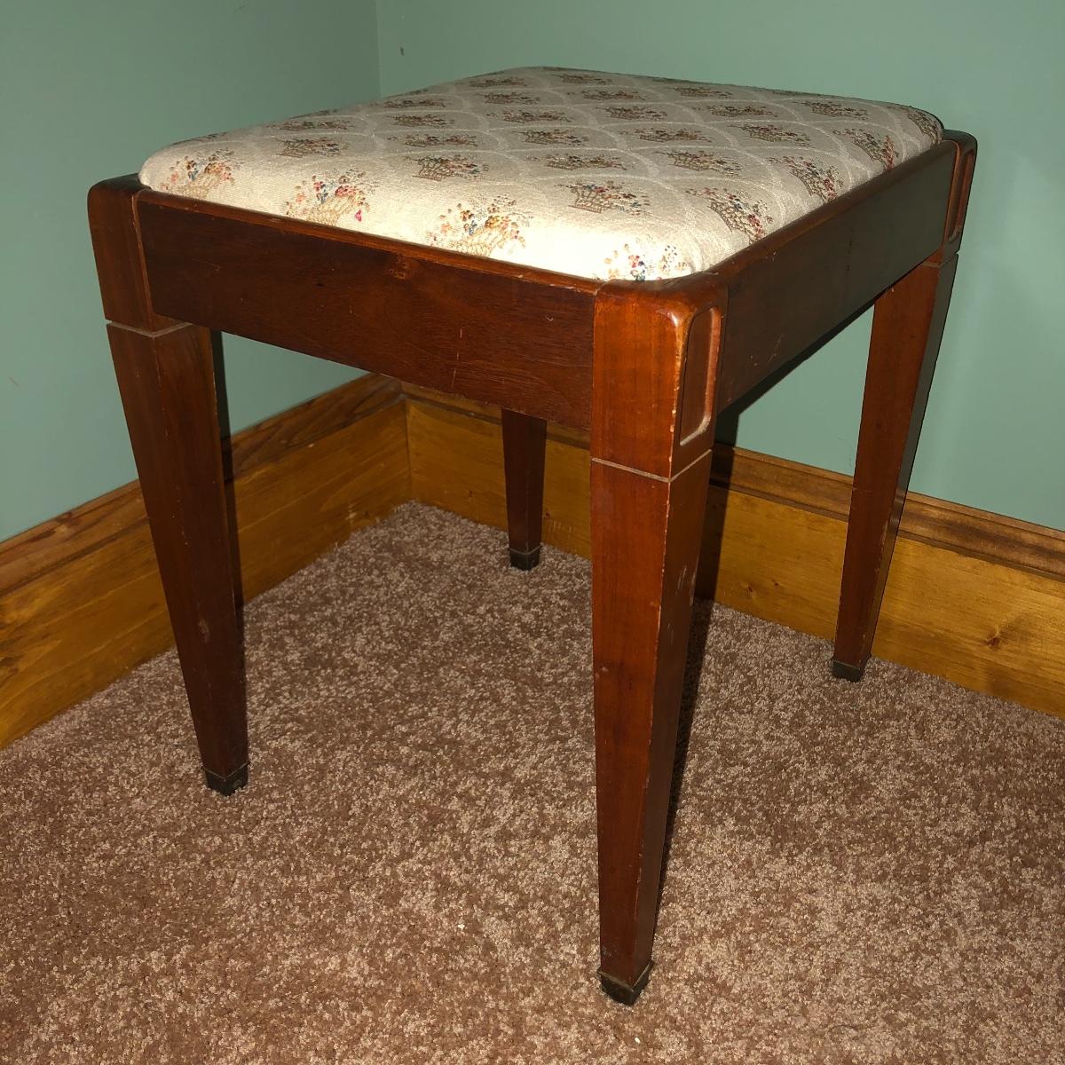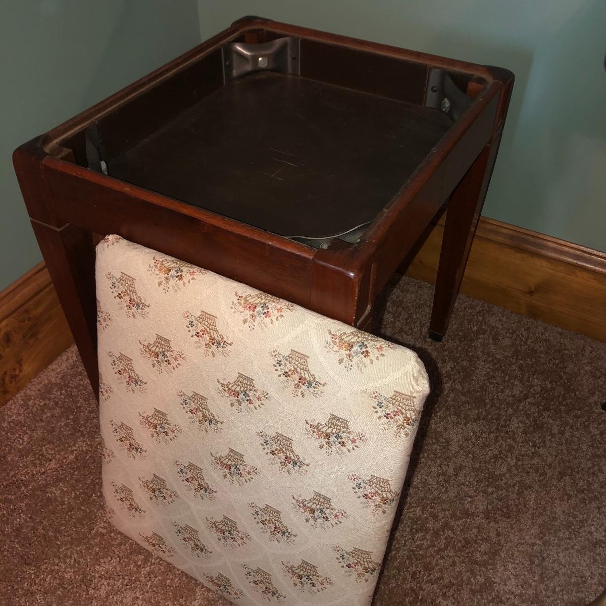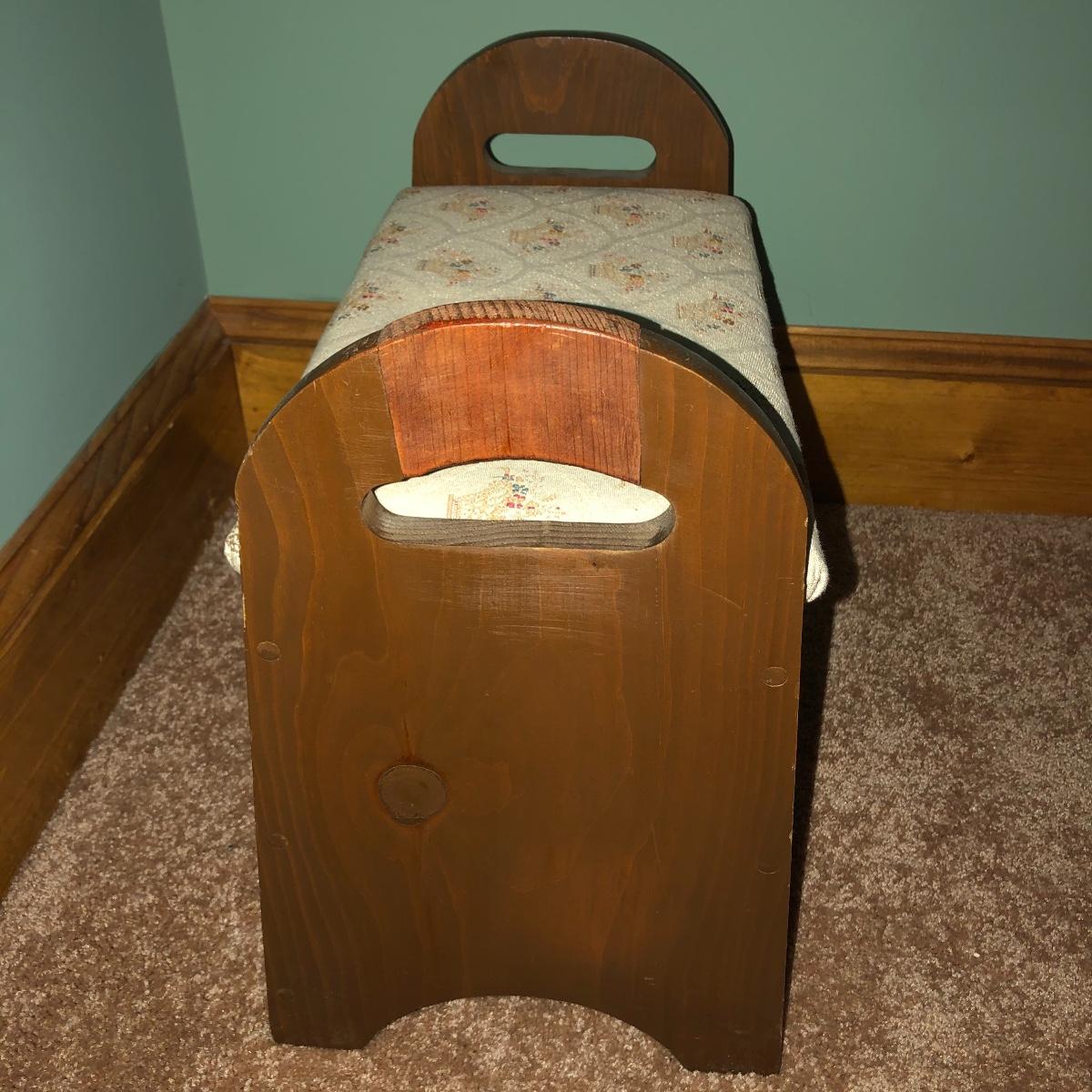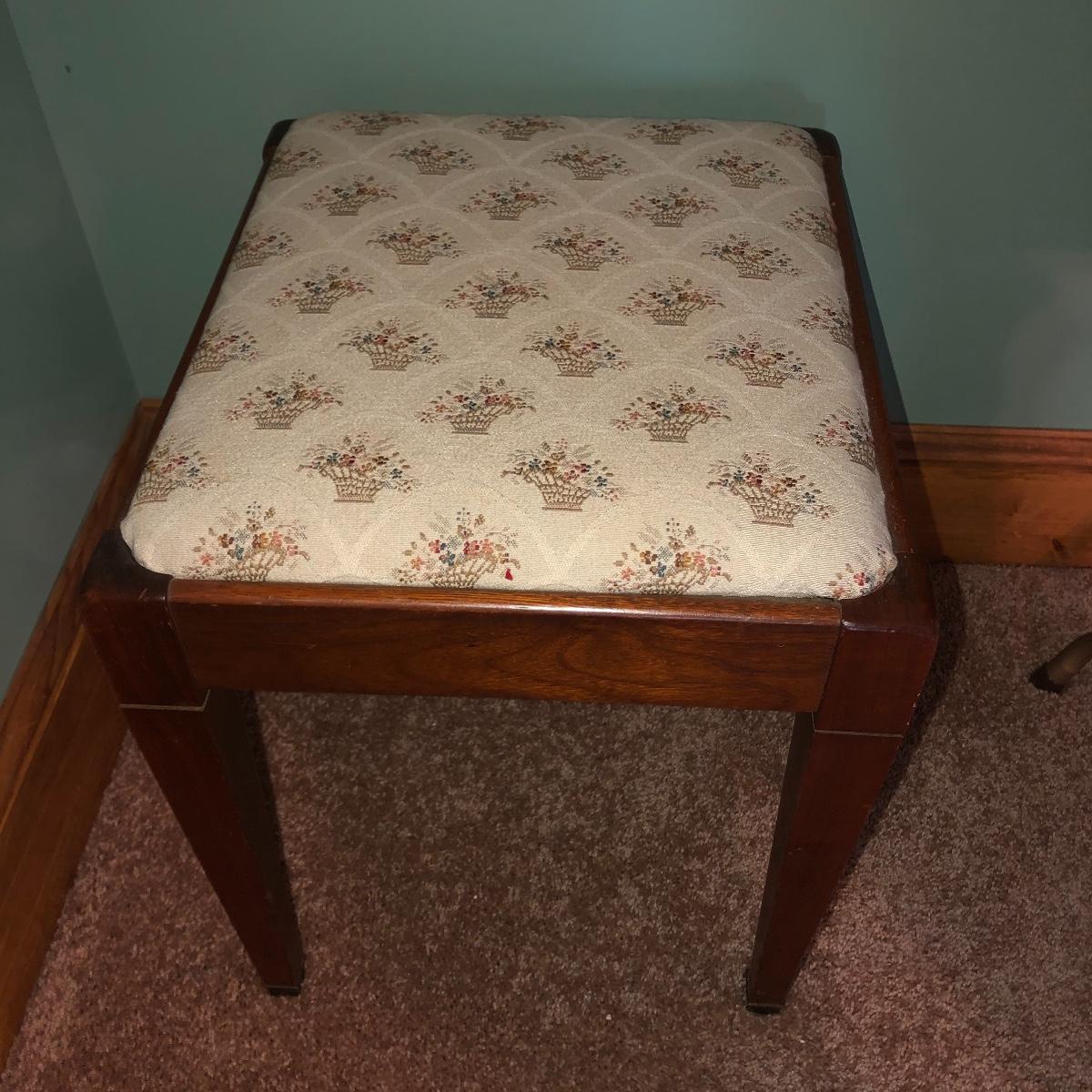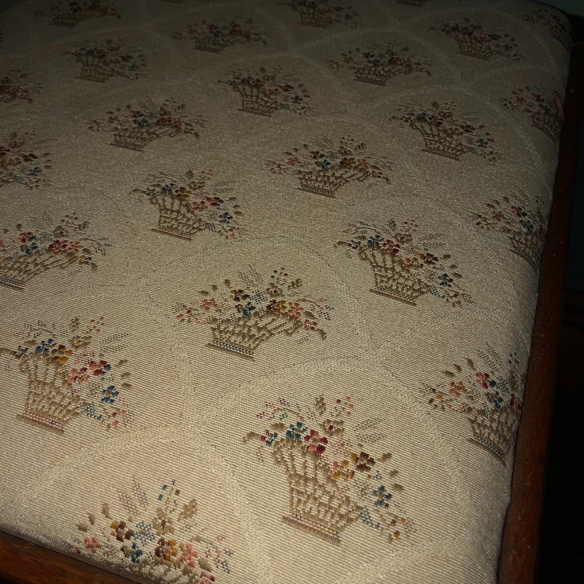 Looking to upgrade your craft space? This trio of sewing furniture might be just what you need. The sewing table in this lot is 42” x 20” x 27” in its flat-surface position, one half of the table can be lifted to create a two-leveled workspace. It has metal legs that are retractable for portability. Also included is a wooden sewing stool with a removable top for small item storage. It has beige upholstery with imagery of flowers in baskets. With matching upholstery, there is a small darker wood seat with handles on either side. Elevate your sewing and crafting with a new sewing table and seating to keep you comfortable while you work.