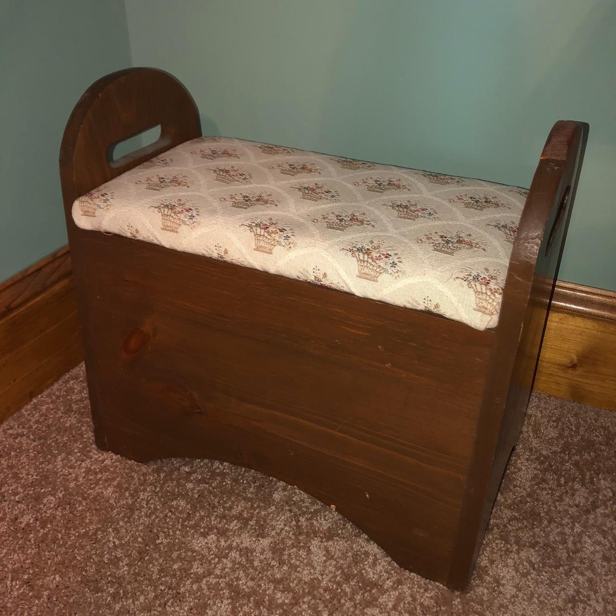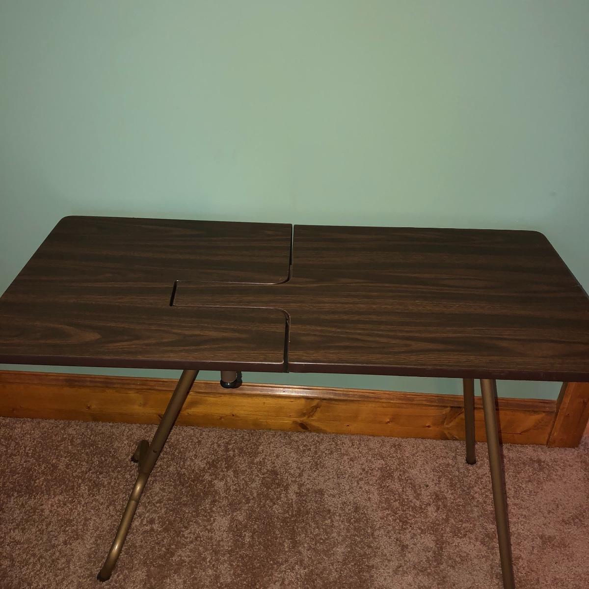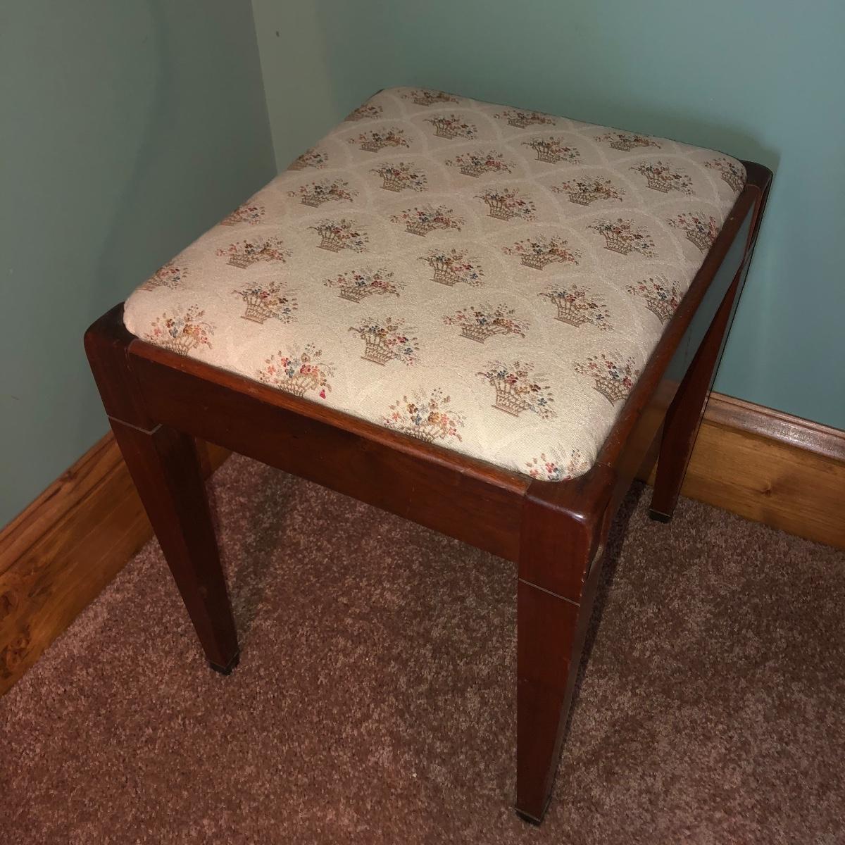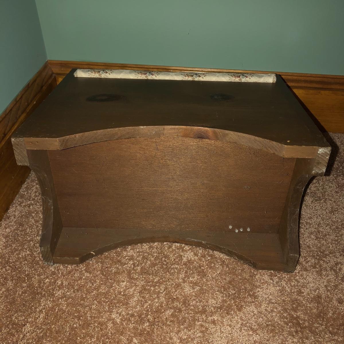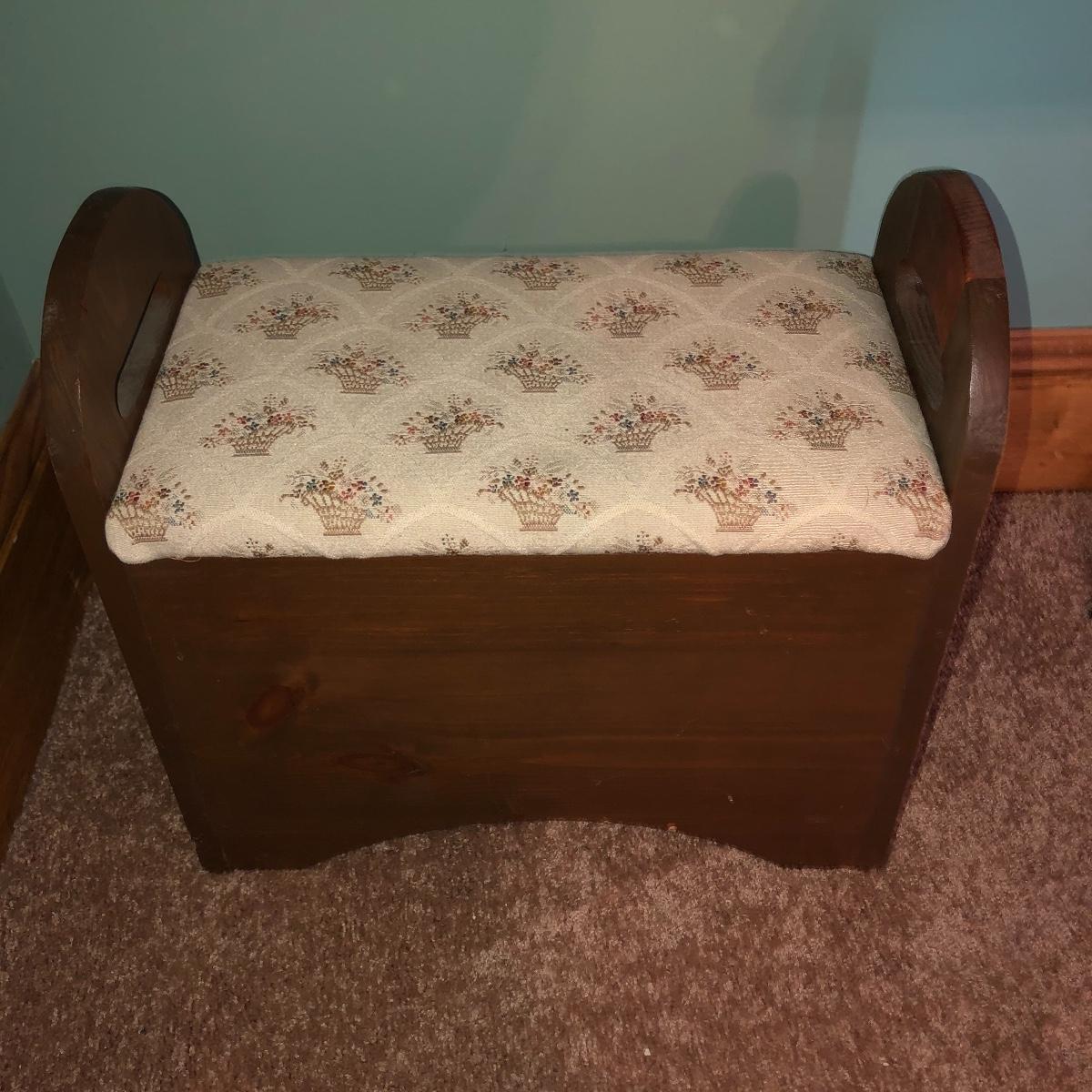 Looking to upgrade your craft space? This trio of sewing furniture might be just what you need. The sewing table in this lot is 42” x 20” x 27” in its flat-surface position, one half of the table can be lifted to create a two-leveled workspace. It has metal legs that are retractable for portability. Also included is a wooden sewing stool with a removable top for small item storage. It has beige upholstery with imagery of flowers in baskets. With matching upholstery, there is a small darker wood seat with handles on either side. Elevate your sewing and crafting with a new sewing table and seating to keep you comfortable while you work.