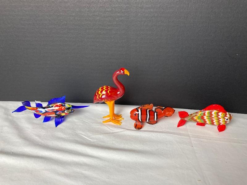 Fitz and Floyd Glass Menagerie Art Glass Sculptures. Orange Tail Fish, Swordfish, Clown Fish and Flamingo. All items are formed by hand, mouth blown and come in original boxes