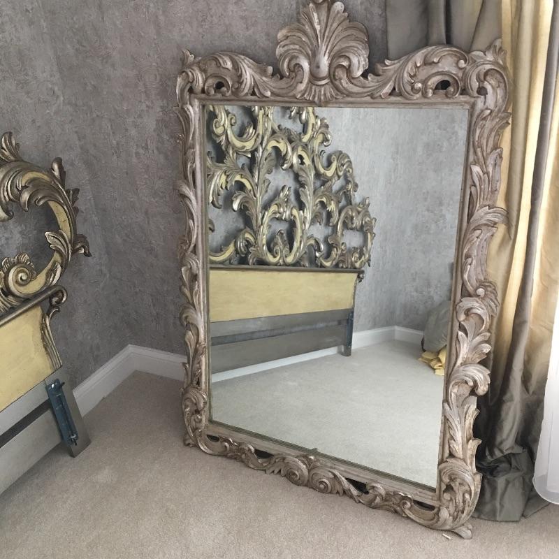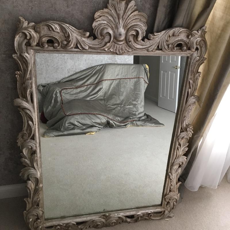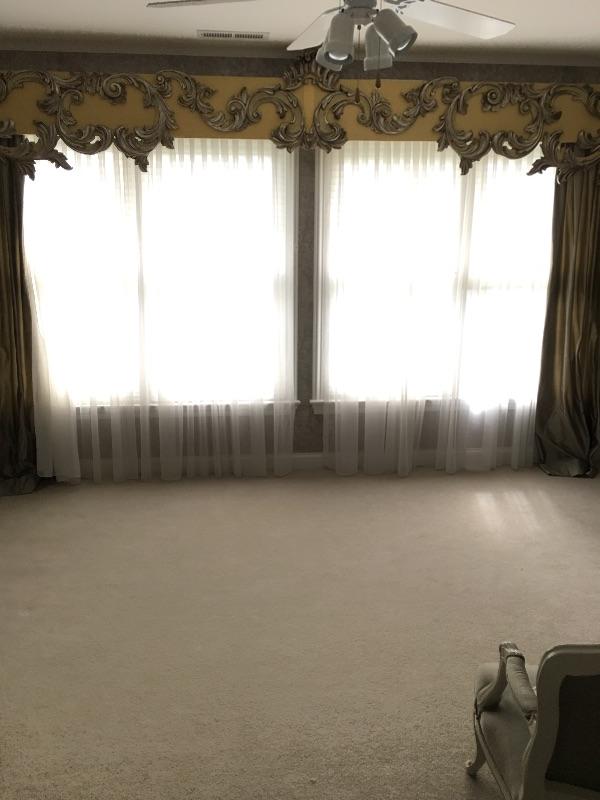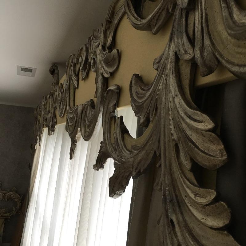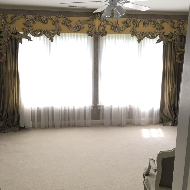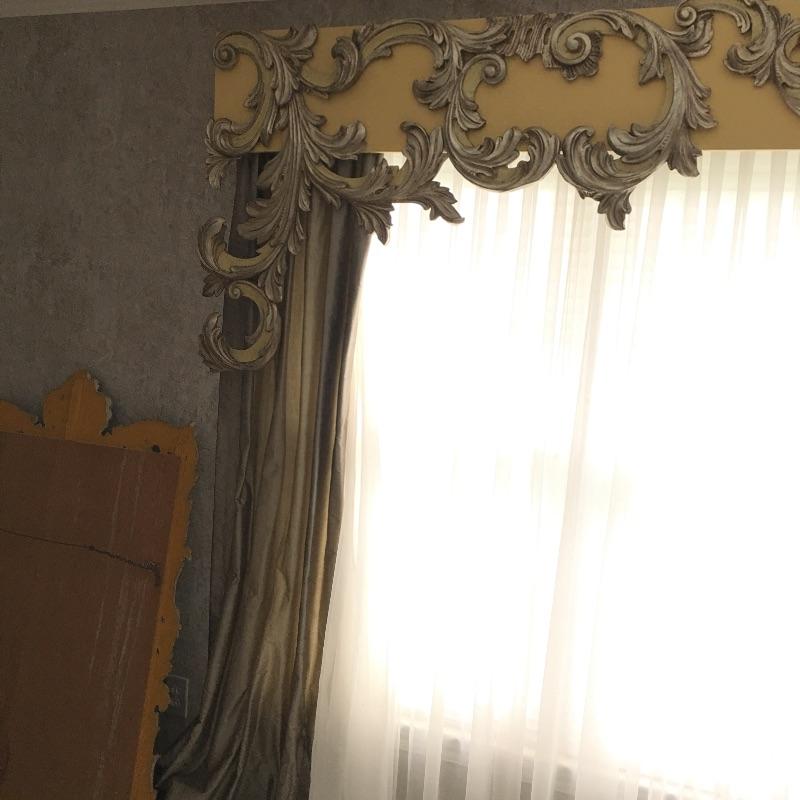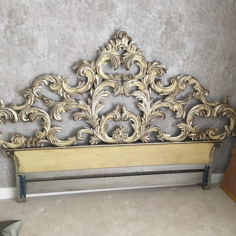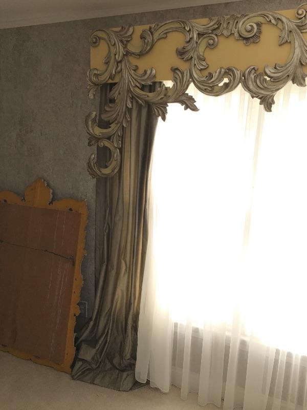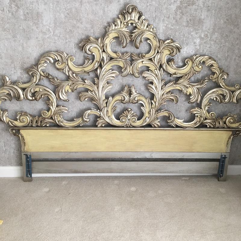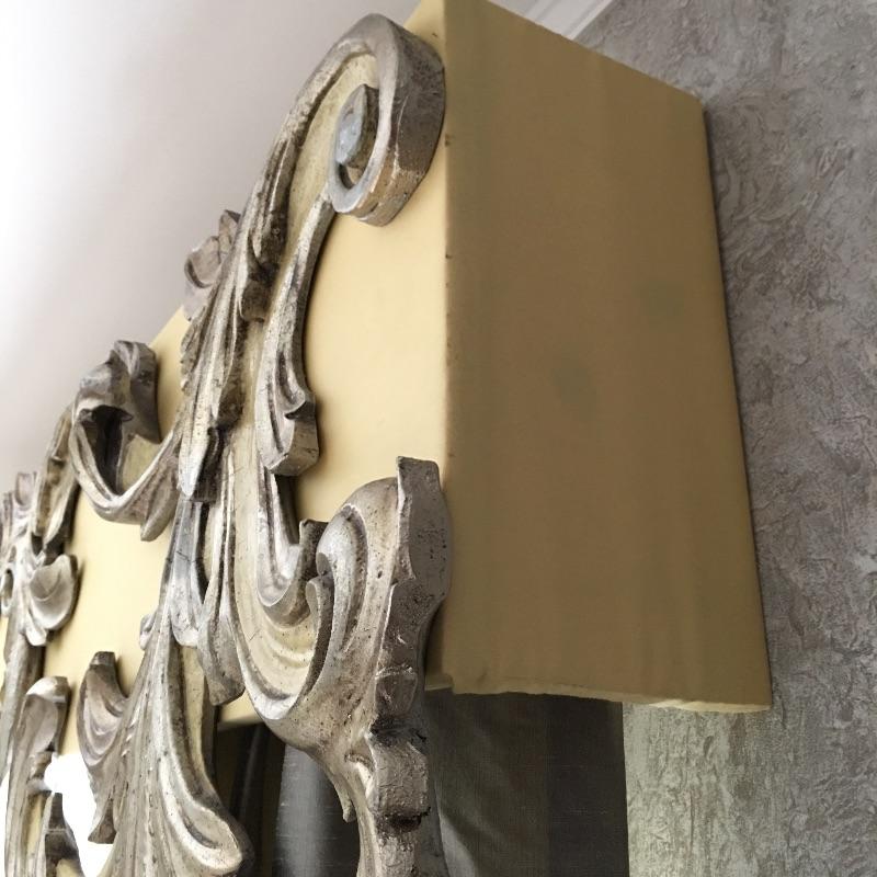 Truly unique and stunning these gorgeous bedroom furnishings are a set. The king headboard and cornice board have the same design and they come with a mirror and curtains. A truly grand headboard, mirror and cornice board to make you bedroom that extra bit special. Headboard measures 106” x 66”. Mirror measures 36” x 54”. Cornice board measures 7.5” x 156” x 36”. Bring help items are heavy and located one flight up.