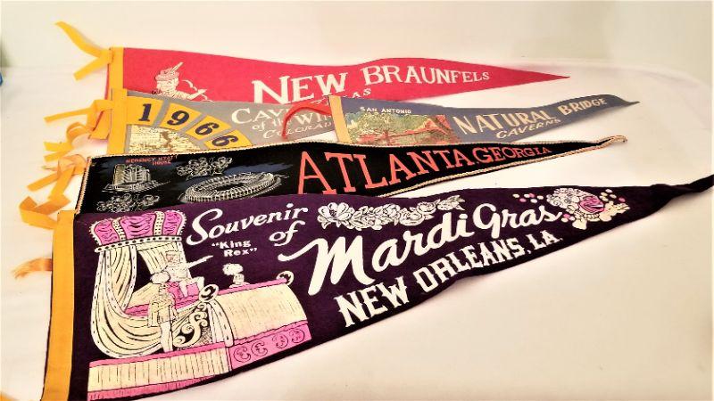 You get all you see here - vintage felt pennants from various places of interest - the Star is the Mardi Gras pennant - probably 1960's. Good vintage condition.