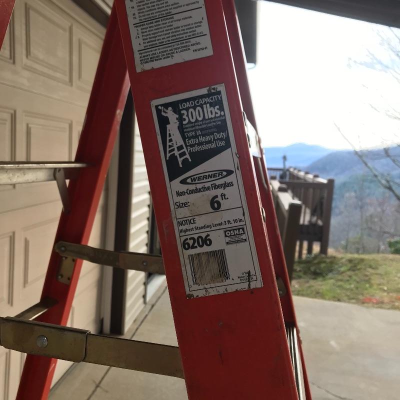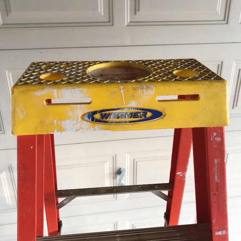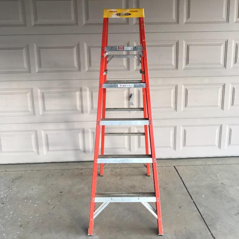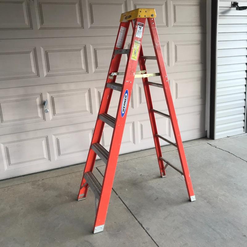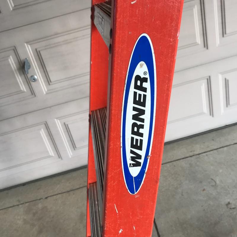 Sturdy Werner 6ft ladder. Label states “Non-Conductive Fiberglass”. Ladder has paint and some minor wear aesthetically, but it’s in great shape and will get the job done! Local pick up only.