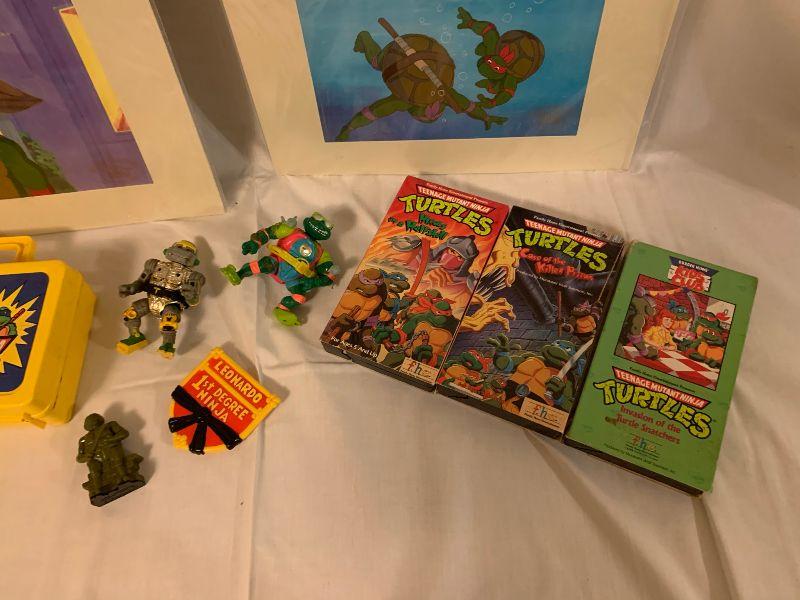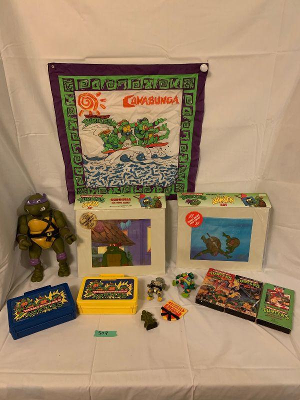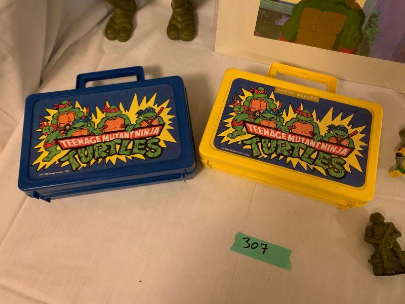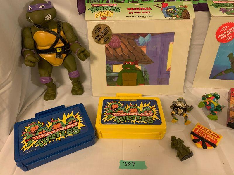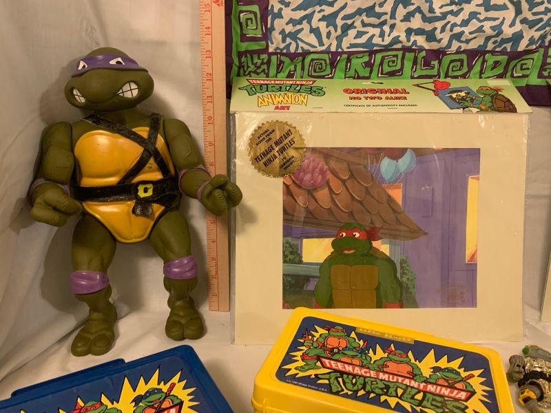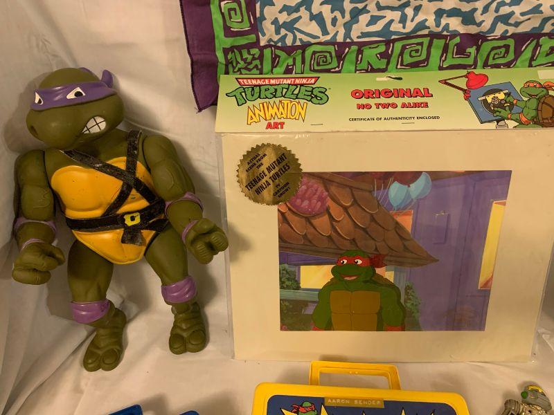 Teenage Mutant Ninja Turtles, large figurine, 2 plastic lunch boxes, 2 original animation 1 art no 2 are alike actual scenes