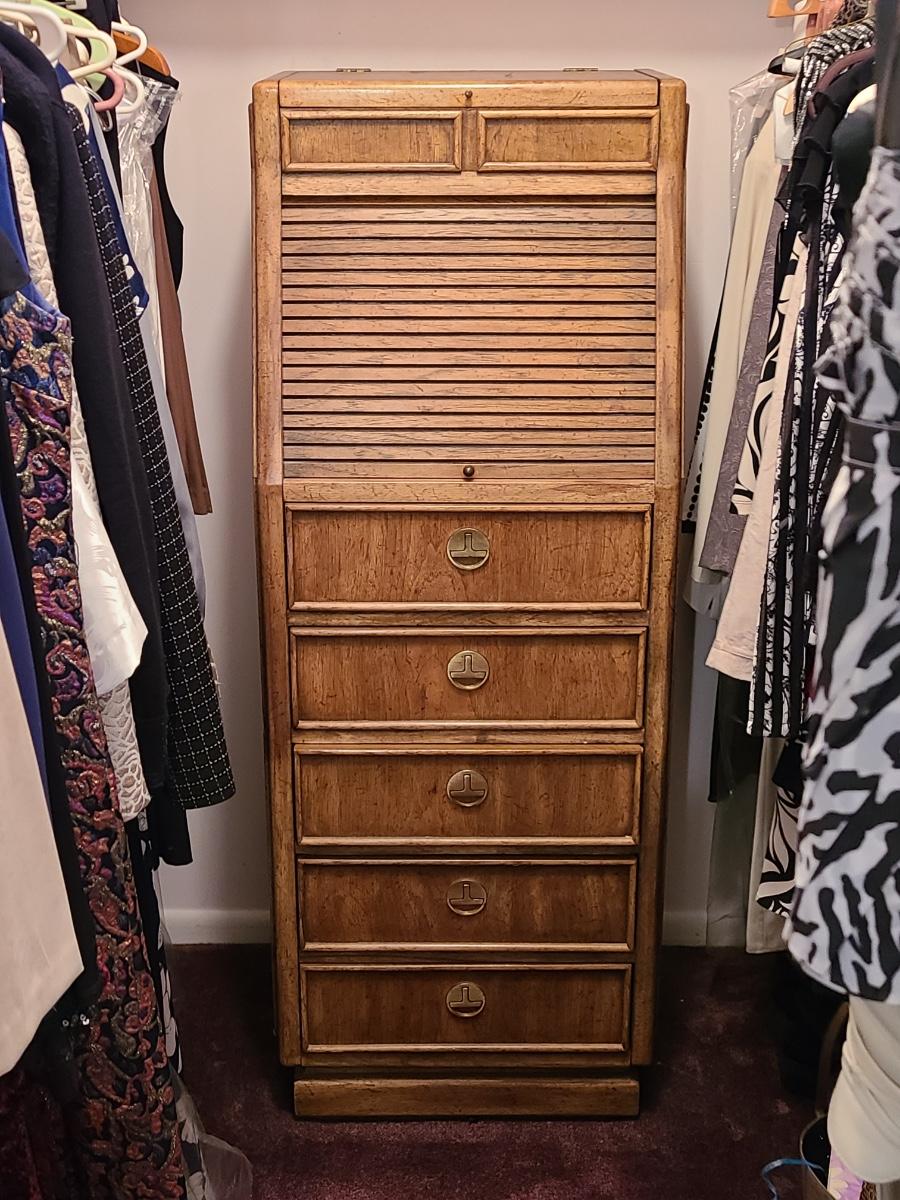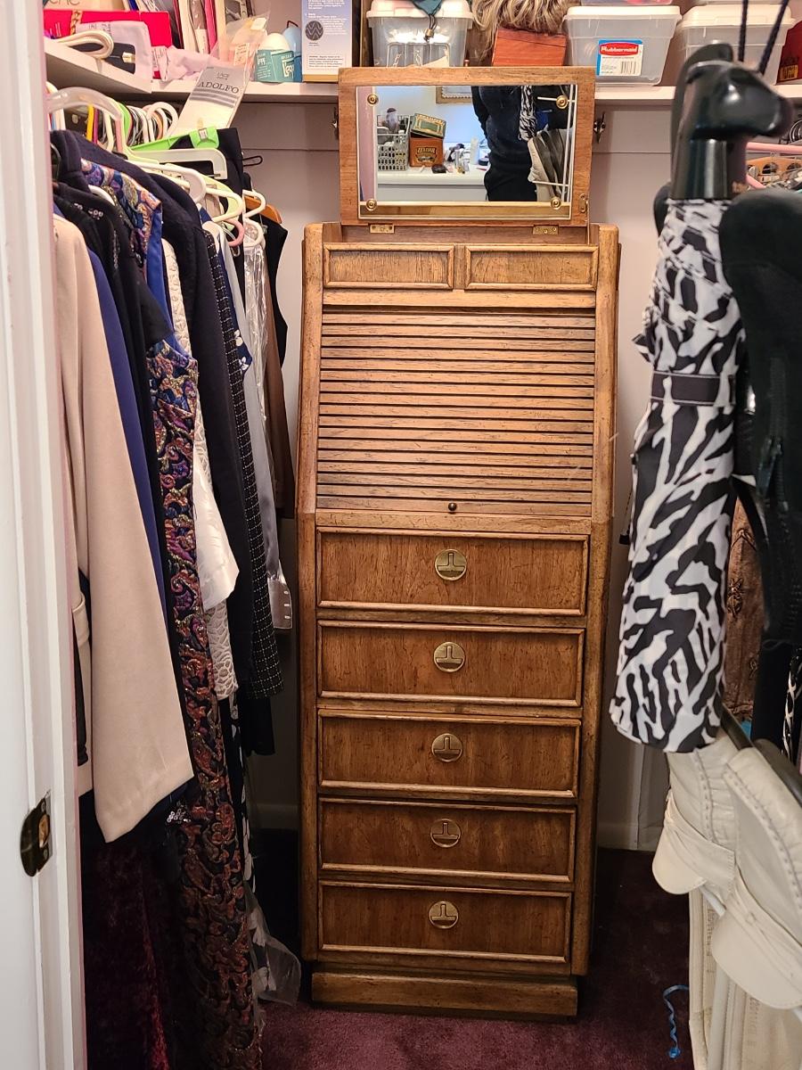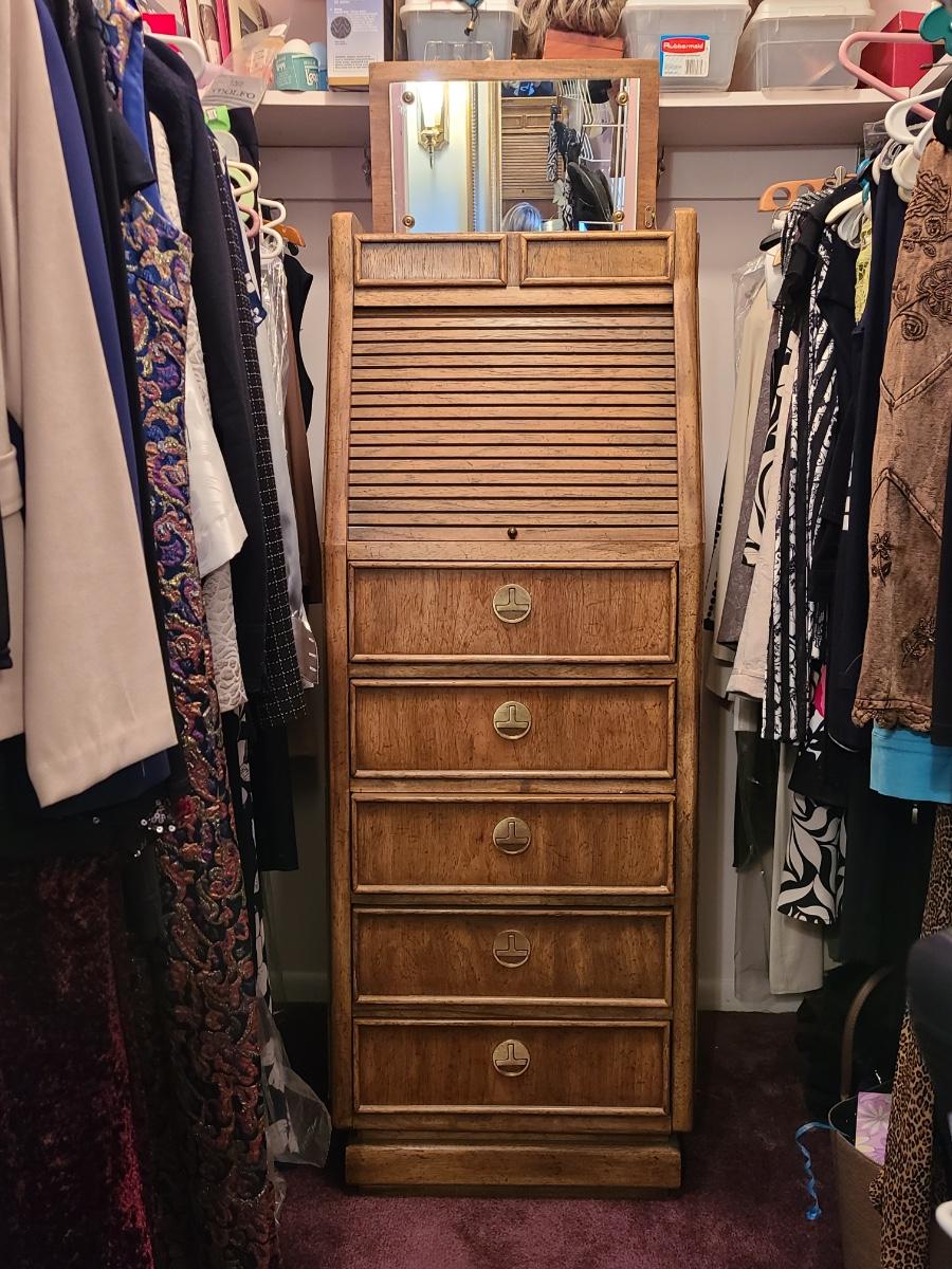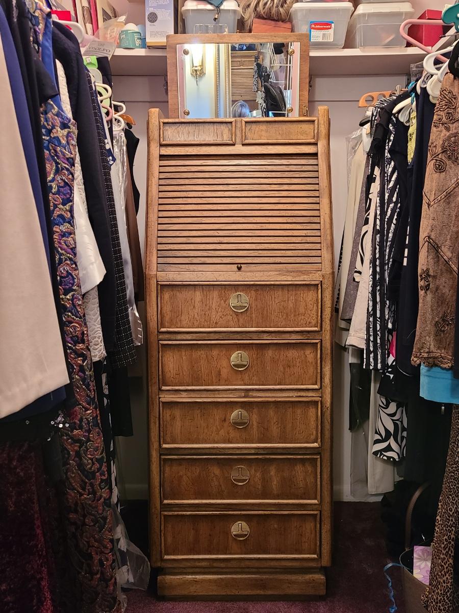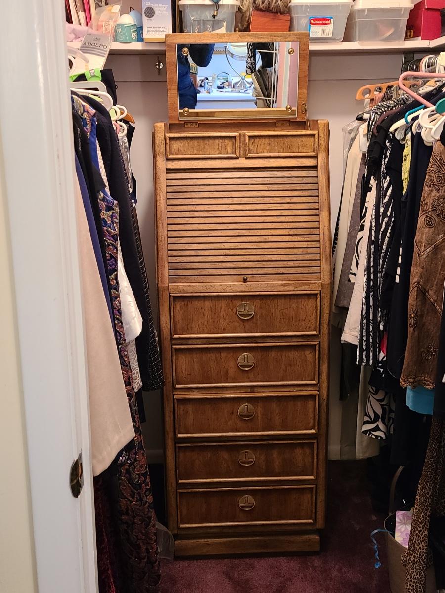 Items inside not included! This has a contemporary design to it, but also could be used in a home with Asian flair. This has brass hardware. There are petite drawers down the front for lingerie or jewelry, with a secretary style slide up front where larger accessories can be stored, and the top can be put up to display mirror and jewelry holder. Keep the lid down with a lamp on top, and you can secretly store items inside. Perfect for any room in the house. Would also be perfect as an entryway accent for gloves, scarves, and hats! This is located upstairs and you will need to bring help to move. Please see all pictures as they are the best representation of the items. The pictures show condition, measurements if taken, and what is included in the lot. Due to the large amount that we photograph and the time frame, we are not always able to take measurements. All items unless noted, are pre-owned and have been used. If you purchased furniture, you must bring help. We do not allow one person to carry large furniture out on their own. Bring help, tools and a truck for the safety of our client’s homes, and your personal safety. Company policy. Thank you.