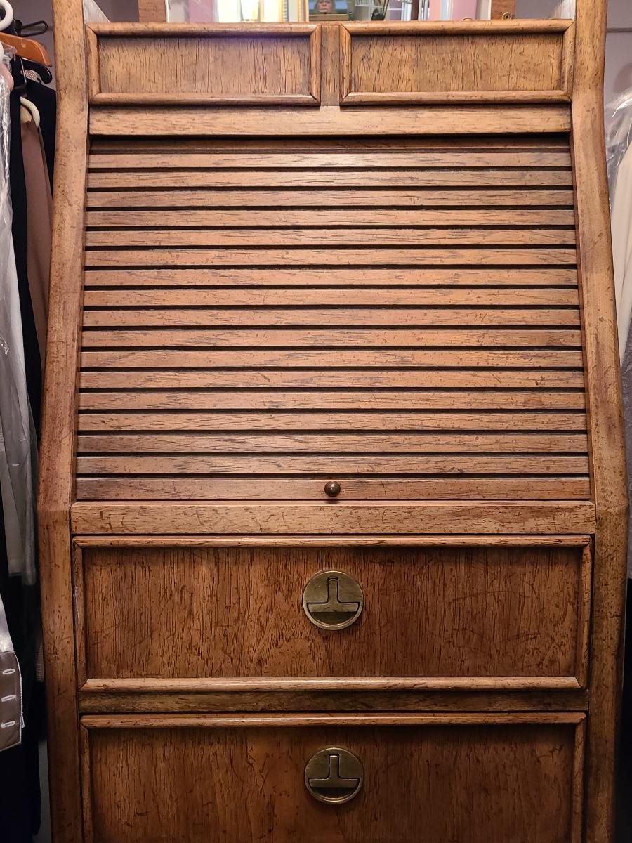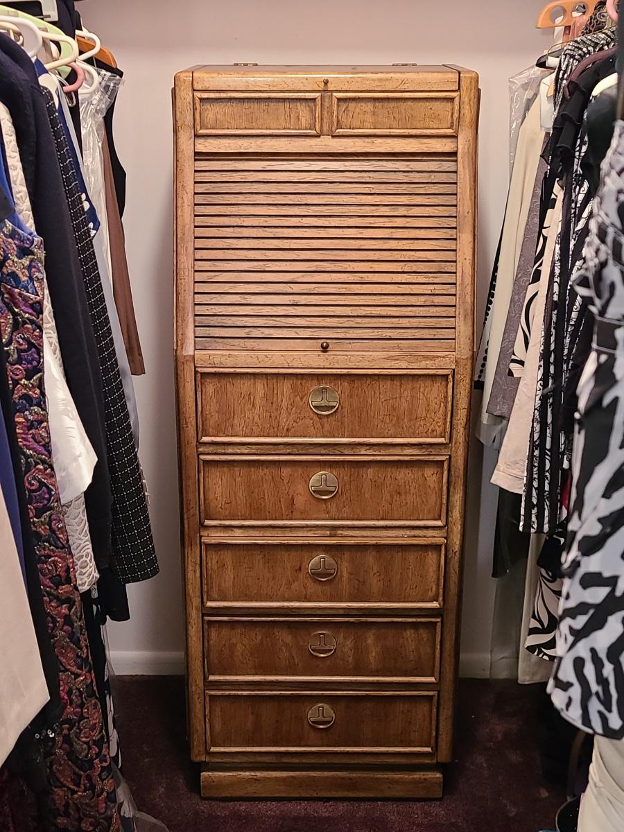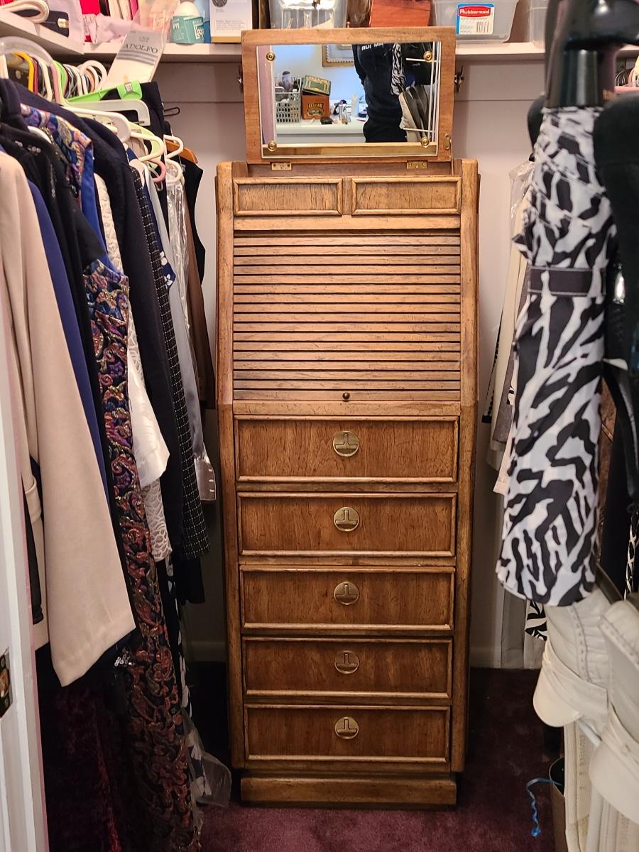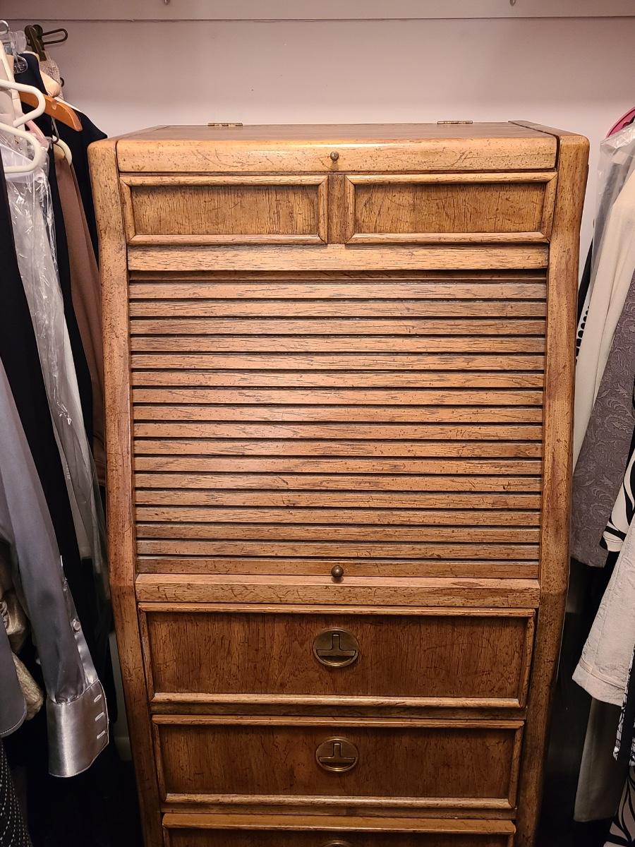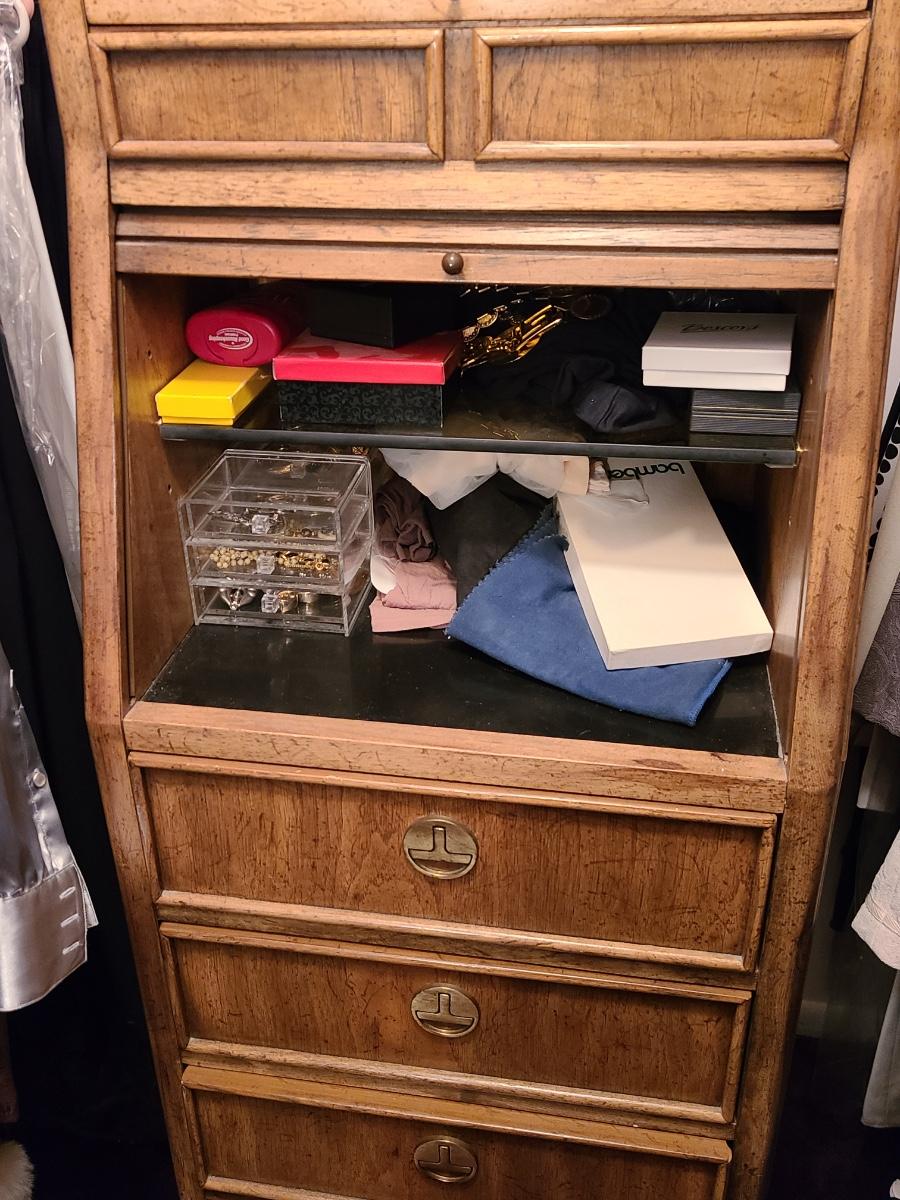 Items inside not included! This has a contemporary design to it, but also could be used in a home with Asian flair. This has brass hardware. There are petite drawers down the front for lingerie or jewelry, with a secretary style slide up front where larger accessories can be stored, and the top can be put up to display mirror and jewelry holder. Keep the lid down with a lamp on top, and you can secretly store items inside. Perfect for any room in the house. Would also be perfect as an entryway accent for gloves, scarves, and hats! This is located upstairs and you will need to bring help to move. Please see all pictures as they are the best representation of the items. The pictures show condition, measurements if taken, and what is included in the lot. Due to the large amount that we photograph and the time frame, we are not always able to take measurements. All items unless noted, are pre-owned and have been used. If you purchased furniture, you must bring help. We do not allow one person to carry large furniture out on their own. Bring help, tools and a truck for the safety of our client’s homes, and your personal safety. Company policy. Thank you.