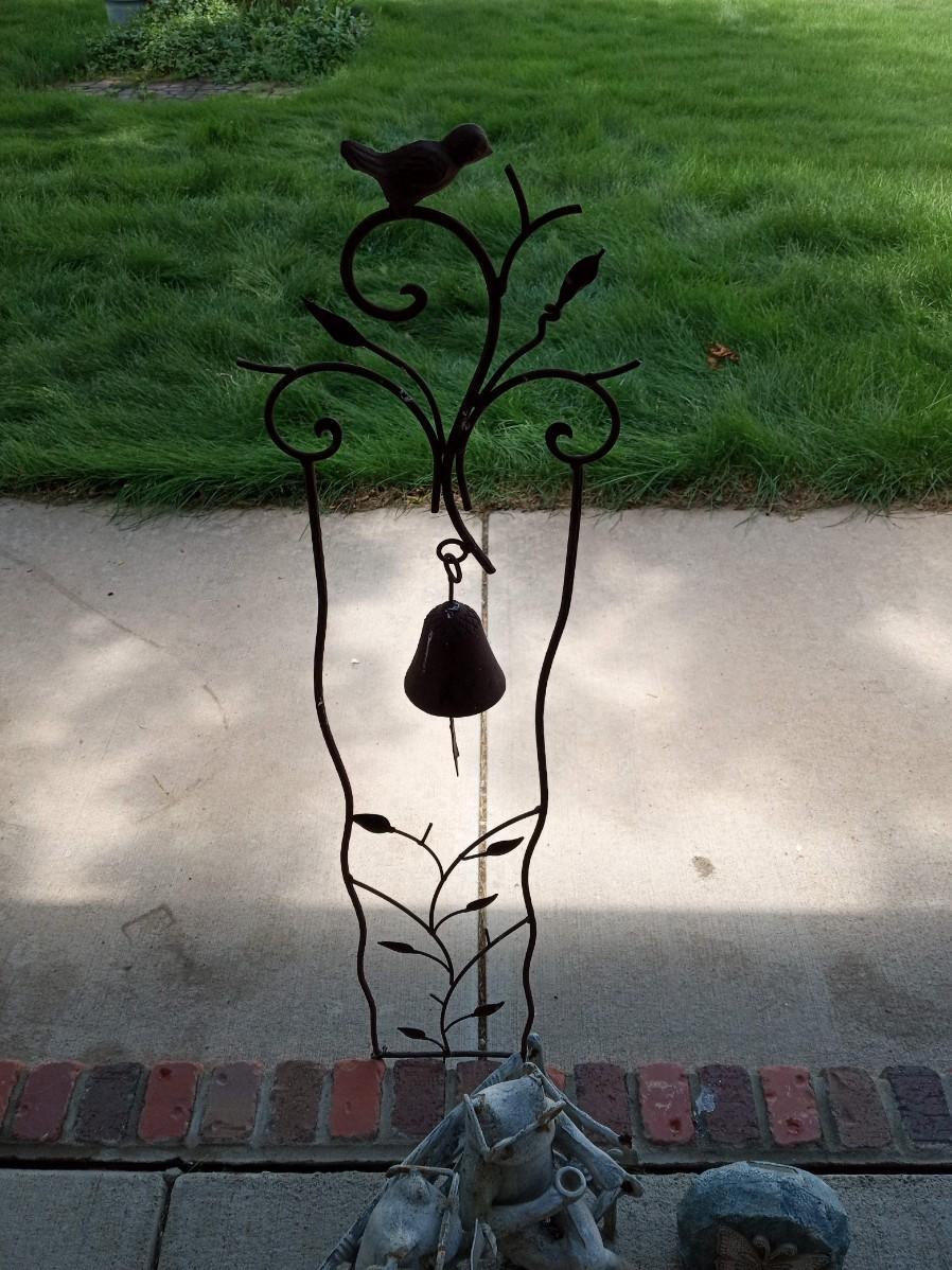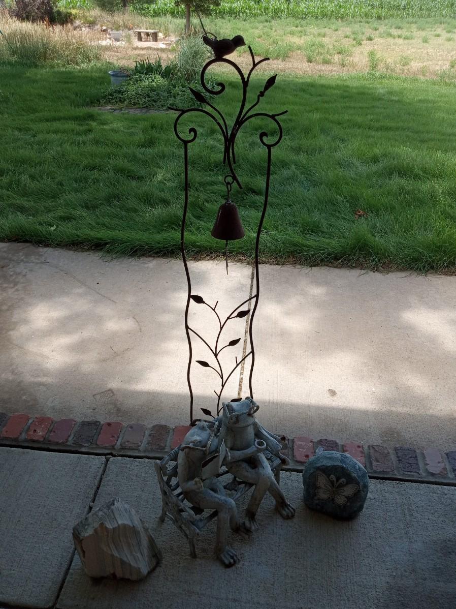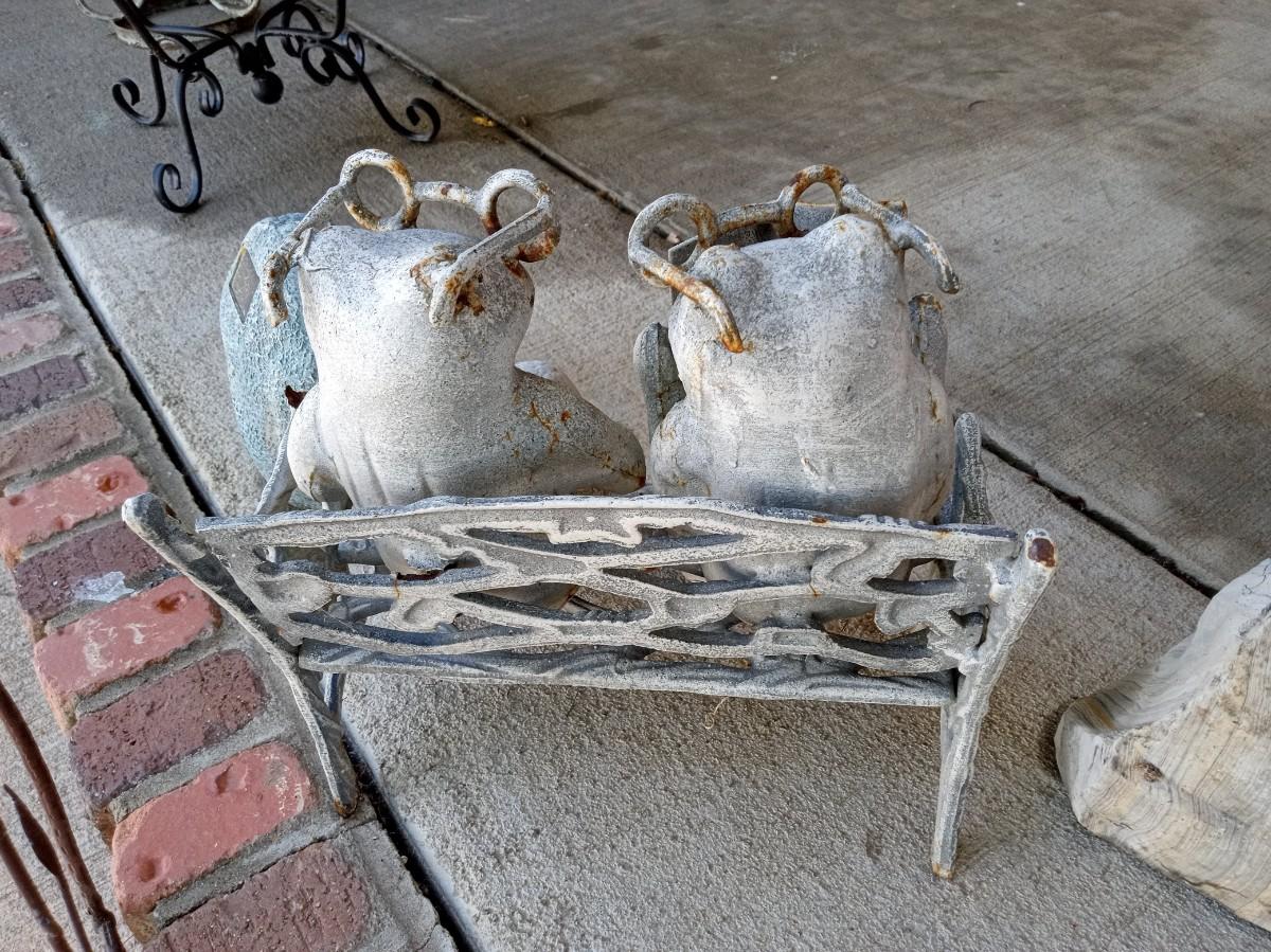 LOT 307 CAST IRON FROGS ON A BENCH, STAKED YARD DECOR WITH A BELL AND MORE (OB)