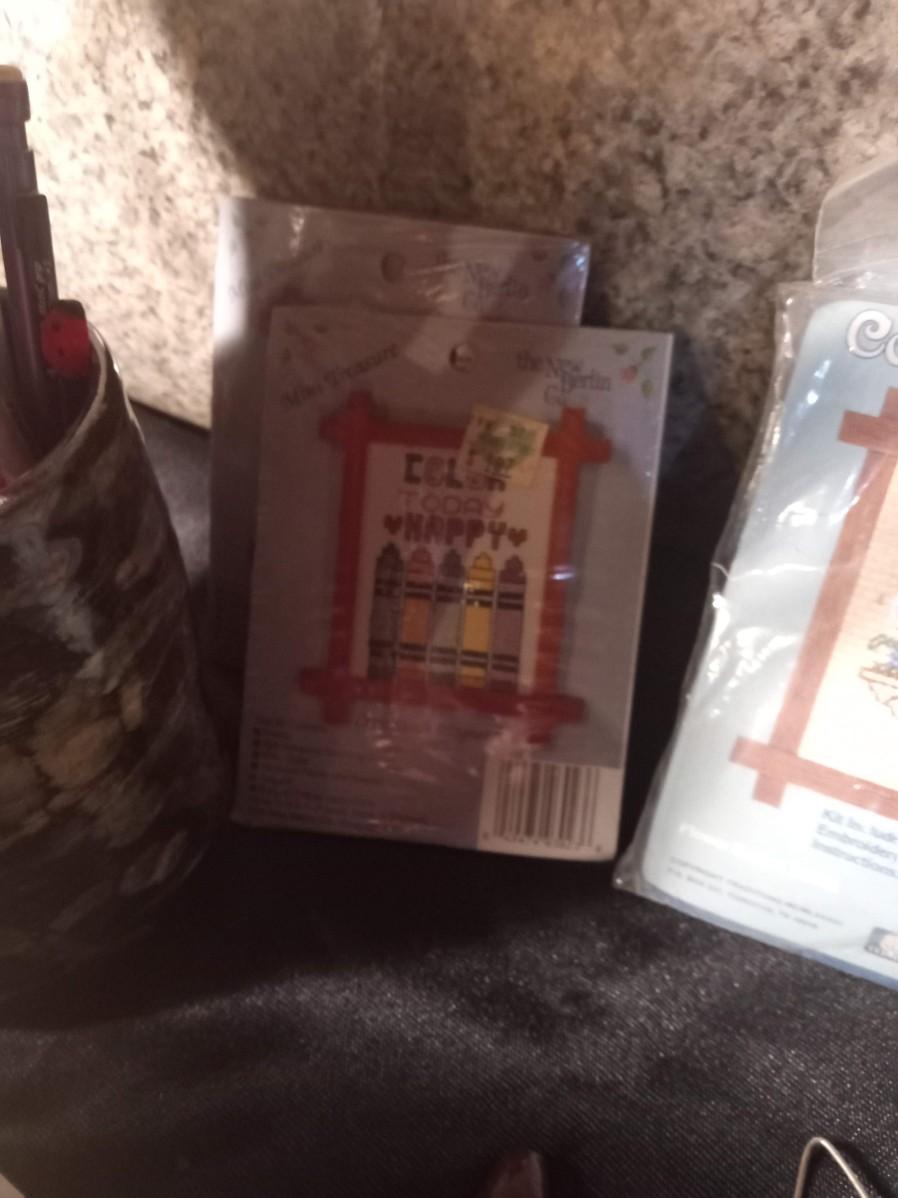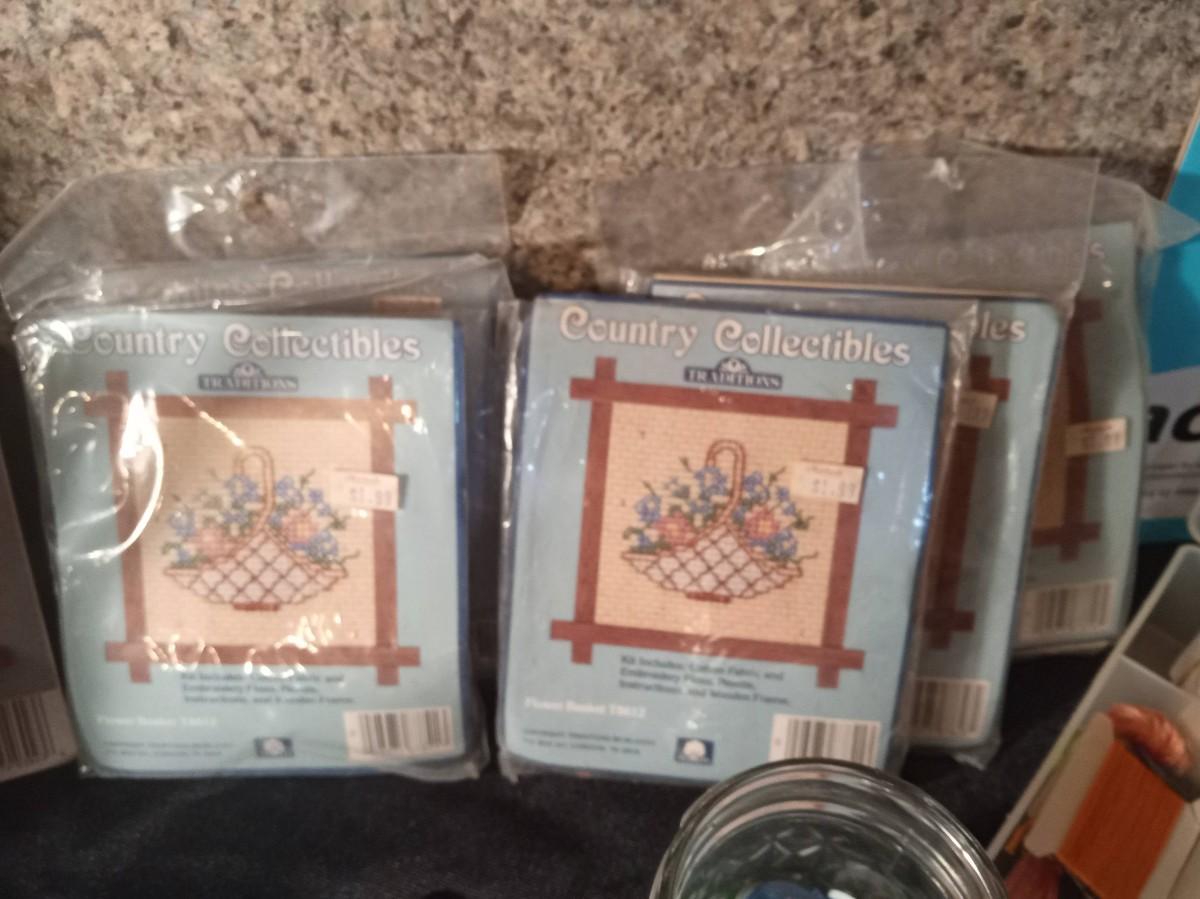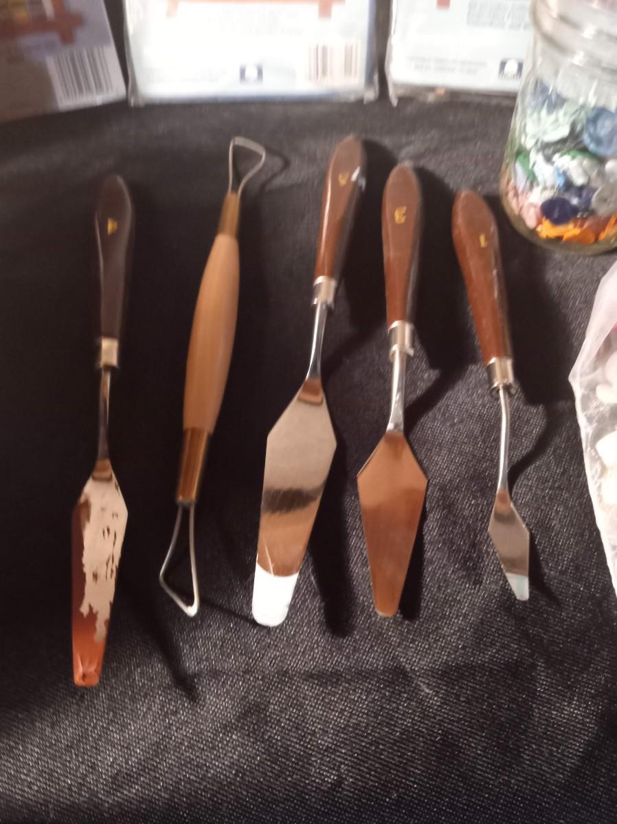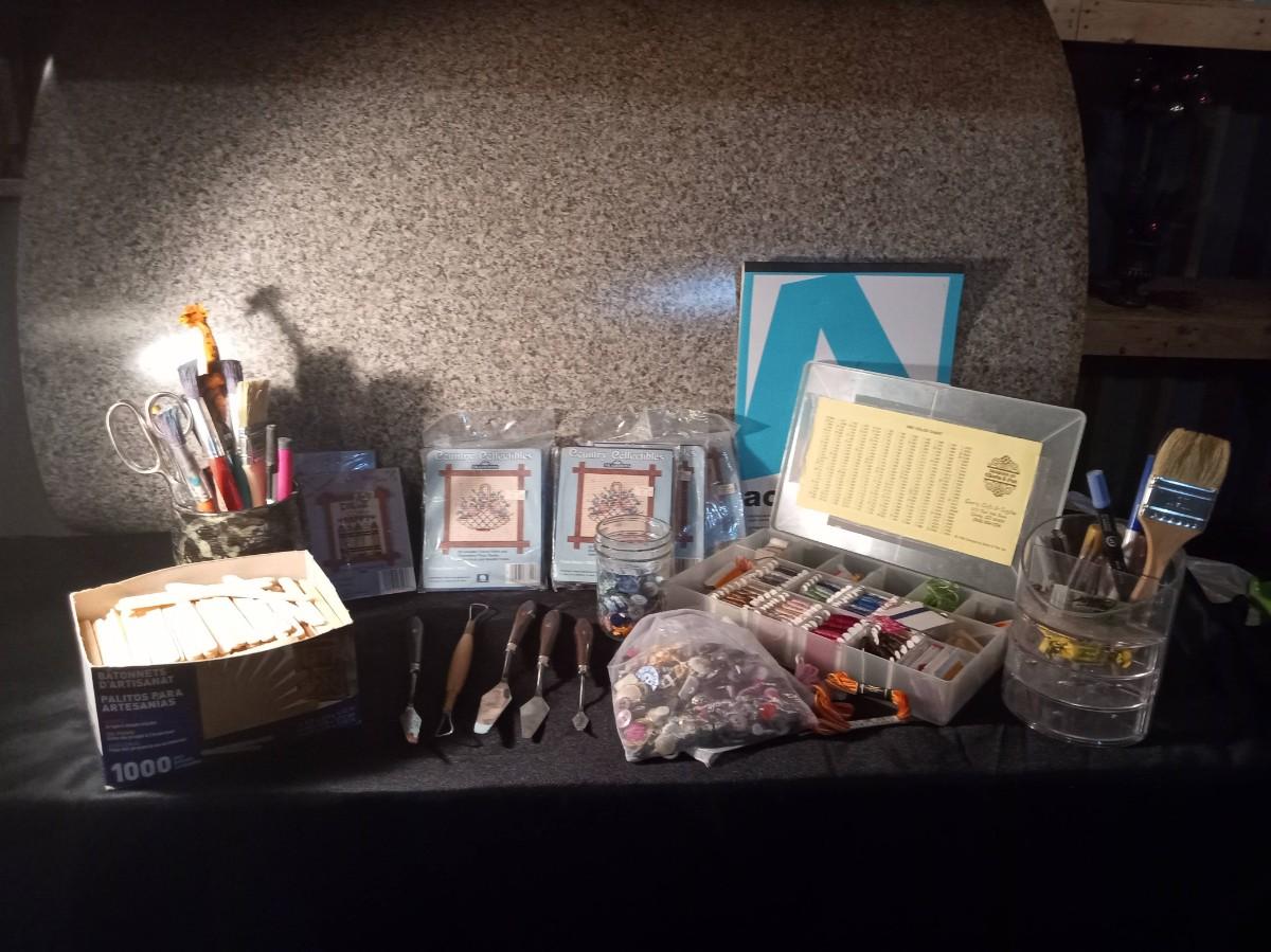 SMALL NEEDLEPOINT KITS, EMBROIDERY THREAD, POTTERY TOOLS, PAINT BRUSHES, WOODEN STICKS AND MORE