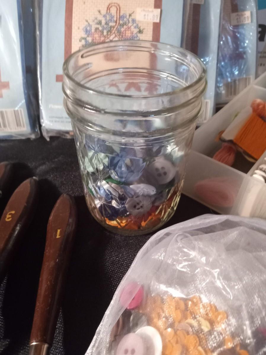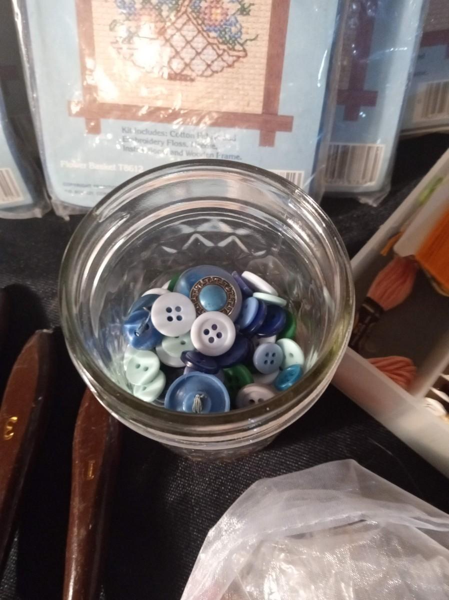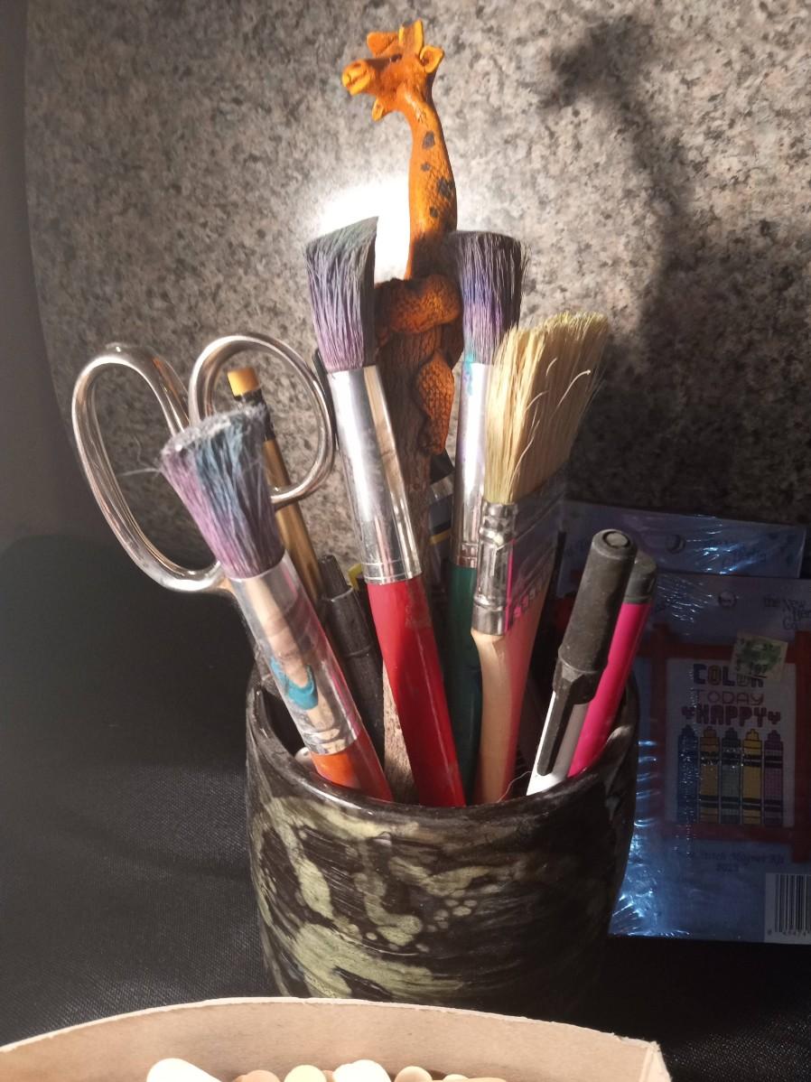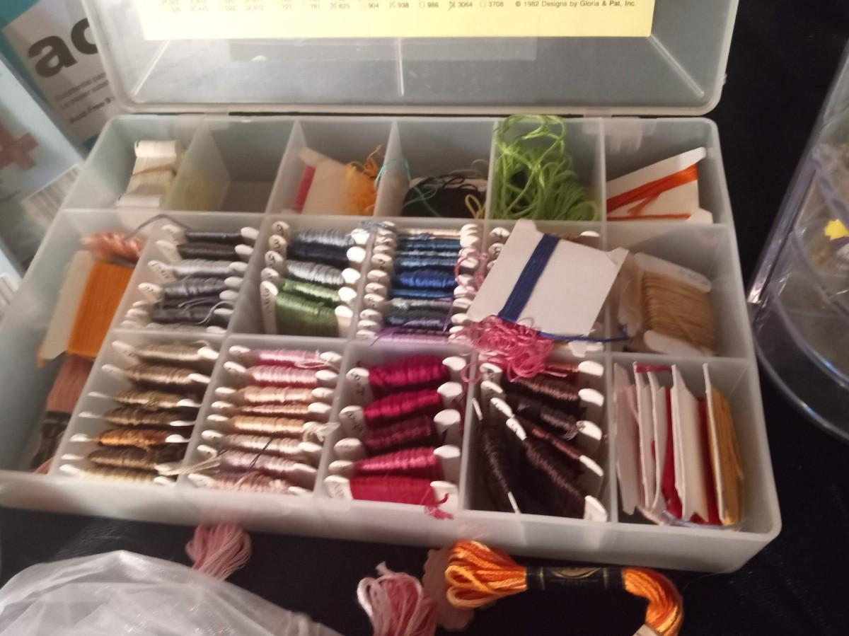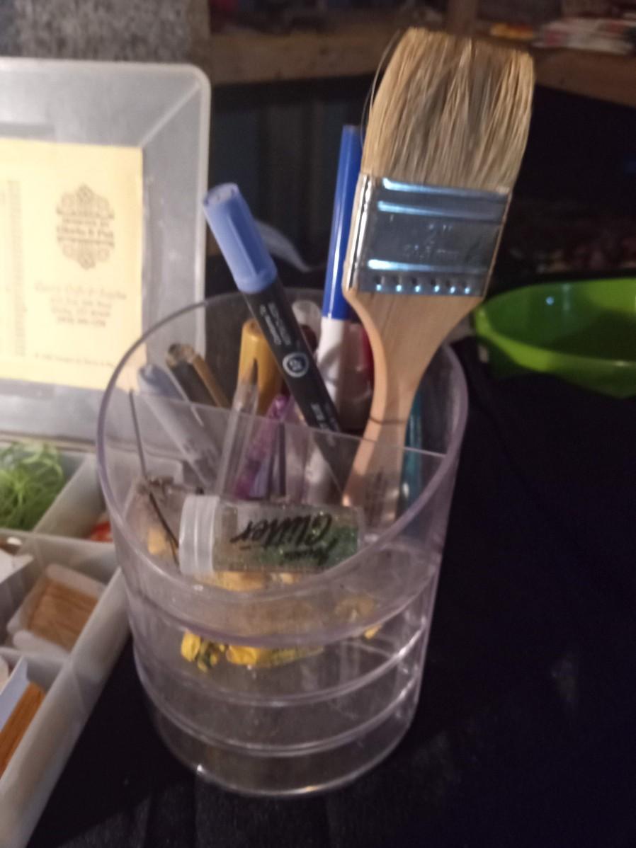 SMALL NEEDLEPOINT KITS, EMBROIDERY THREAD, POTTERY TOOLS, PAINT BRUSHES, WOODEN STICKS AND MORE