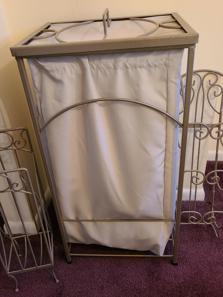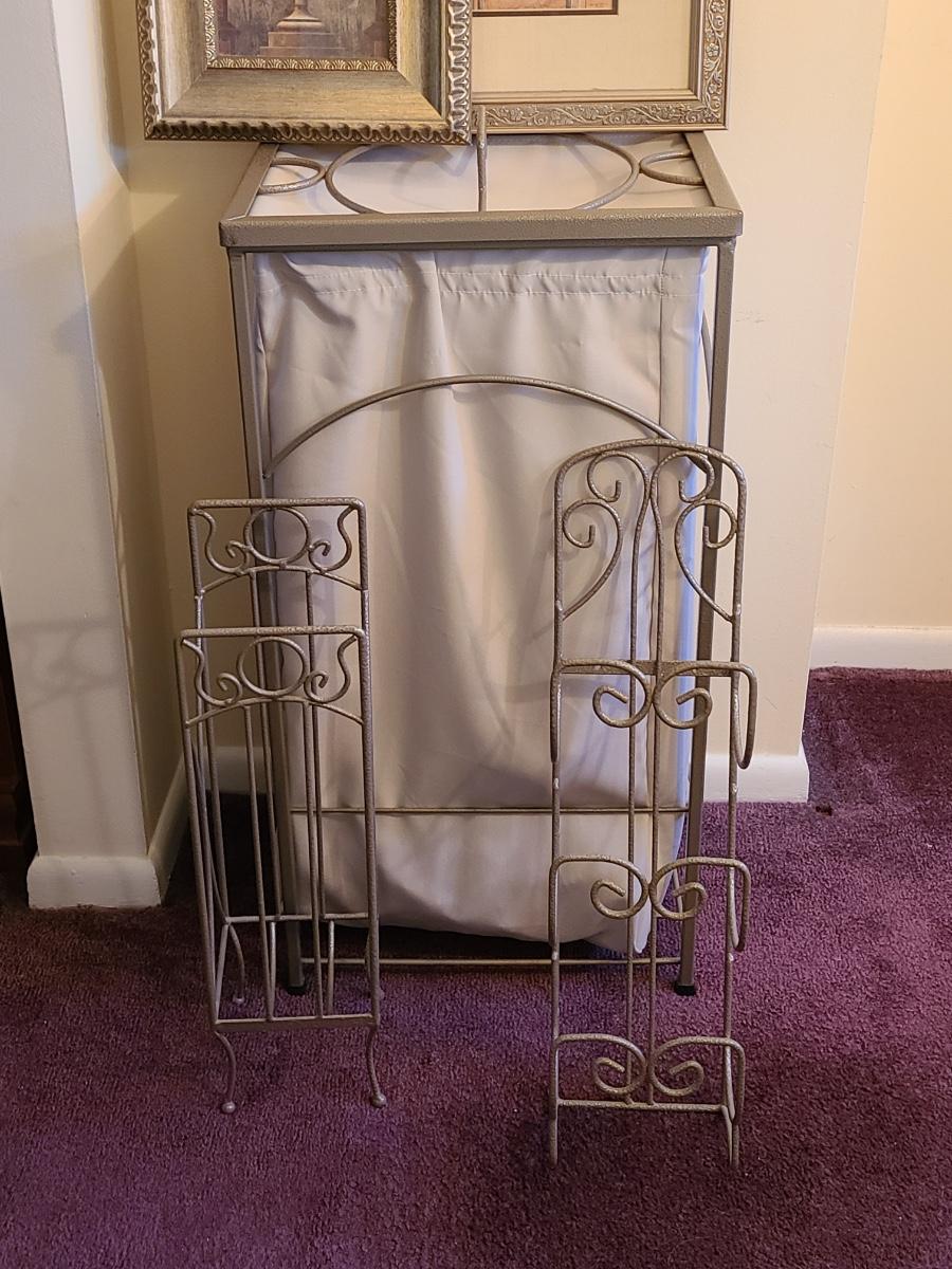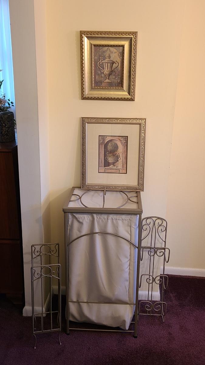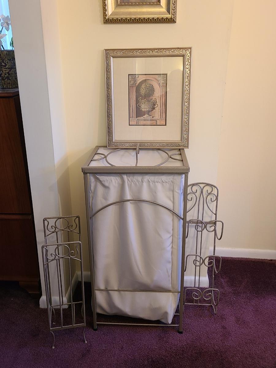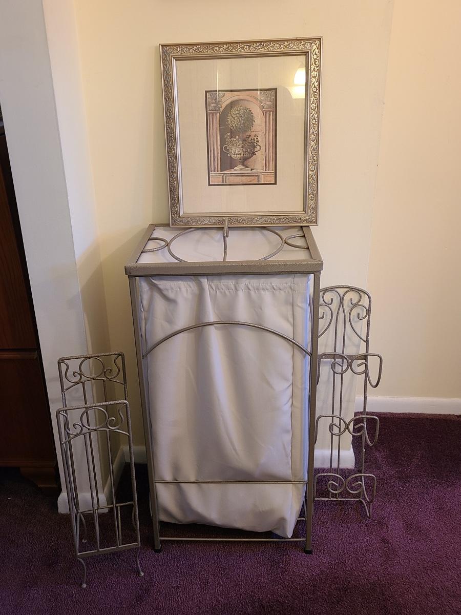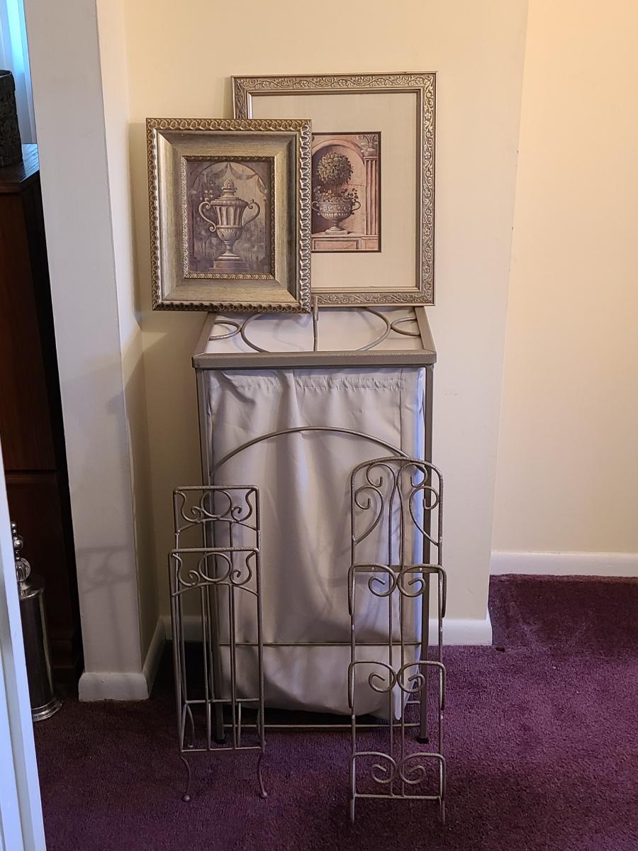 Lovely lot for bathroom decor. Includes two small prints, a hamper, toilet paper holder, and towel rack. This is a lightweight metal that is silver in tone. All pre-owned. Please see all pictures as they are the best representation of the items. The pictures show condition, measurements if taken, and what is included in the lot. Due to the large amount that we photograph and the time frame, we are not always able to take measurements. All items unless noted, are pre-owned and have been used. If you purchased furniture, you must bring help. We do not allow one person to carry large furniture out on their own. Bring help, tools and a truck for the safety of our client’s homes, and your personal safety. Company policy. Thank you.
