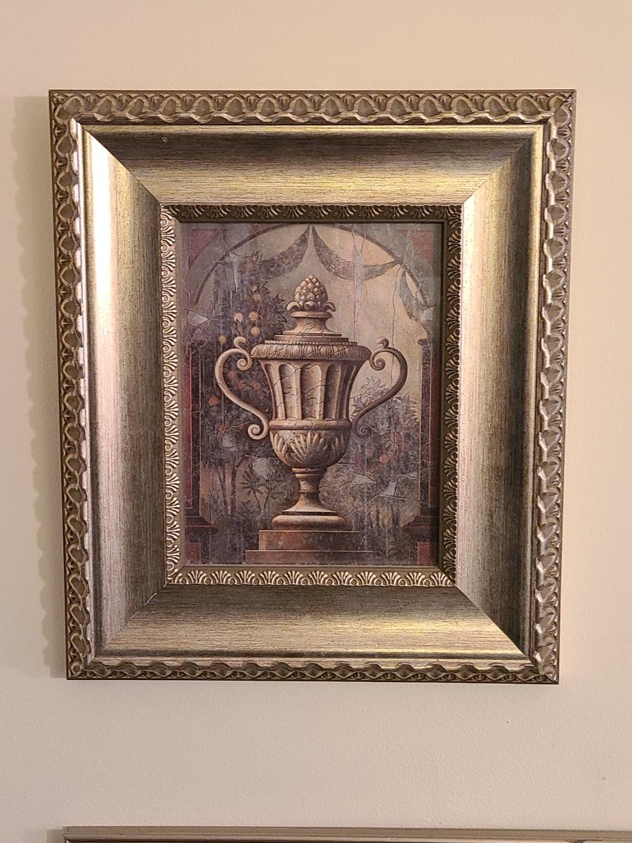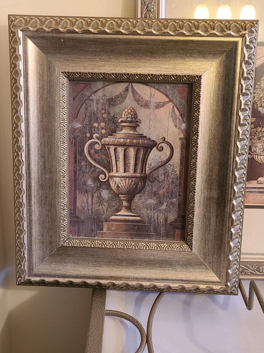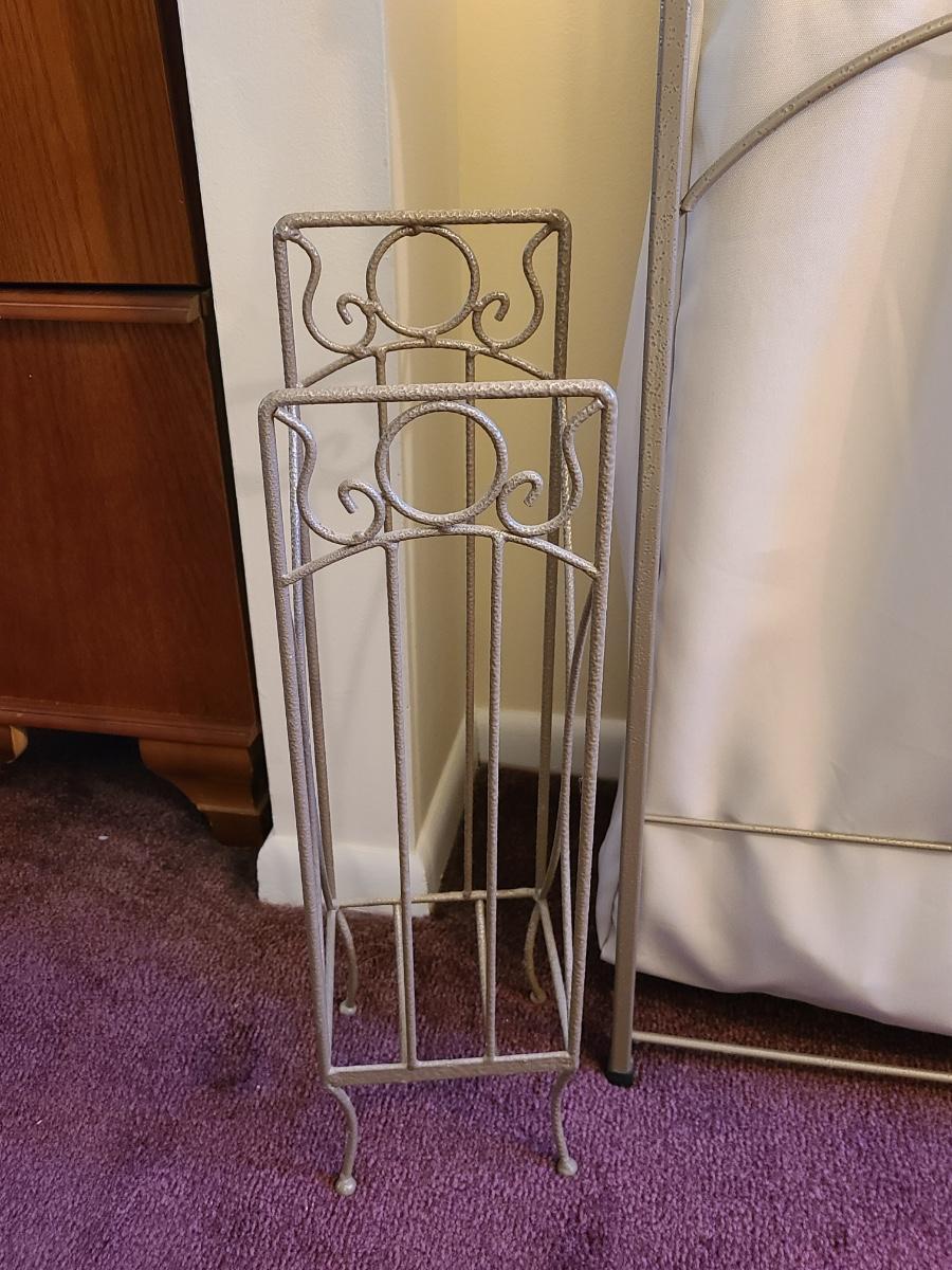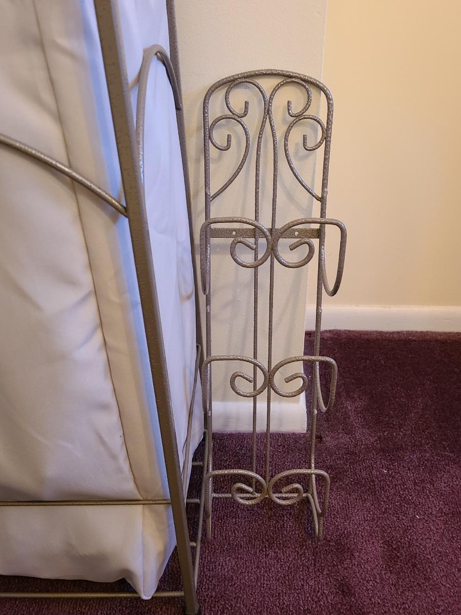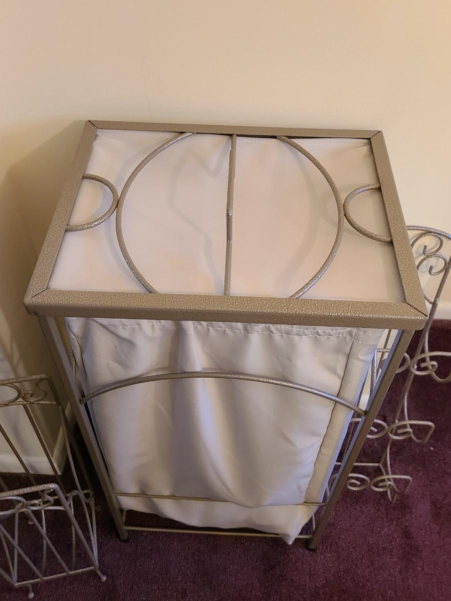 Lovely lot for bathroom decor. Includes two small prints, a hamper, toilet paper holder, and towel rack. This is a lightweight metal that is silver in tone. All pre-owned. Please see all pictures as they are the best representation of the items. The pictures show condition, measurements if taken, and what is included in the lot. Due to the large amount that we photograph and the time frame, we are not always able to take measurements. All items unless noted, are pre-owned and have been used. If you purchased furniture, you must bring help. We do not allow one person to carry large furniture out on their own. Bring help, tools and a truck for the safety of our client’s homes, and your personal safety. Company policy. Thank you.