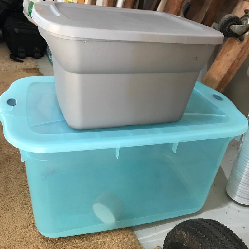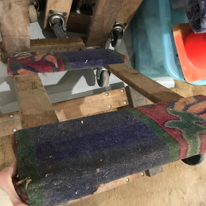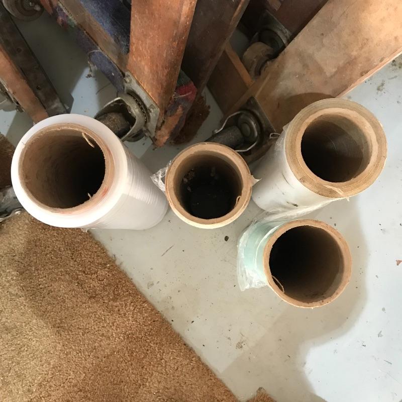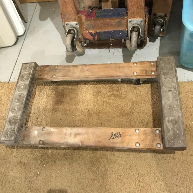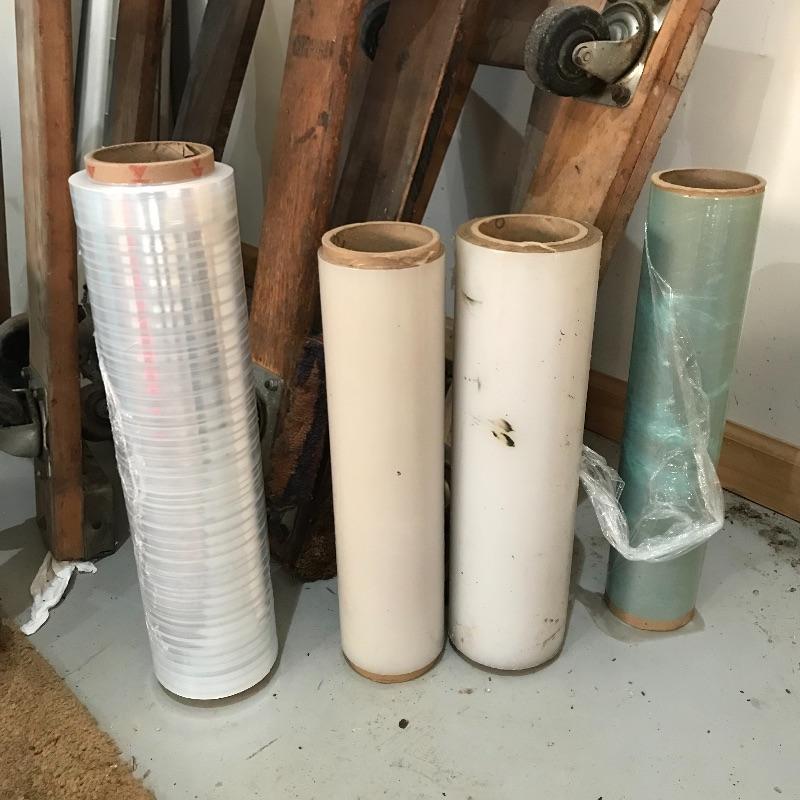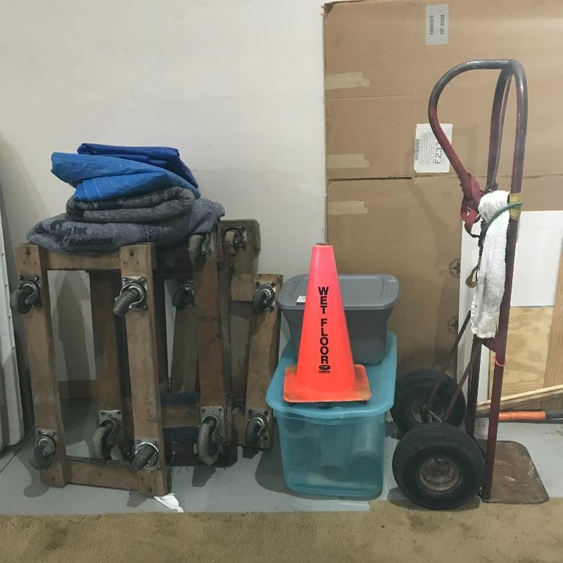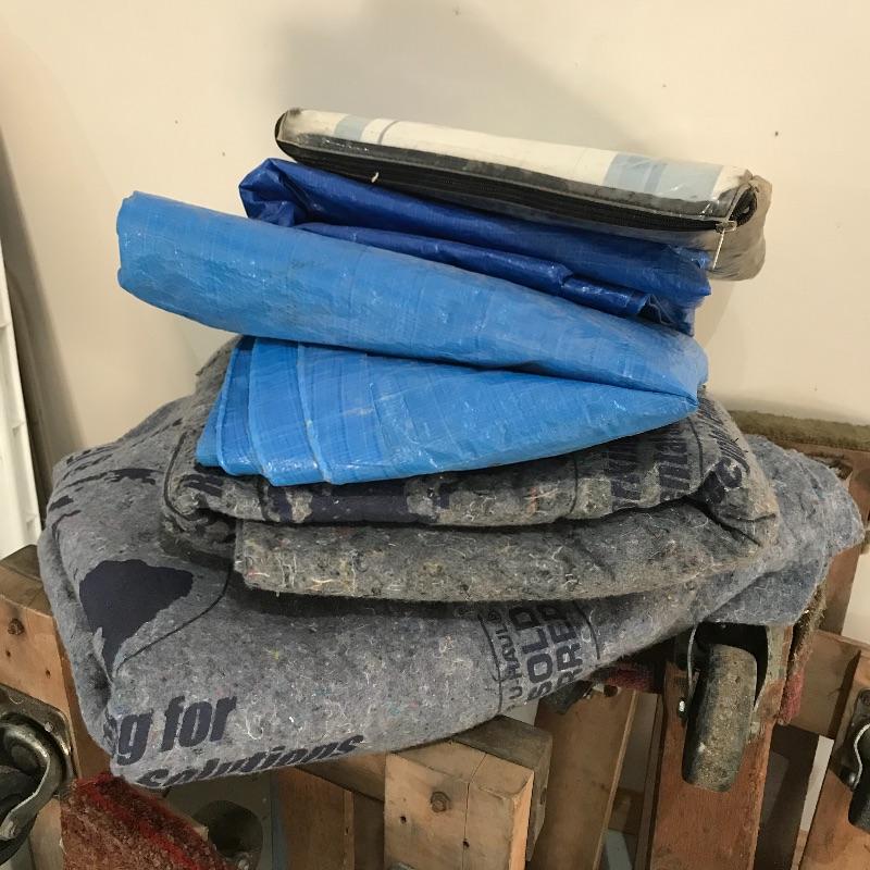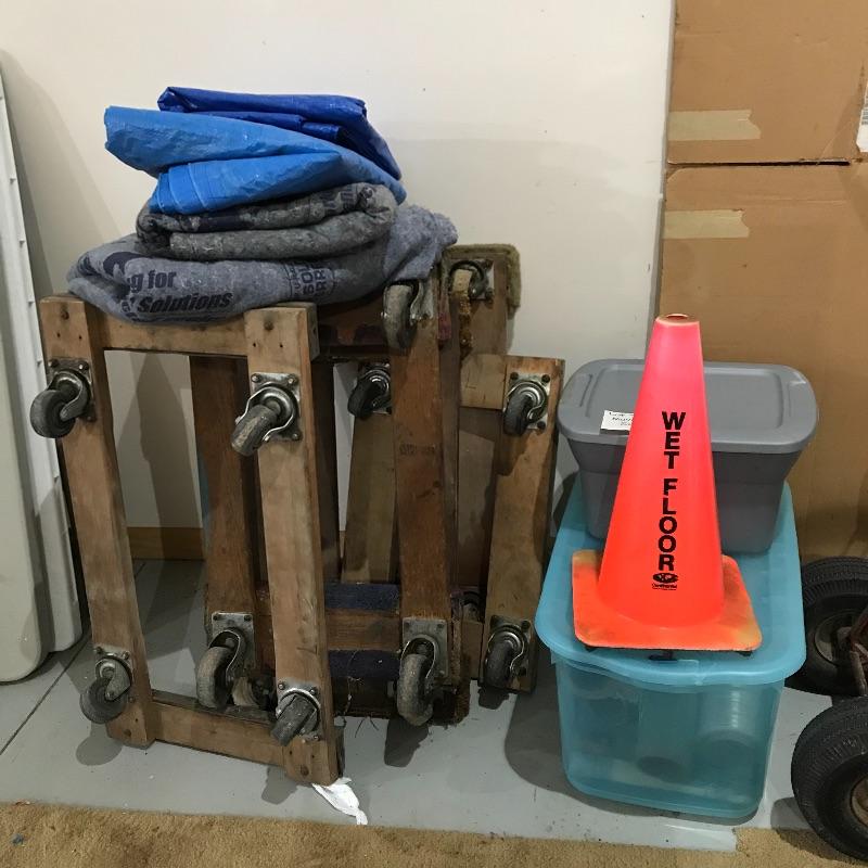 This one is for you DIY and commercial movers! Five rolling dollies (three with carpet, one bare wood and one with neat textured rubber guards. Two U-Haul moving blankets, two tarps (plus a third tarp that can double as a tent if you purchase the framing). Four used rolls of wrapping plastic, two storage bins (see images of crack and repairs), a bright orange caution cone and a heavy metal red hand truck with bungee cords. See images. Local pick up only.