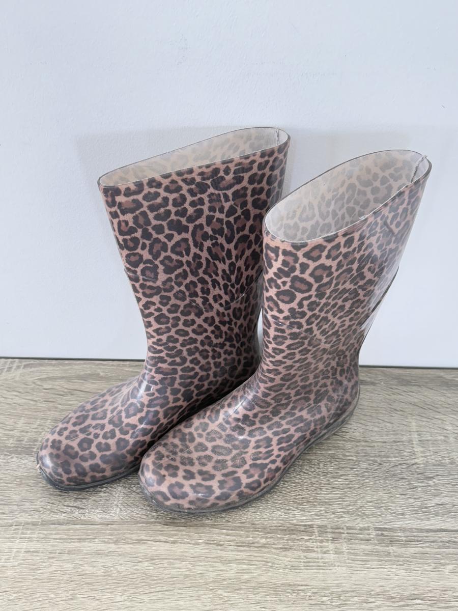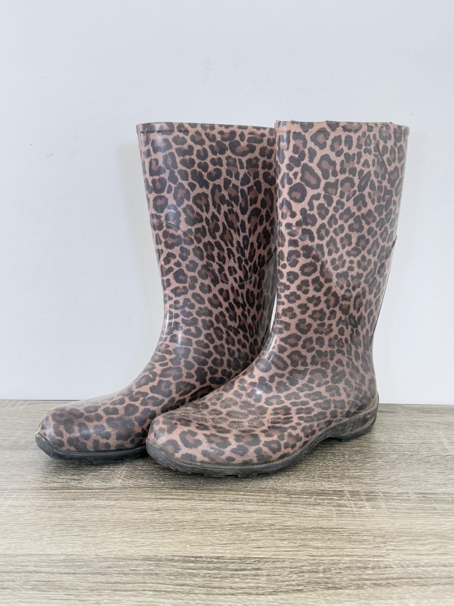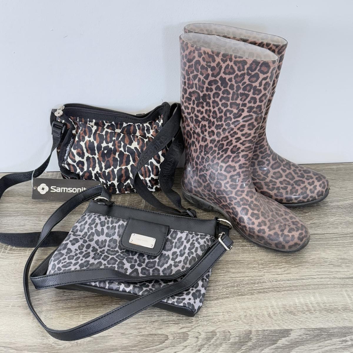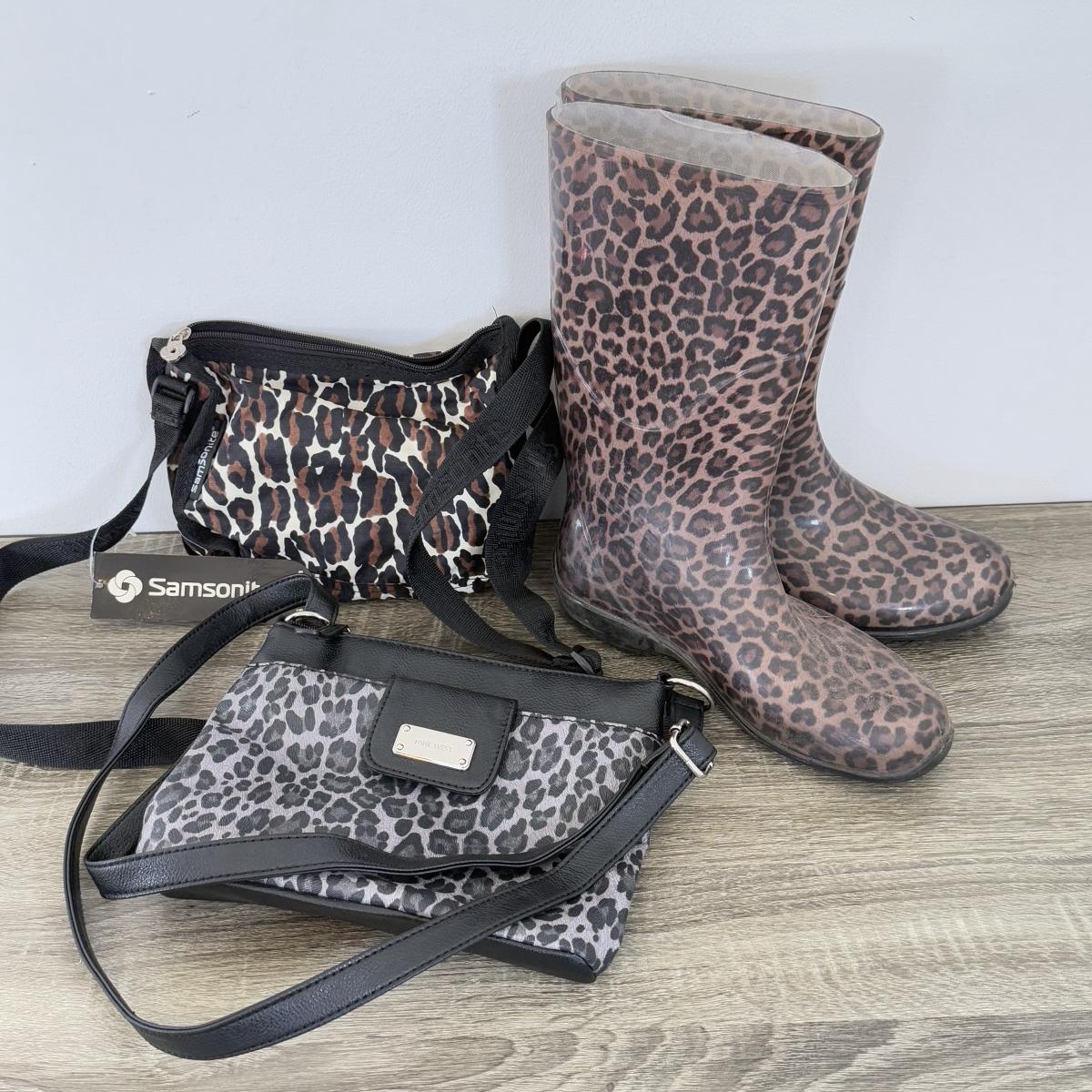 LOT 307B: Lovely Leopard Print - Rubber Rain Boots (Ladies’ 8) & 2 Purses