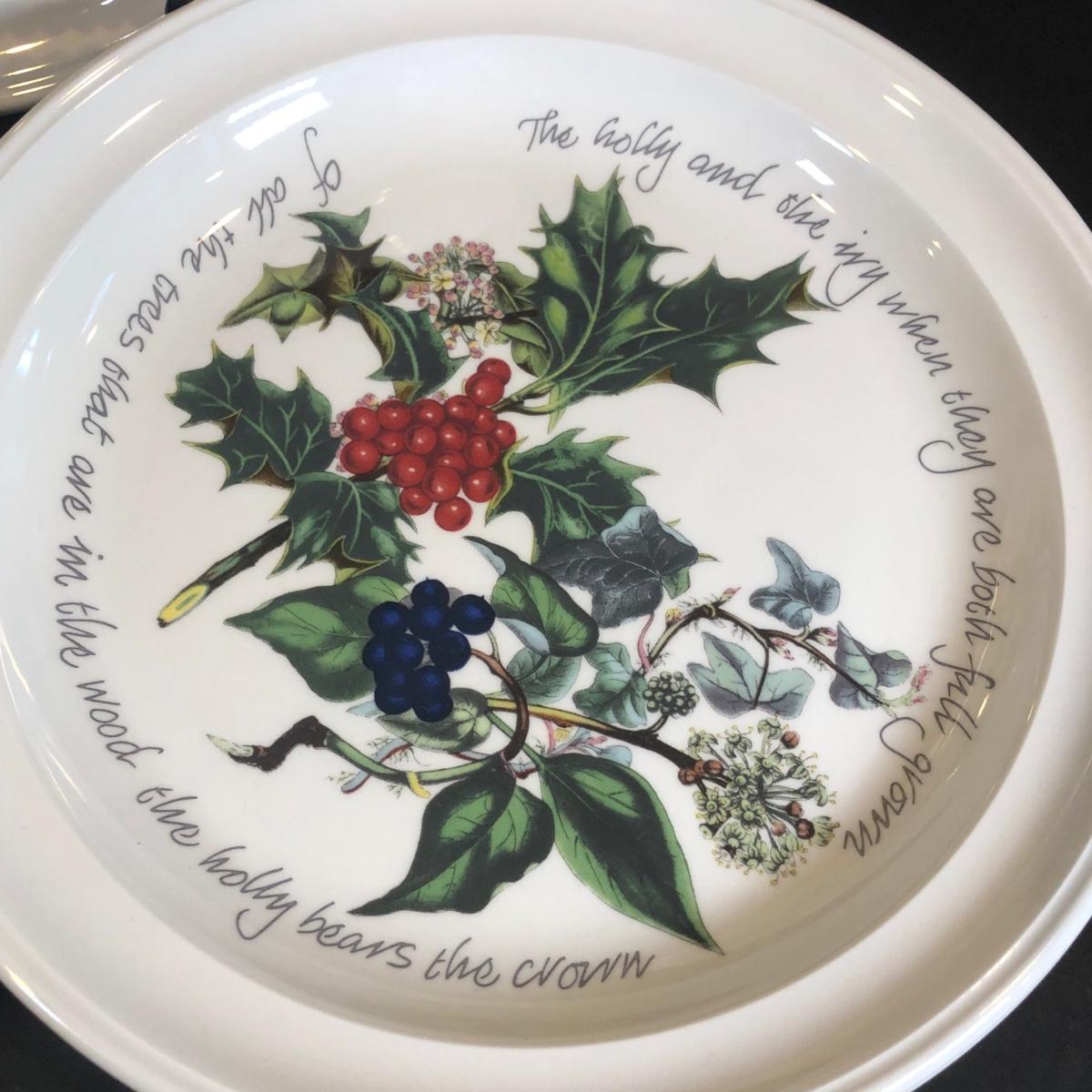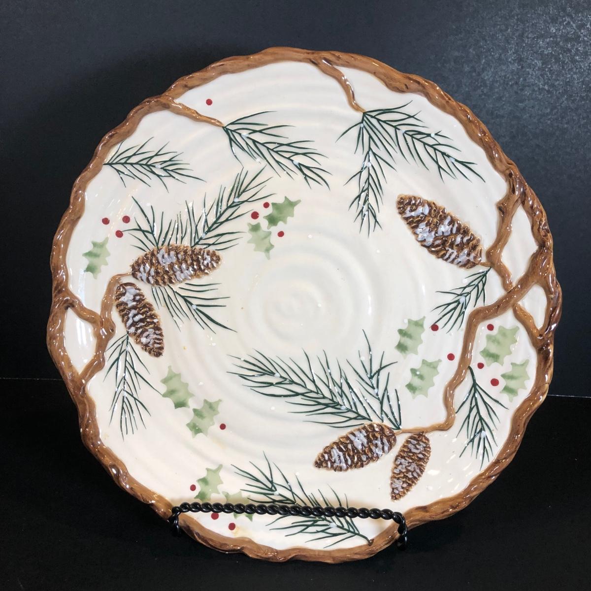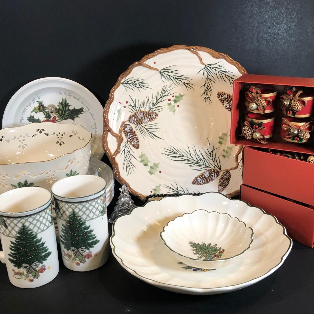 LOT 307K: Winter Collection - Portmerion "The Holly & The Ivy" Plates by Anwyl Cooper-Willis, Lenox Holiday 8" Cutout Bowl, Mikasa Mugs, K&K Interiors Pinecone Plate & More
