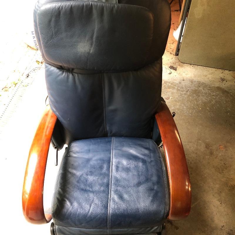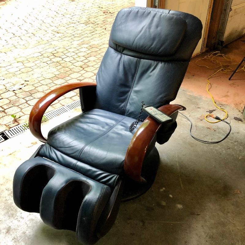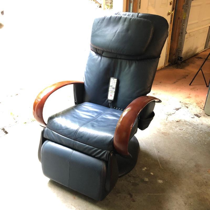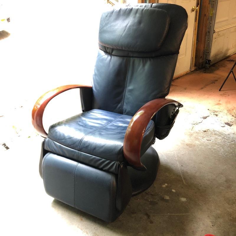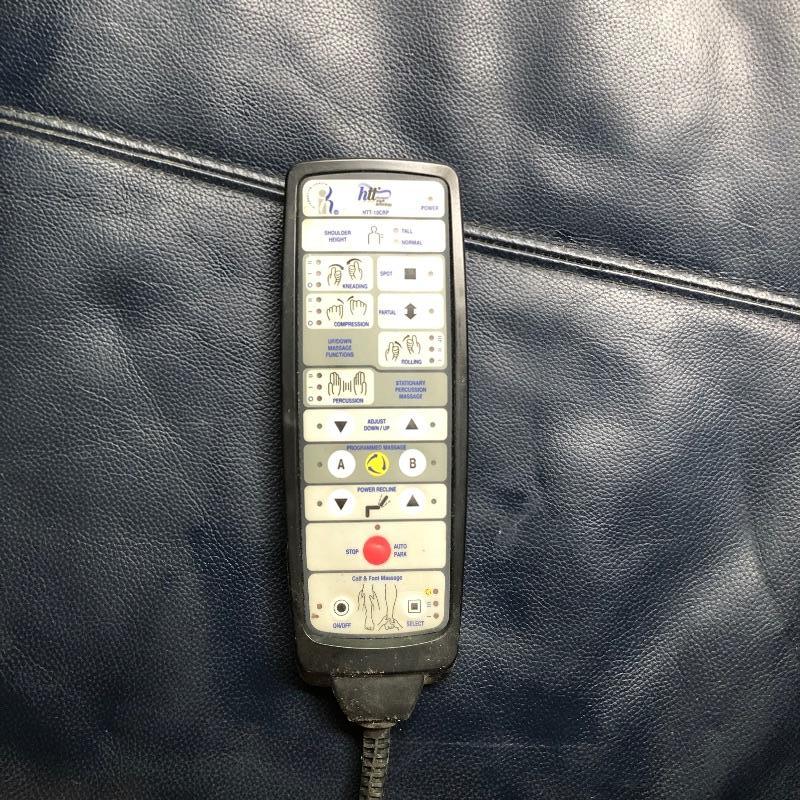 Attractive and comfortable, this Human Touch chair just happens to be an amazing massage chair as well, what more could you ask for! A very sharp looking dark blue leather chair with wood tone colored curved arms giving this piece a sleek look. It comes with the controller and everything appears to work as expected. It has a few small signs of wear that are shown in the latter images and could do with a good wipe down. We believe the back cover may just be missing a screw to hold it in place more firmly.