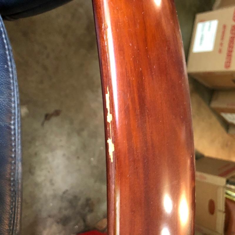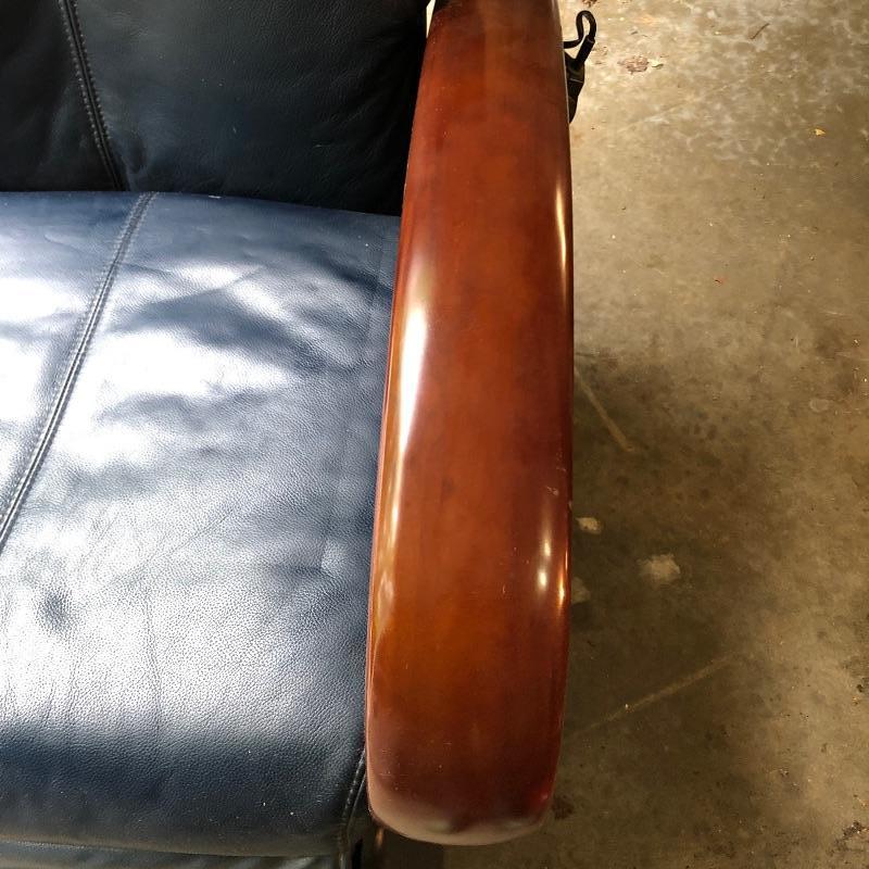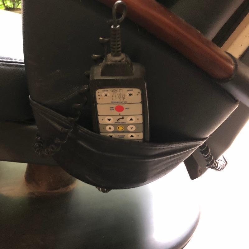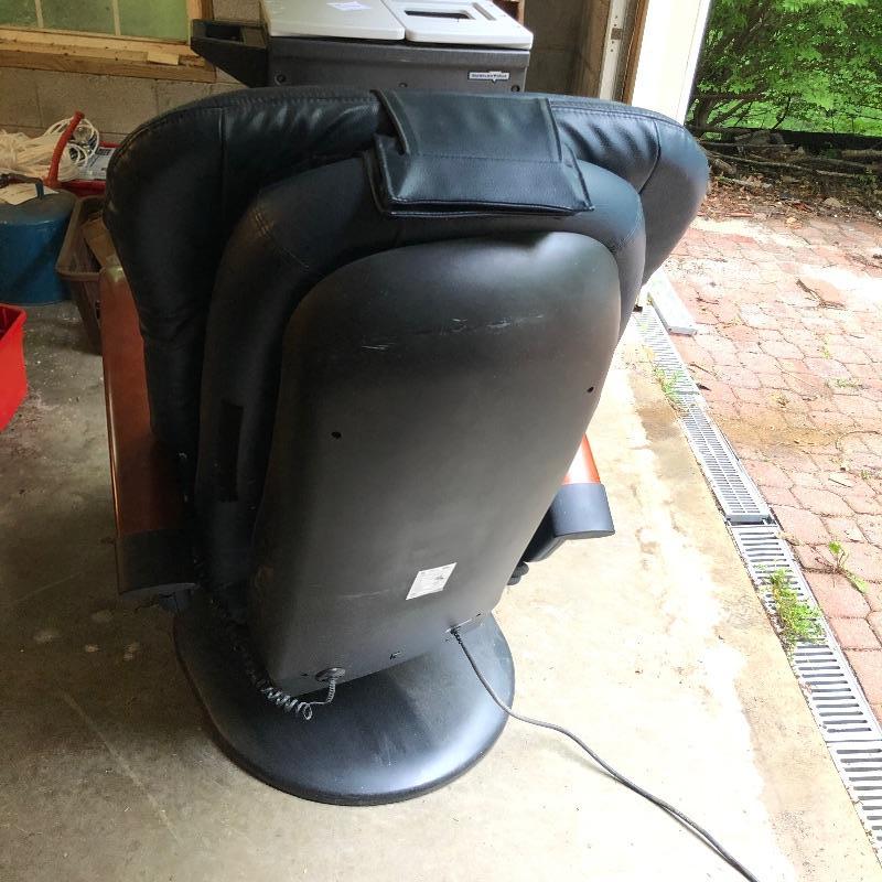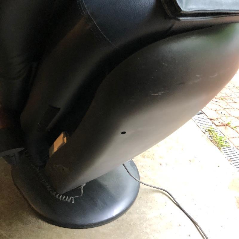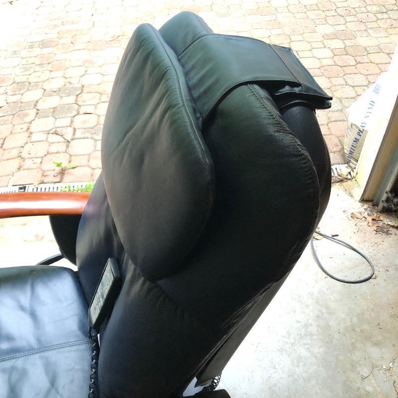 Attractive and comfortable, this Human Touch chair just happens to be an amazing massage chair as well, what more could you ask for! A very sharp looking dark blue leather chair with wood tone colored curved arms giving this piece a sleek look. It comes with the controller and everything appears to work as expected. It has a few small signs of wear that are shown in the latter images and could do with a good wipe down. We believe the back cover may just be missing a screw to hold it in place more firmly.