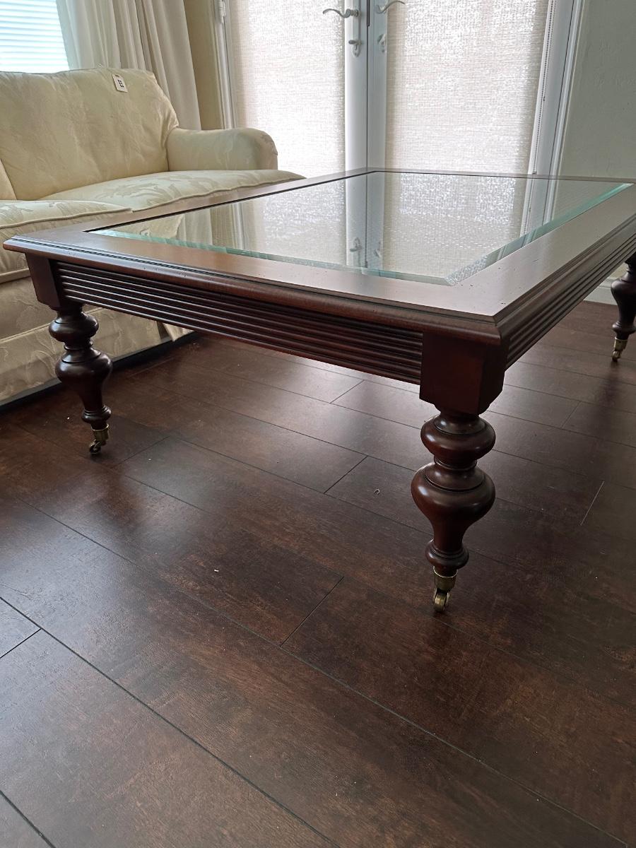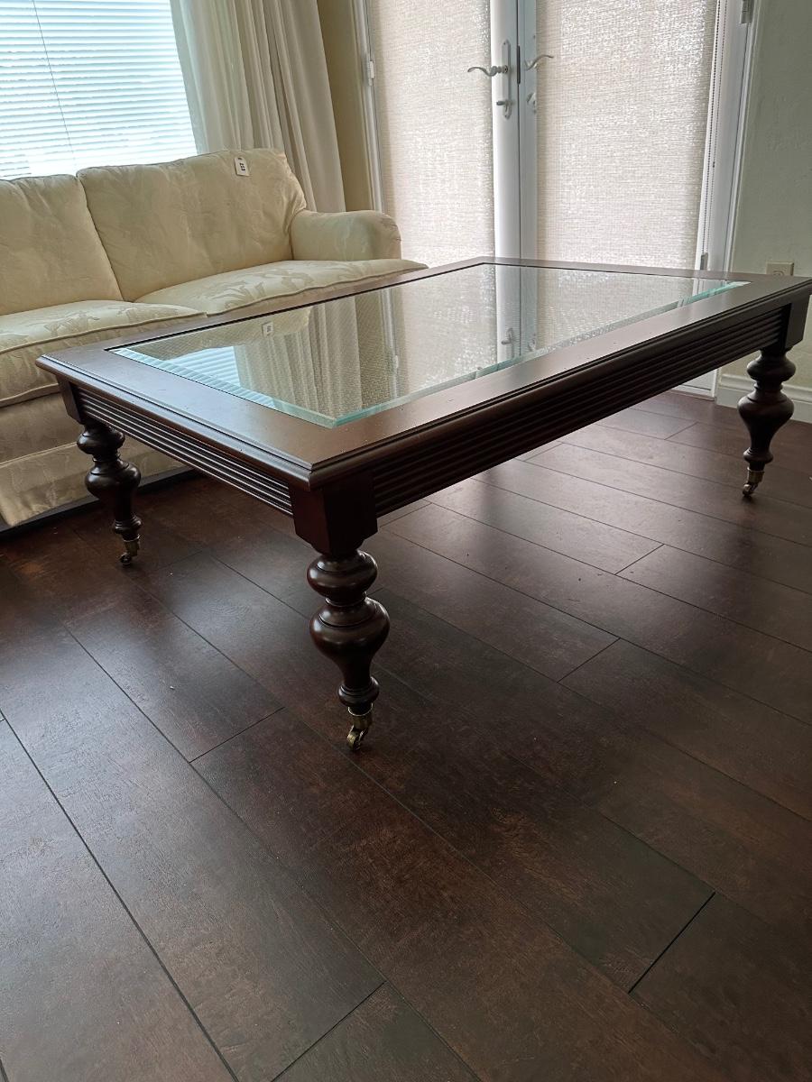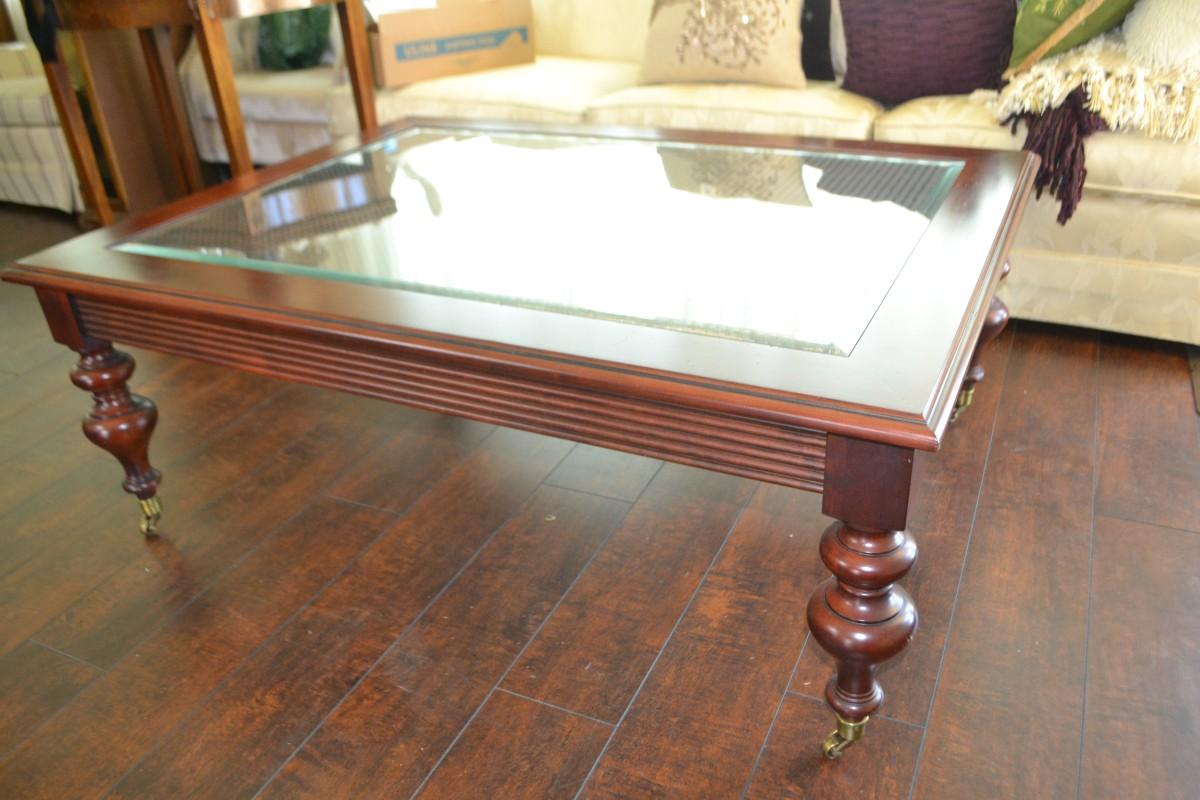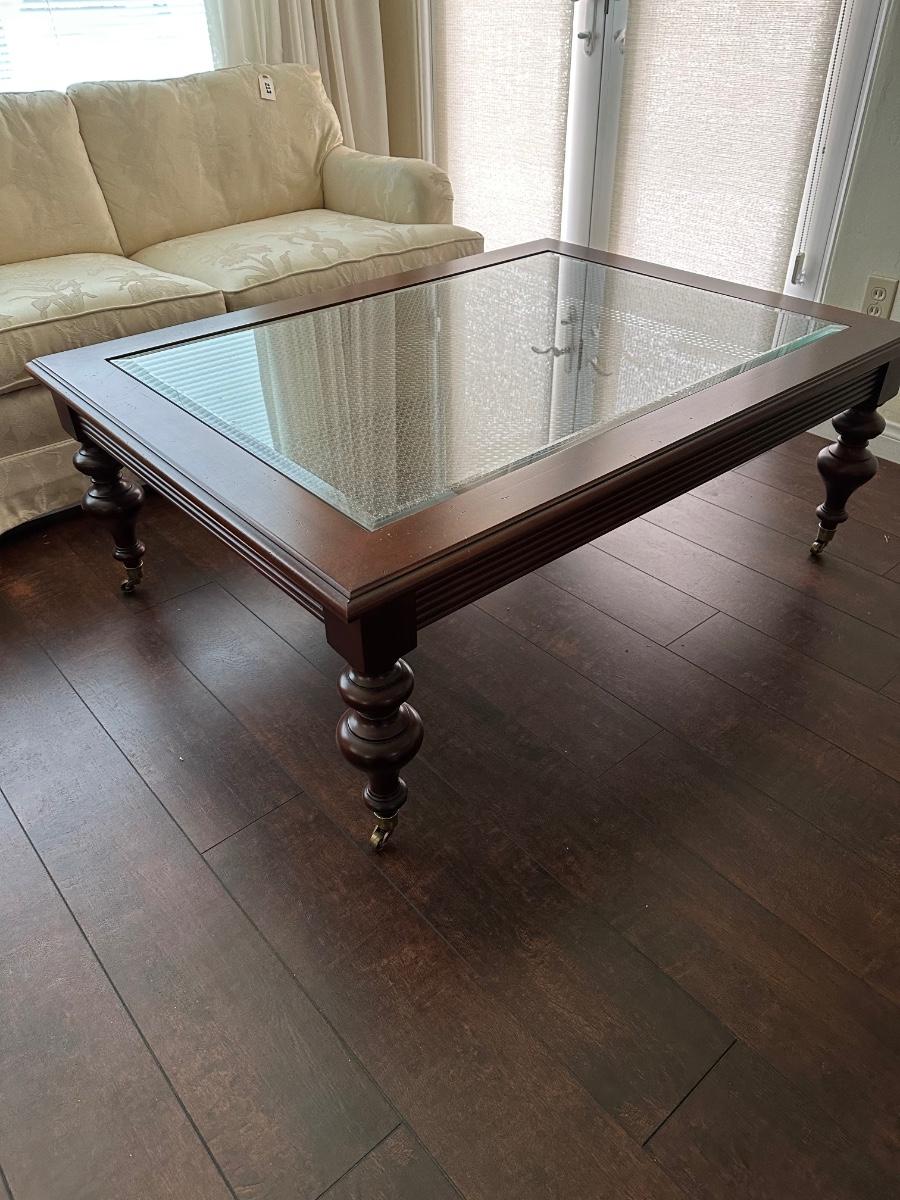 LOT 308. ETHAN ALLEN GLASS AND WOOD COFFEE TABLE ON CASTERS