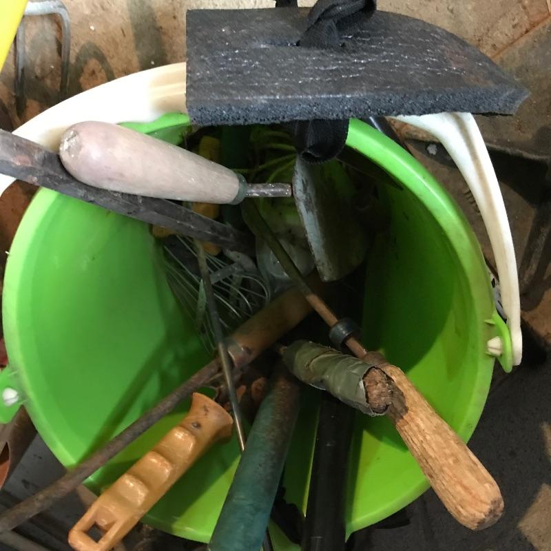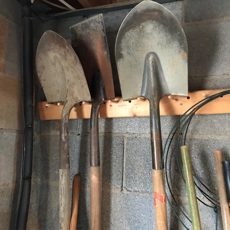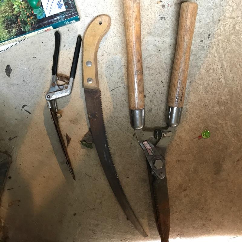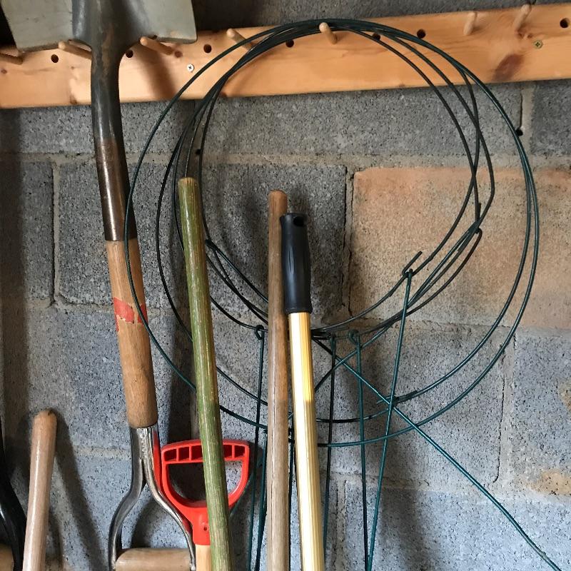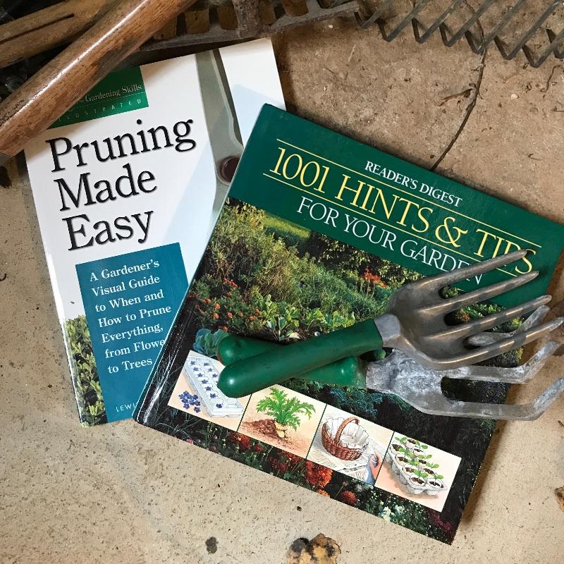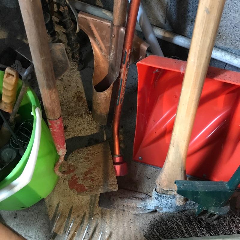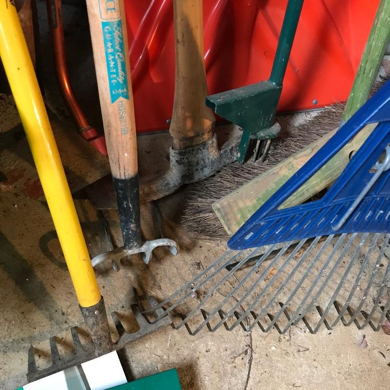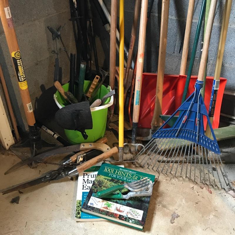This large assortment of garden implements includes shovels, fan rake, flat spade, cultivator, hoe, clippers, pruning shears and knife, trowel, snow shovel, hose handle, tamper, a bucket and two gardening books. Yes, you can get all of these items and more in one lot. See photos for all tools included. No shipping.