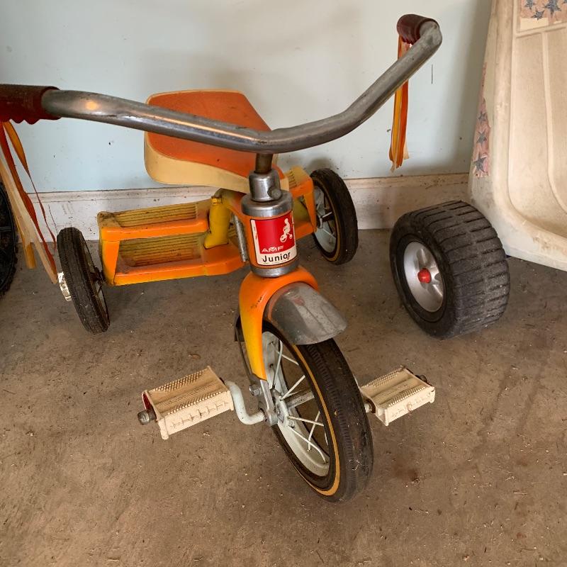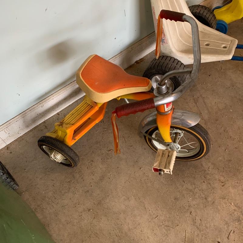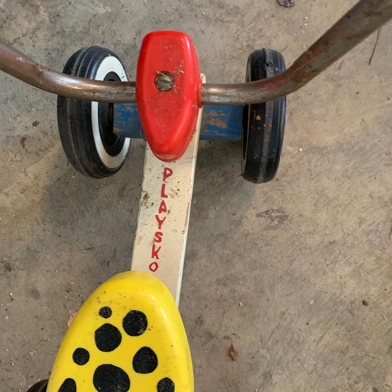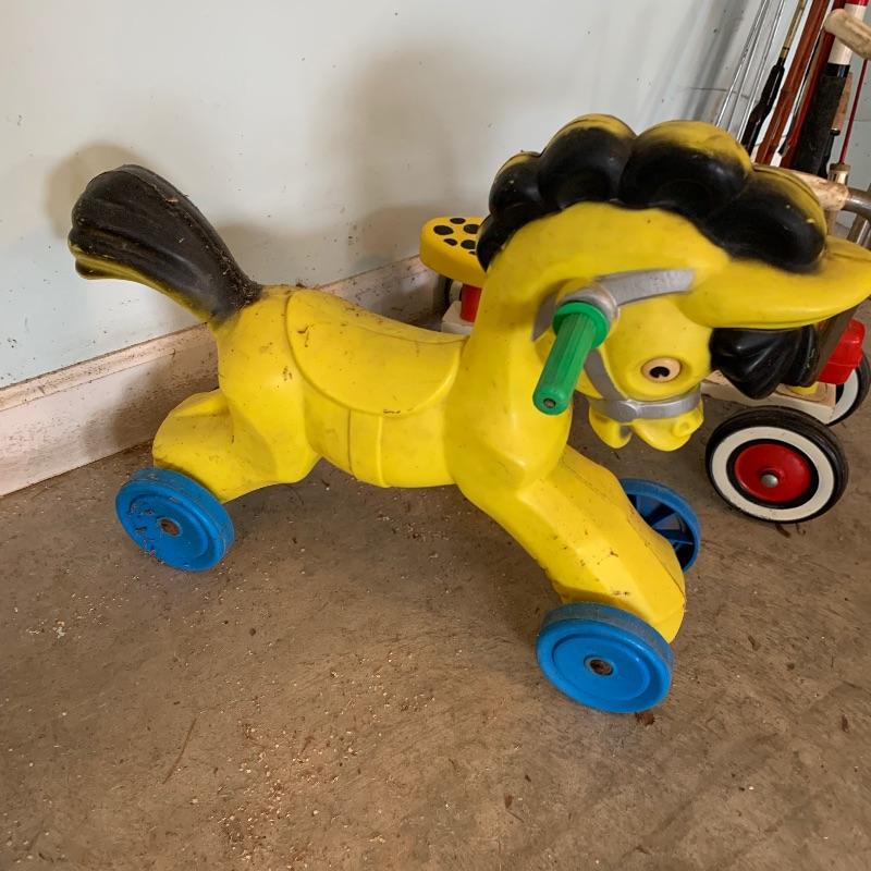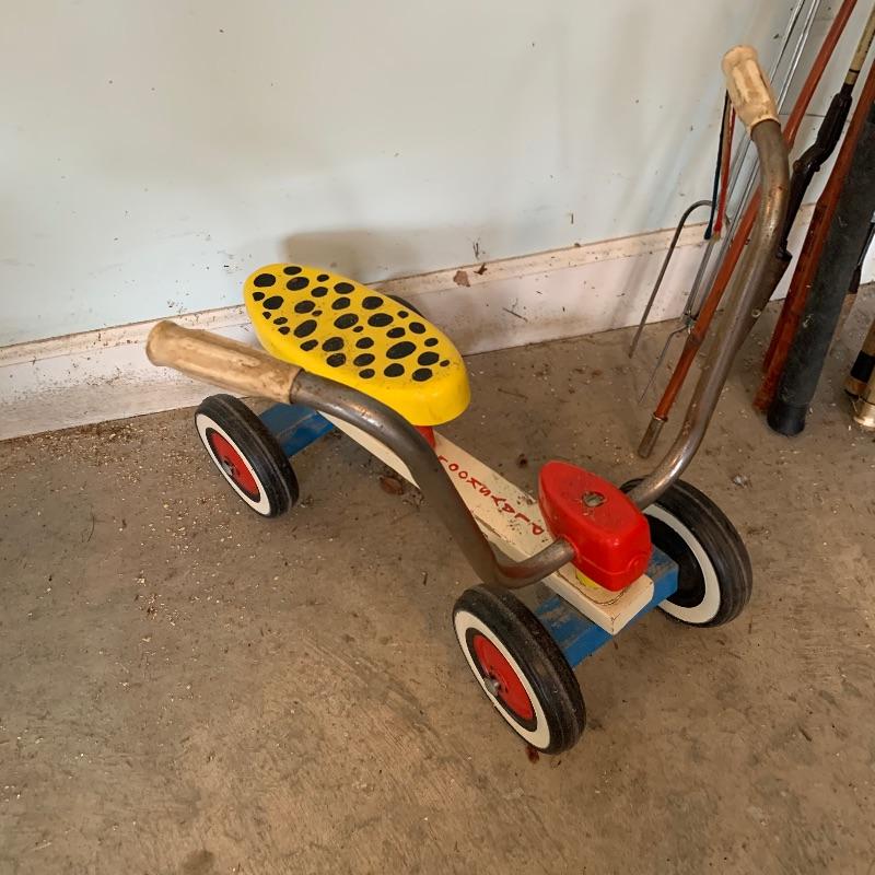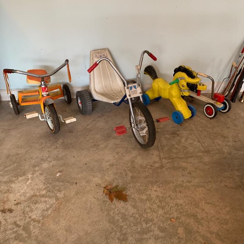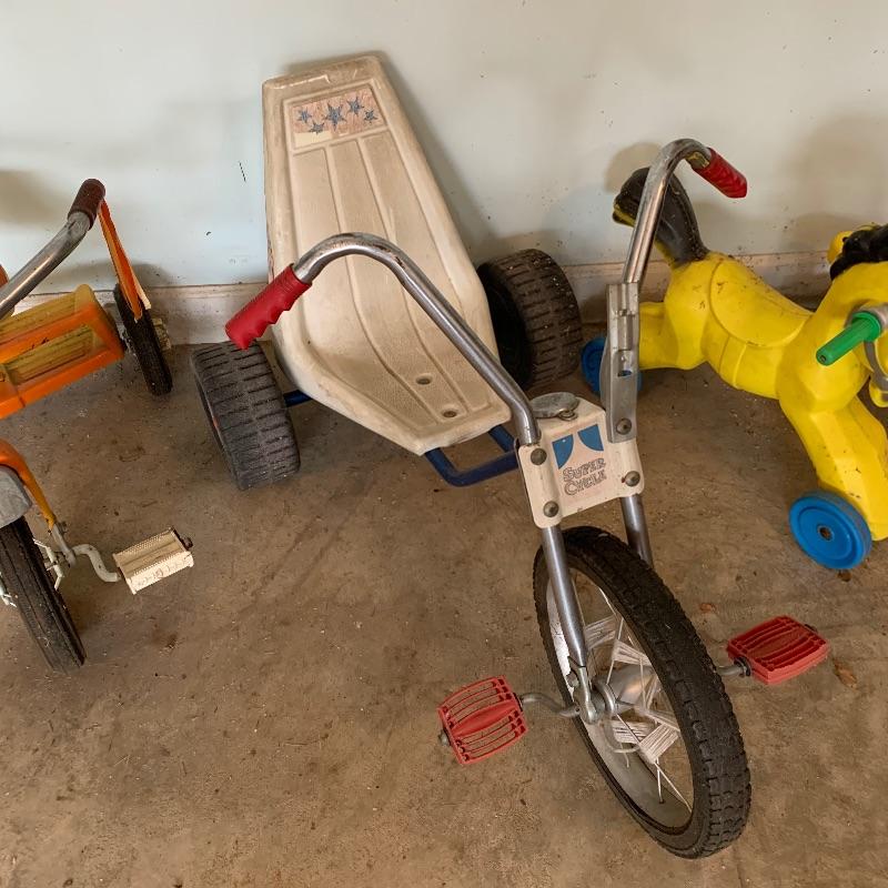Four vintage kid cycles! All have their little issues but overall in surprisingly good condition. AMF Junior tricycle has a loose seat, super cycle has a piece of metal sticking up from the handle bars that could be dangerous to a rider. The Playskool rider and plastic horse roller are in good shape. Can't guarantee recall status on these. Better to look and collect at than actually use. Local pick up only.