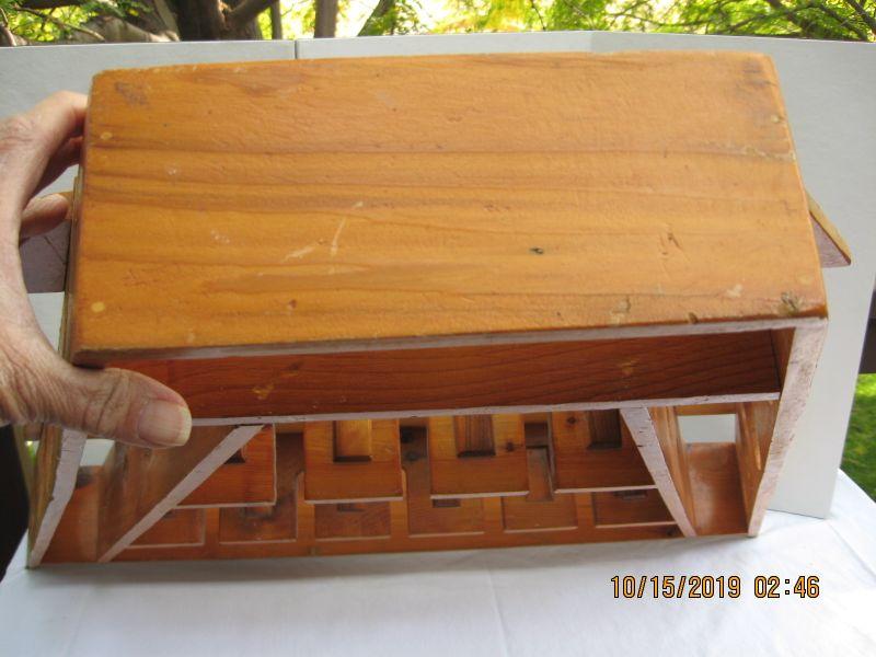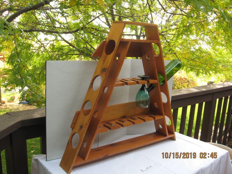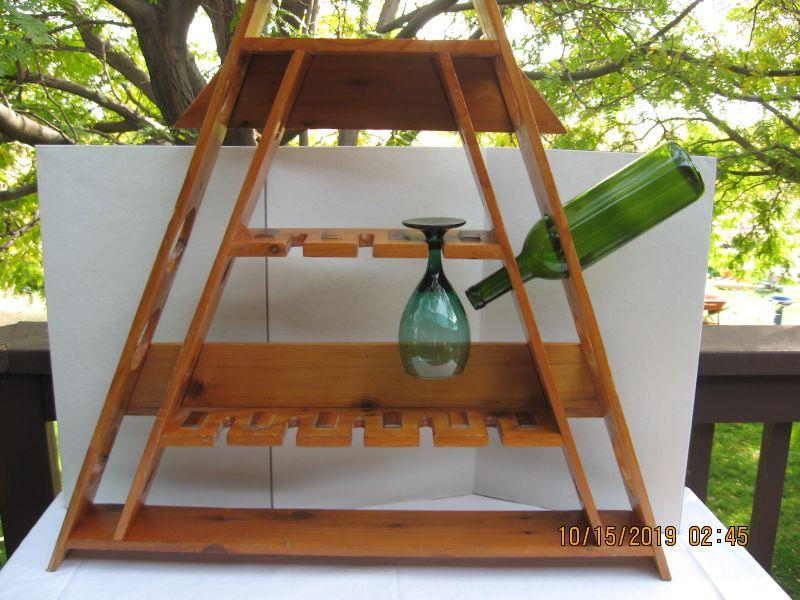 Vintage Solid Wood Wall-mount Wine/Glass Shelf/Glass. Some scuffs & scratches. 28”H 30”W 4”D (glass & bottle not included)
