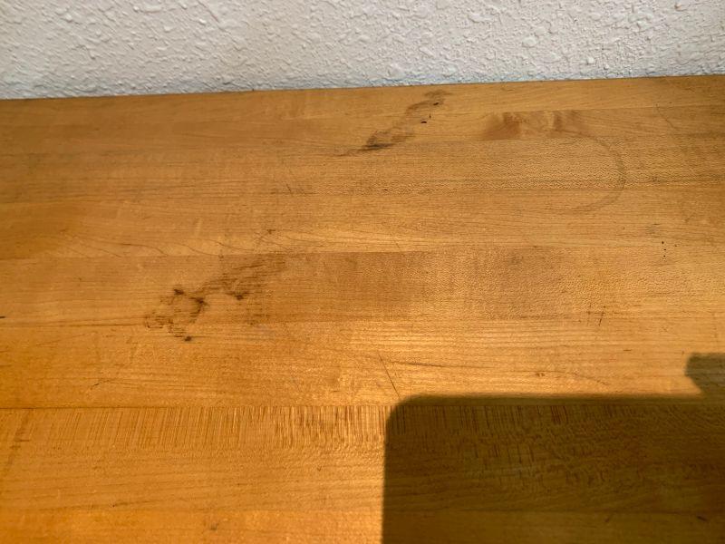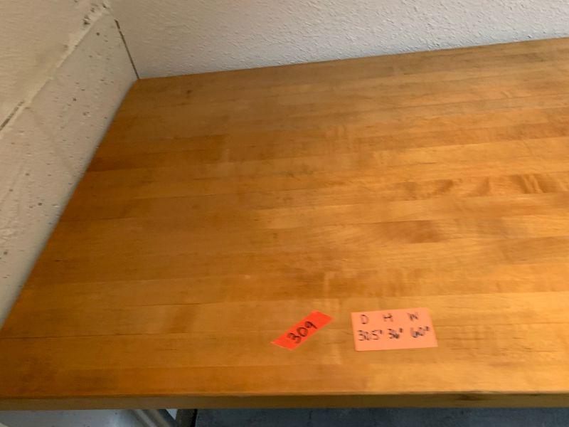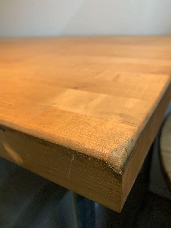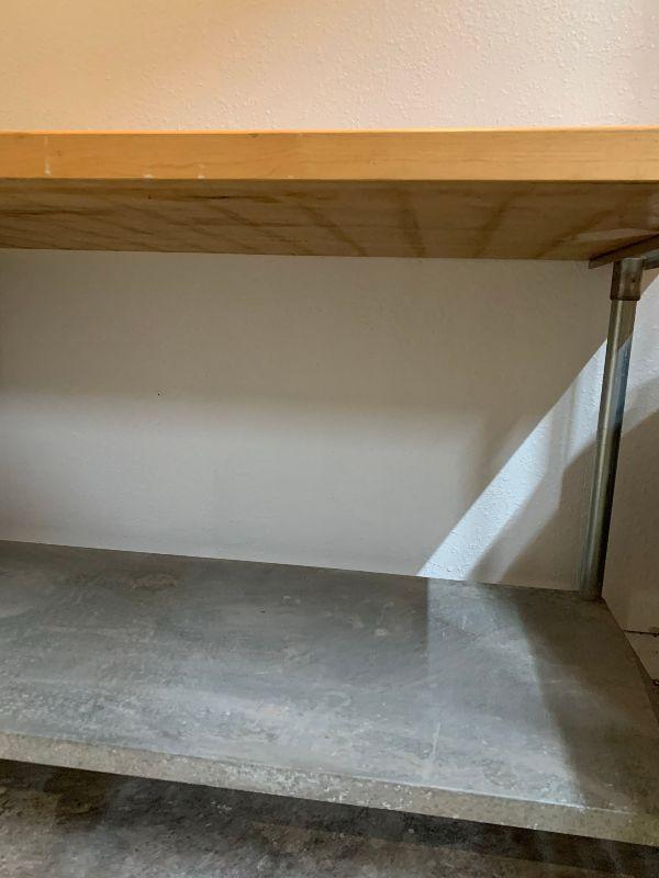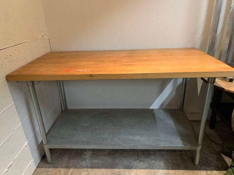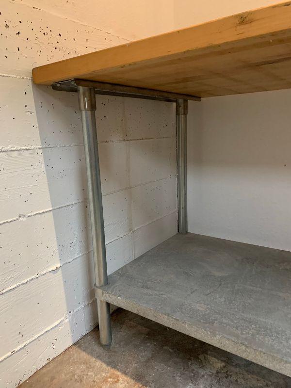 Industrial table with bottom shelf wooden top.