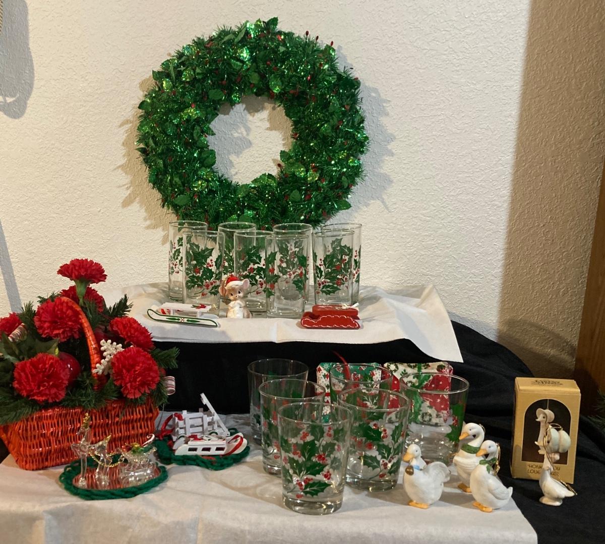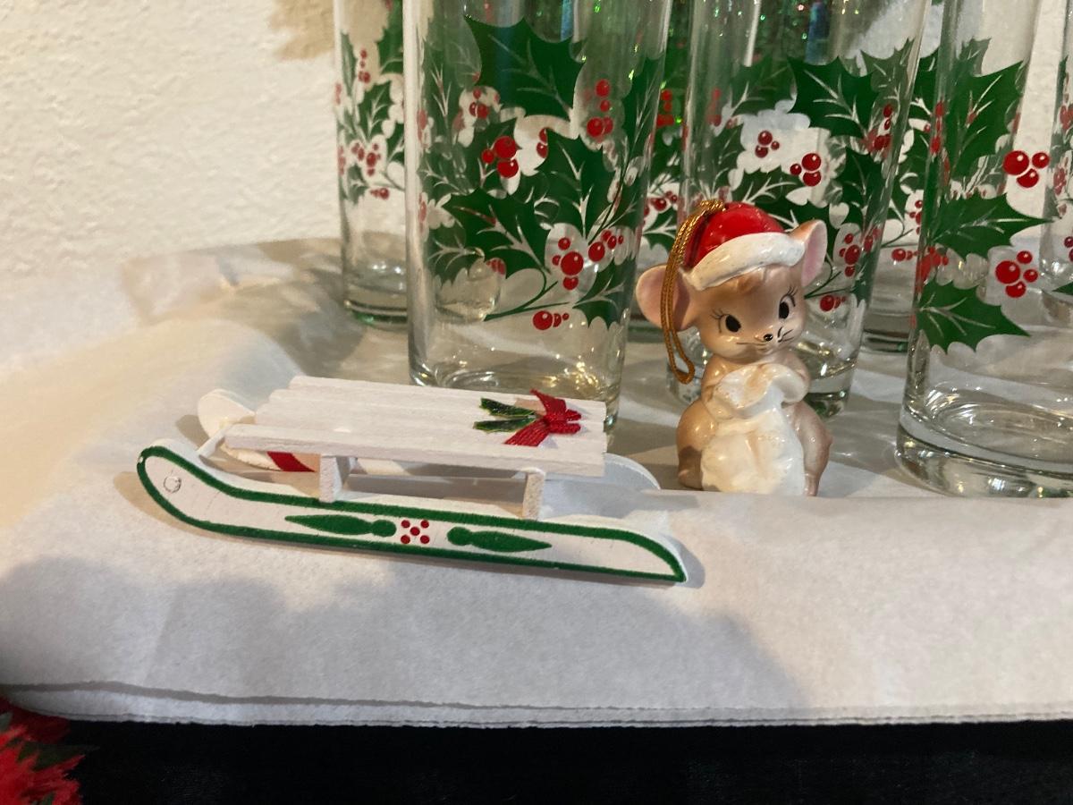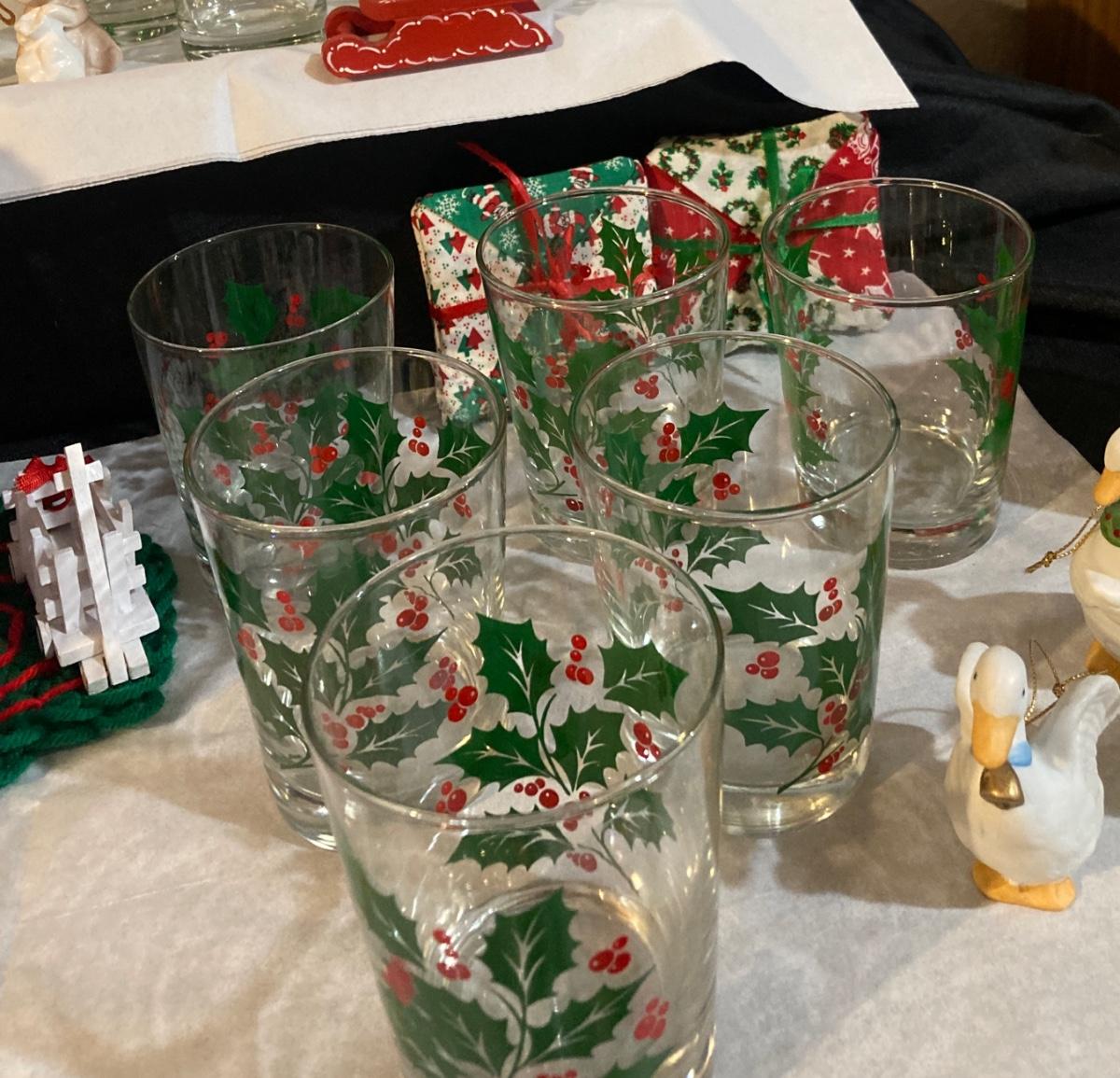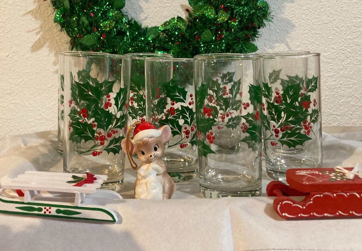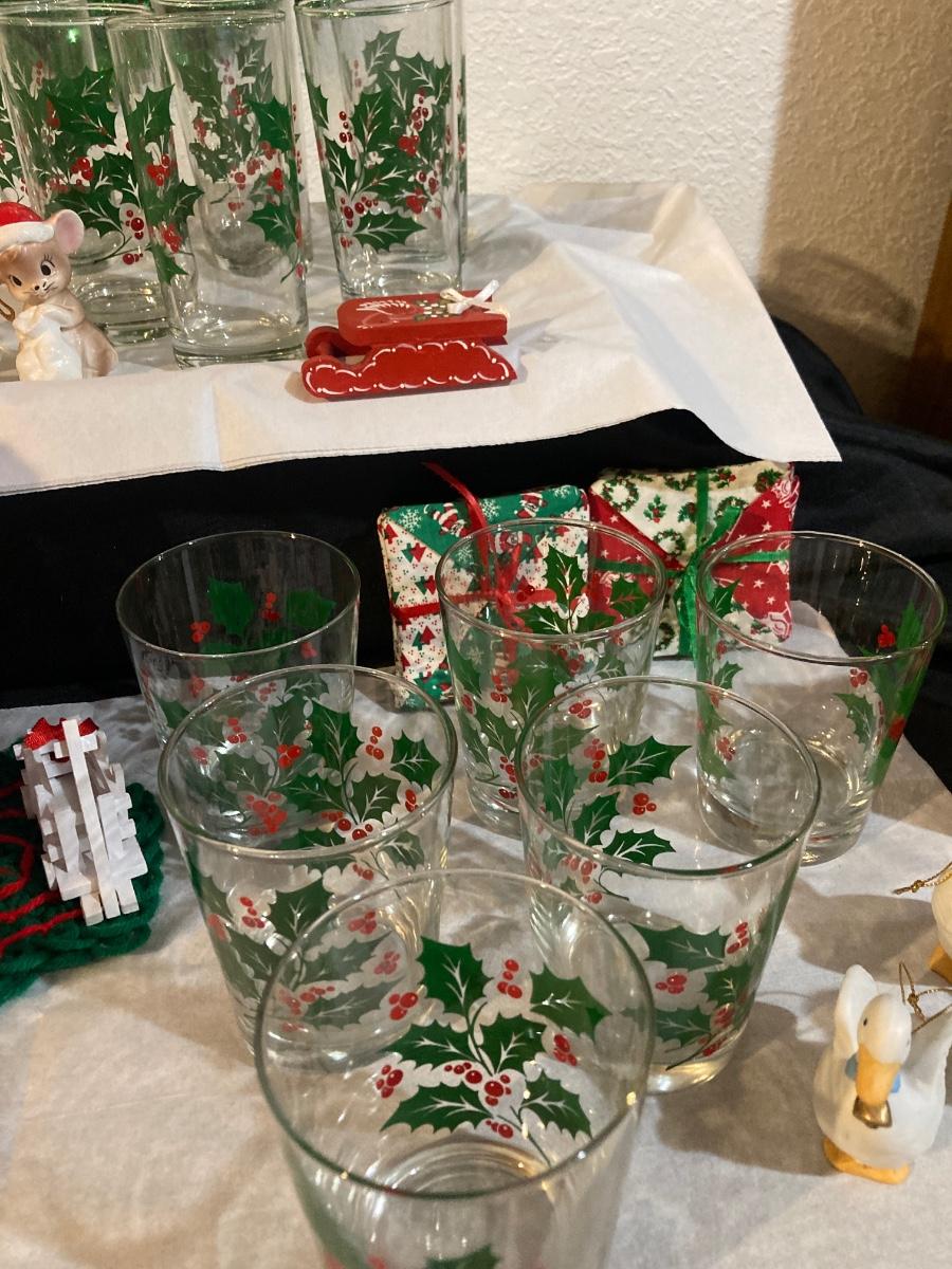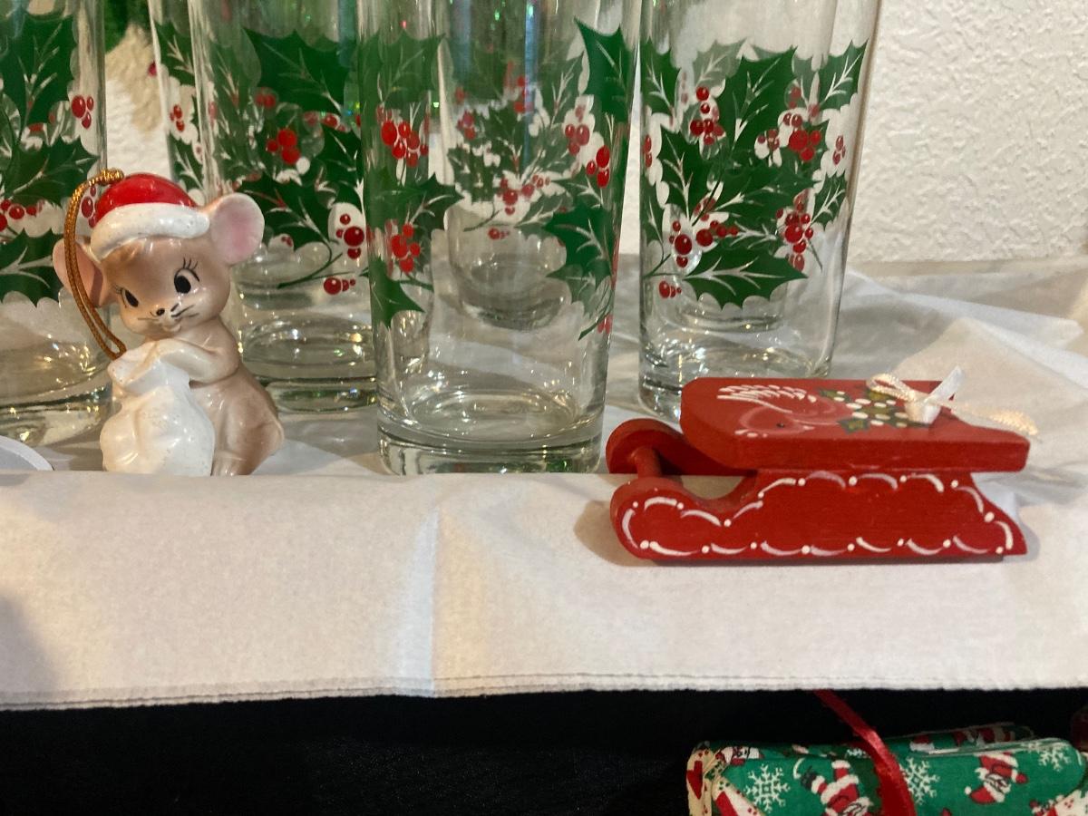 LOT 309 CHRISTMAS ¤¶ DRINKING GLASSES IN TWO SIZES AND A BIT OF HOLIDAY DECORATION (BASEMENT)
