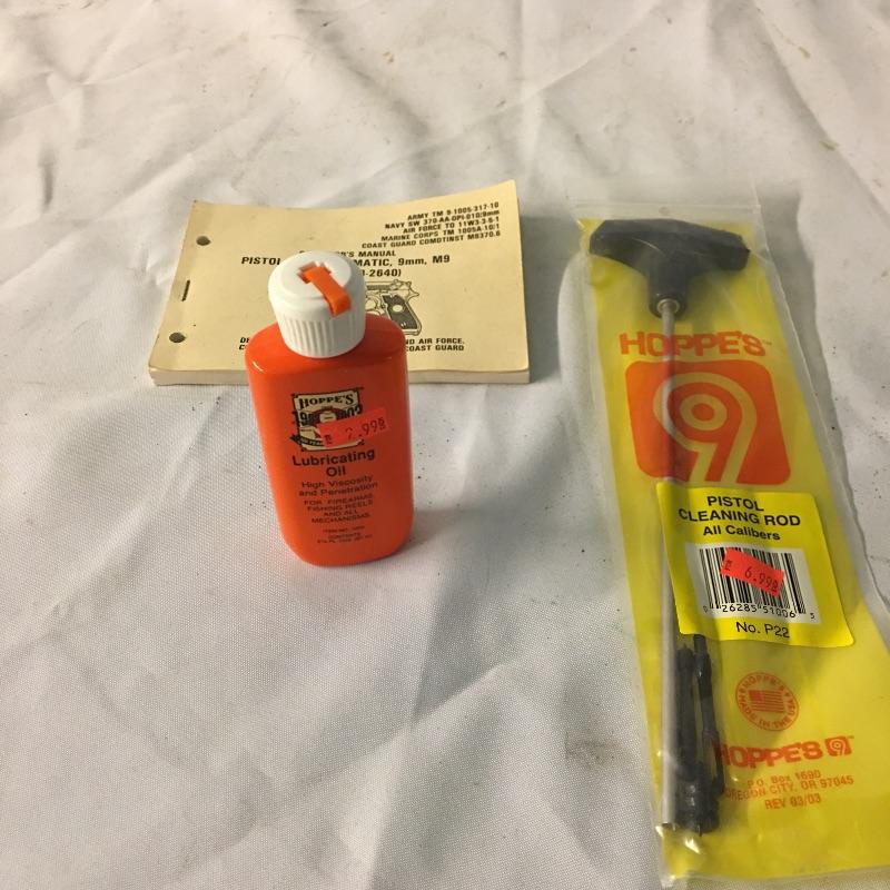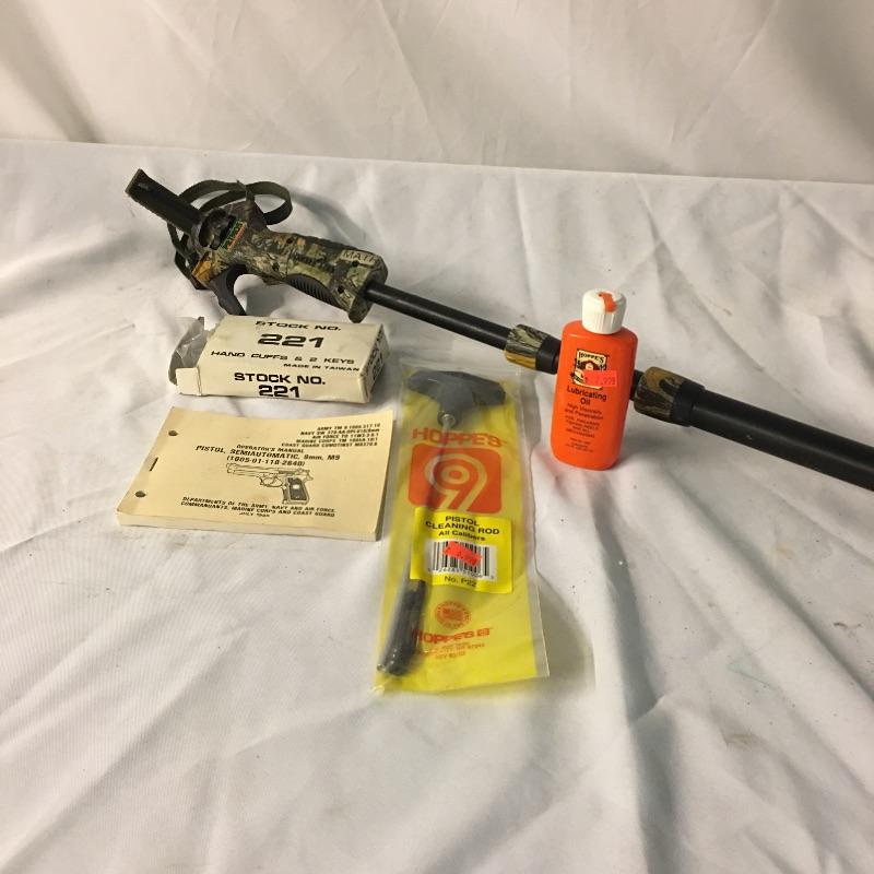 Here’s an interesting lot for your viewing and buying pleasure. Lot includes handcuffs with keys, trigger stick, pistol cleaning rod and lubricating oil.