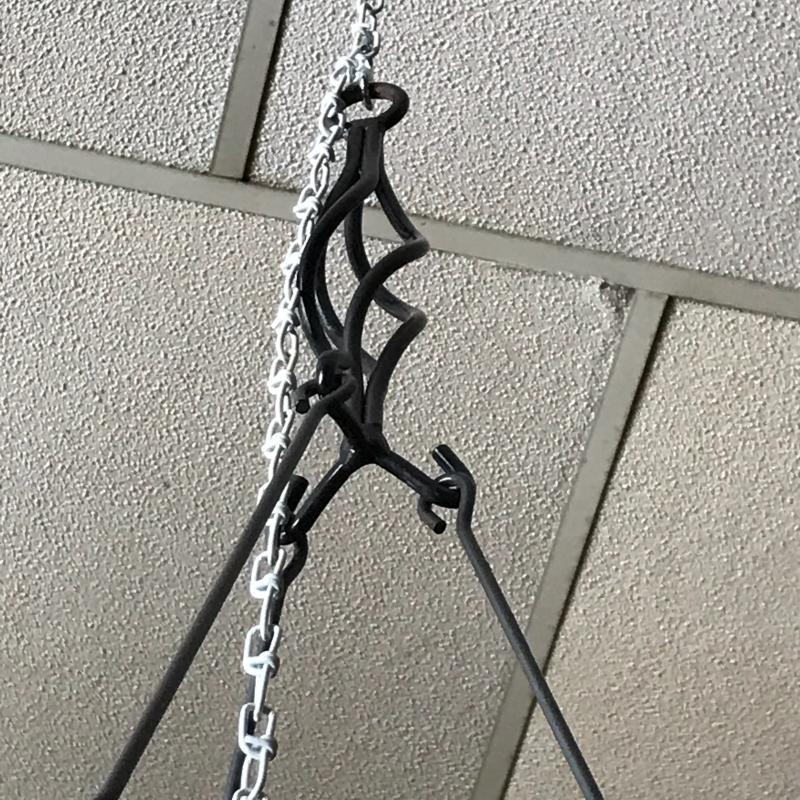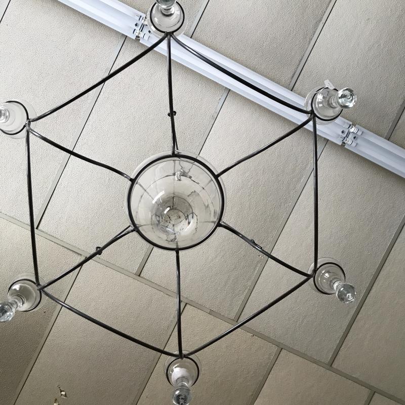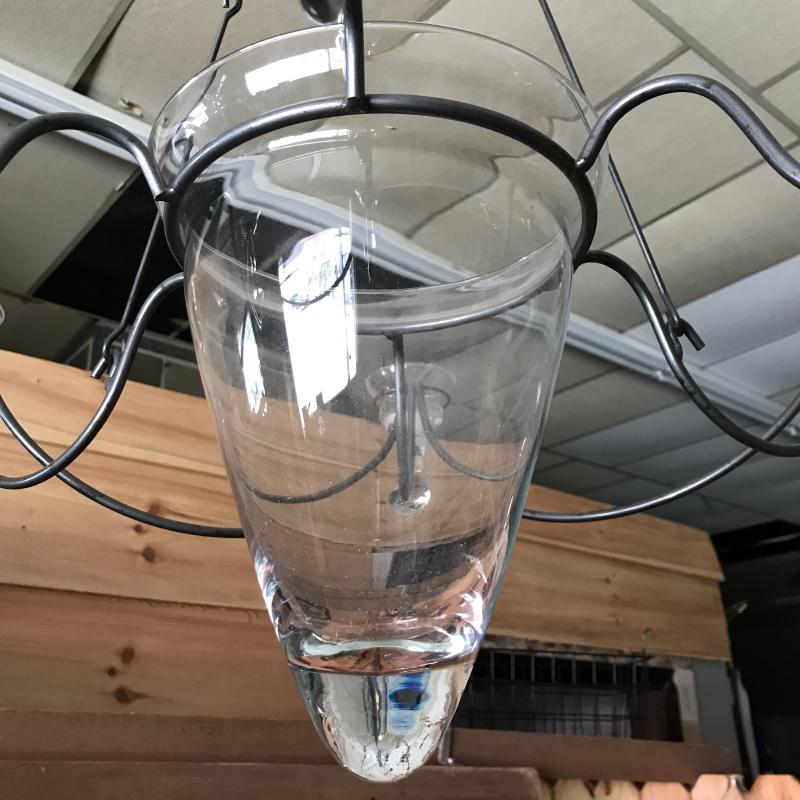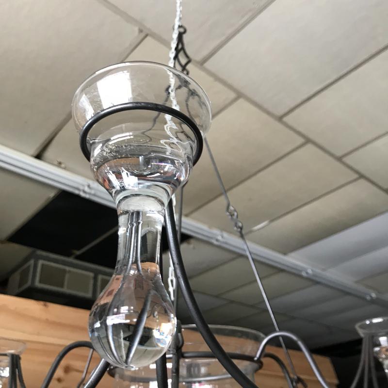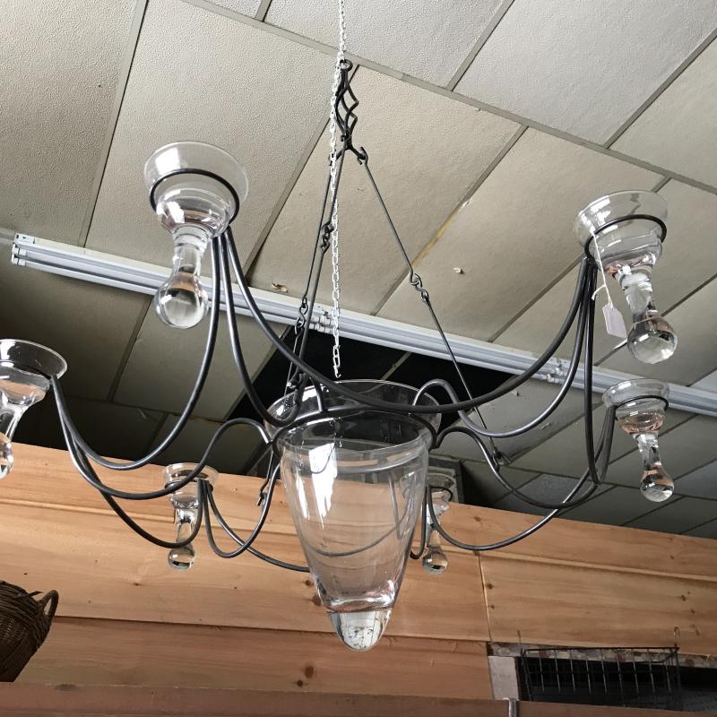 Metal and glass chandelier holds candles or other creative items. Each glass vase is removable. Can hang anywhere since there is no electricity. Measures approximately 33”d x 38”h. Local pick up only in Maggie Valley, NC.