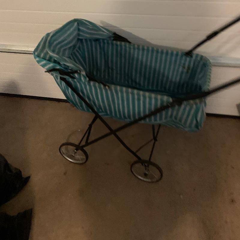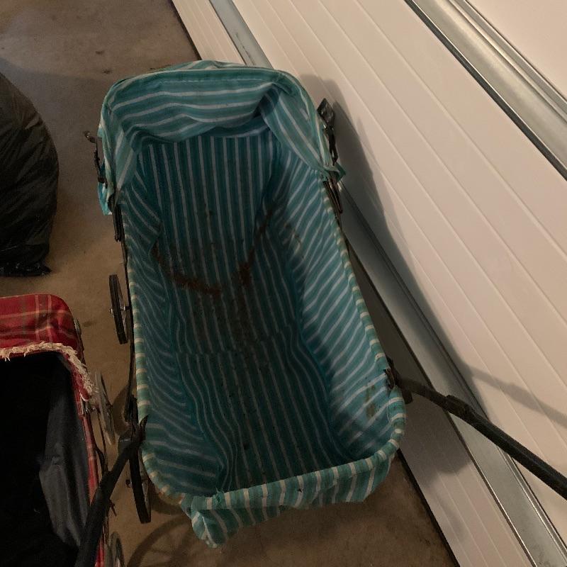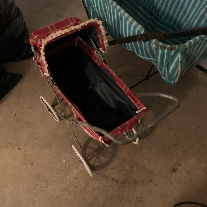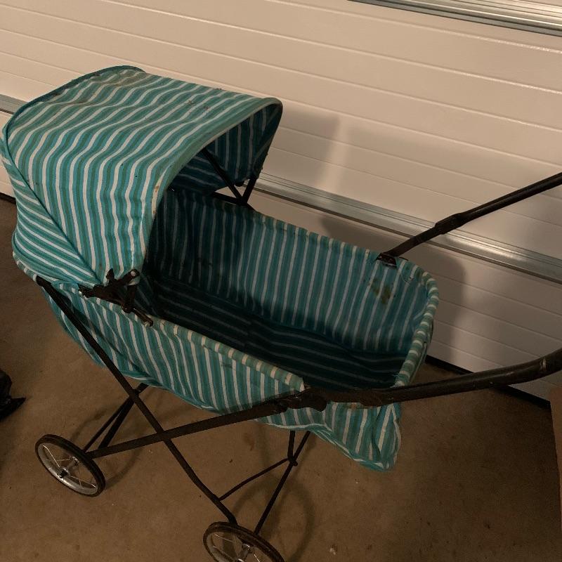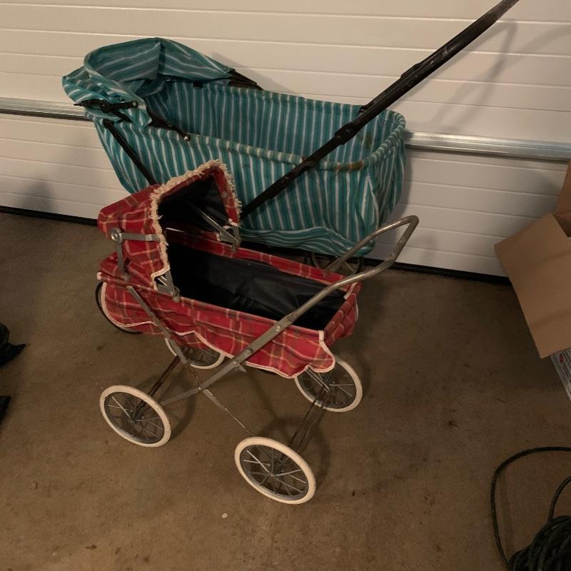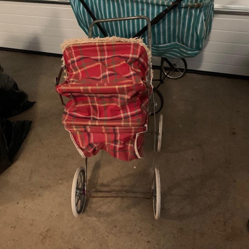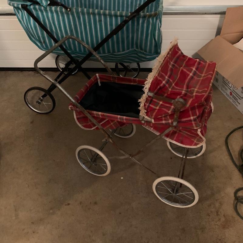 These two pieces have really stood the test of time. The blue larger stroller seems to be a true baby stroller though not to be used today except for show. The fabric has a little wear and a bit dirty. The smaller one is a doll stroller and was a little bent but we got it upright but may need a little more tweaking and cleaning. The large one measures 41” x34”x21” and small one is 24” x12”x22”. The each fold down with some encouragement but we are not photographing folded as they again may need some adjusting. Local pick up only.