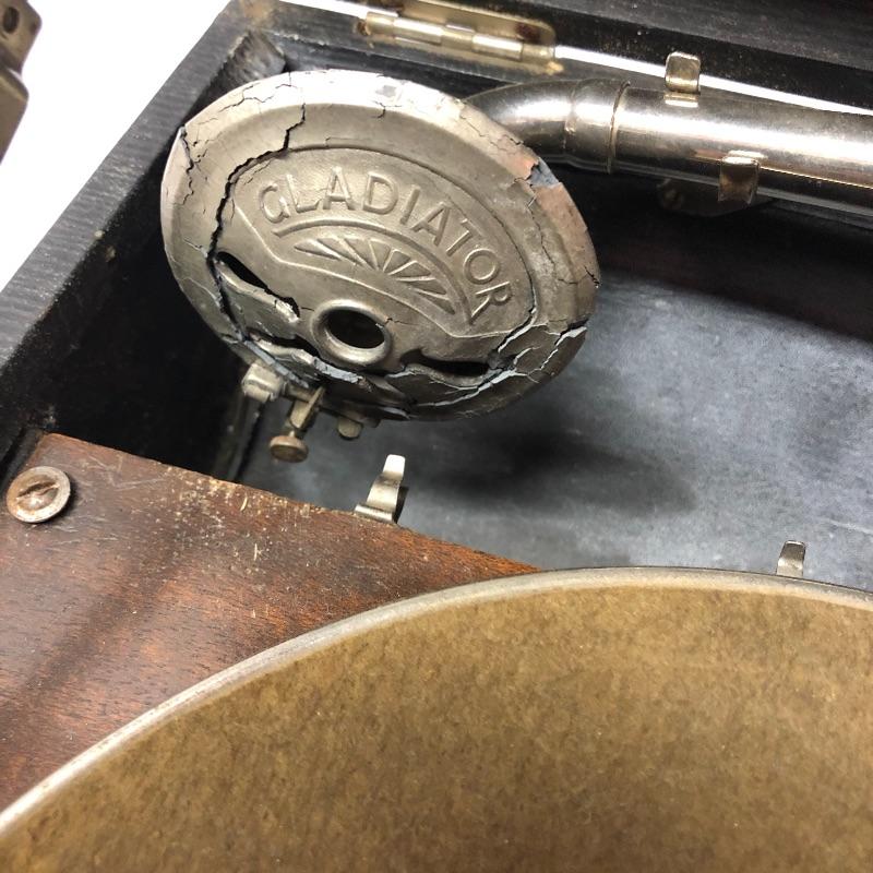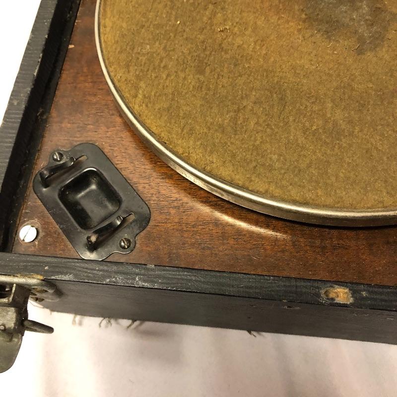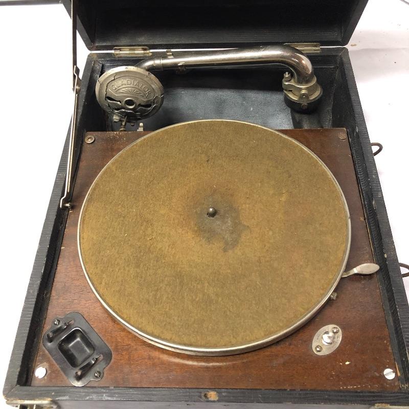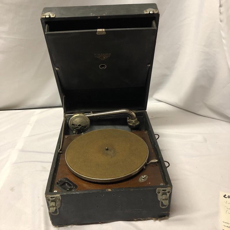 This lot includes one Victrola-Victor Talking Machine Co. portable Phonograph. It sports a gladiator arm. Turntable does not turn as it is missing its’ crank.