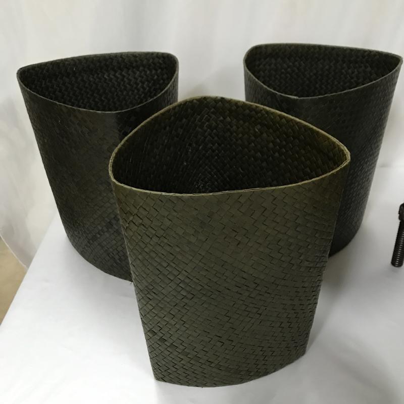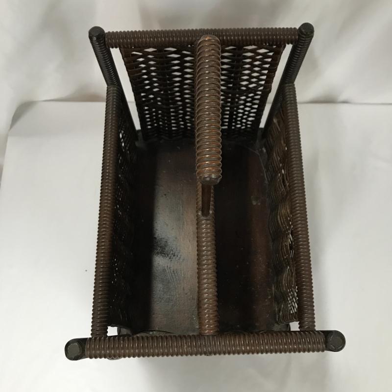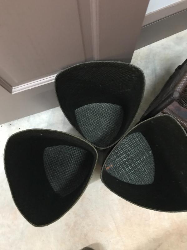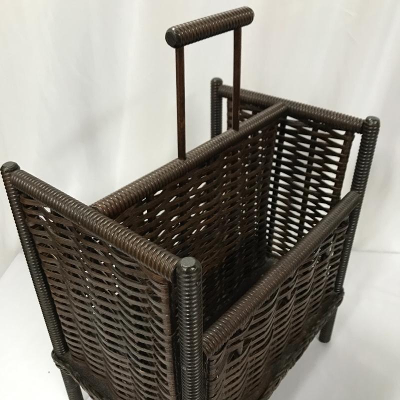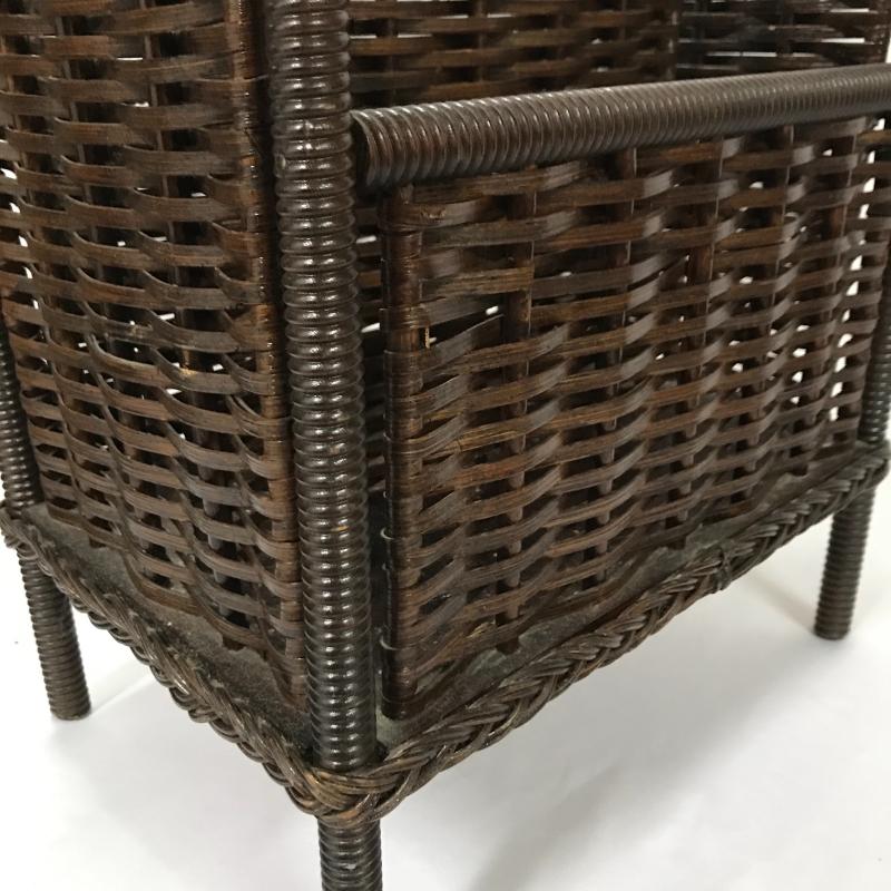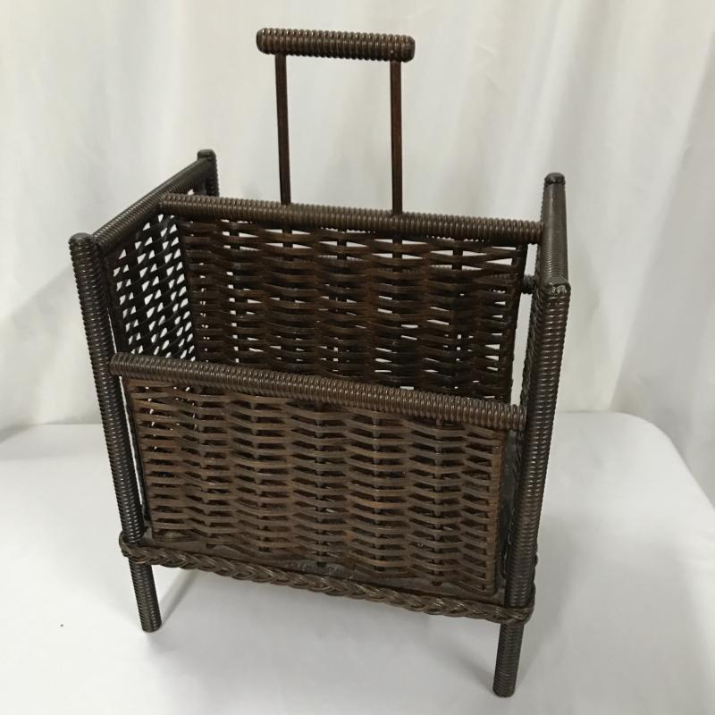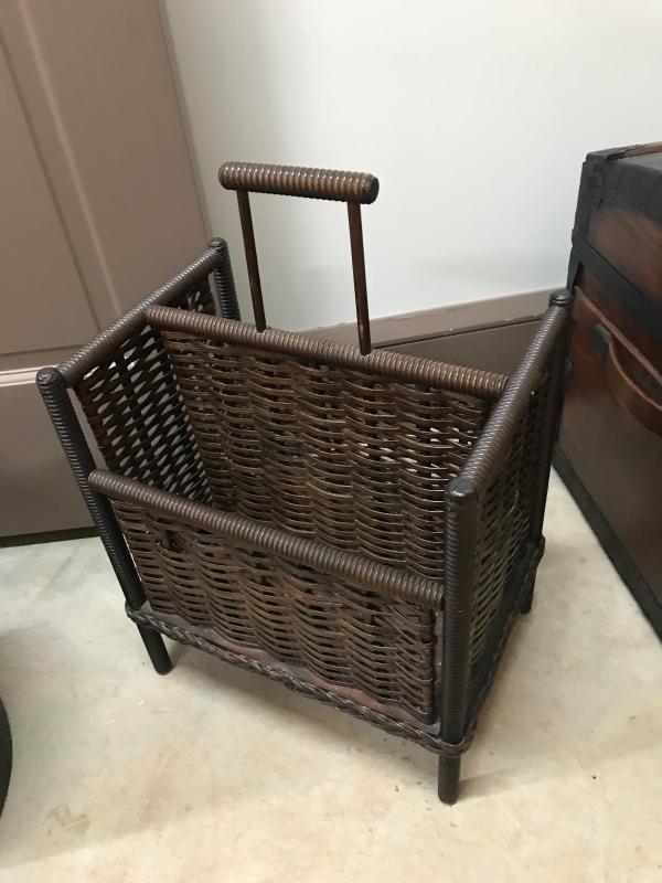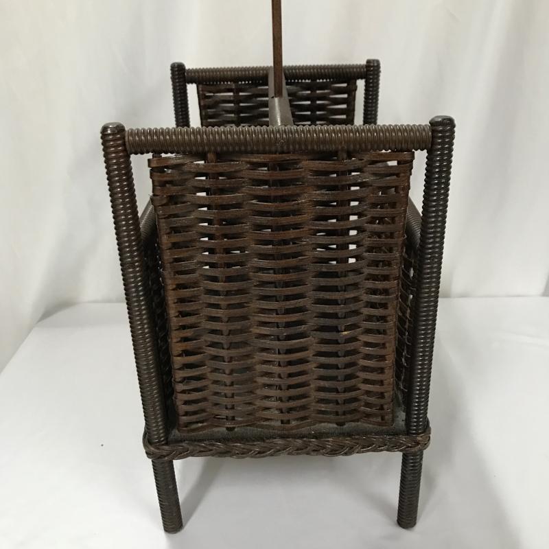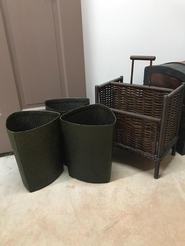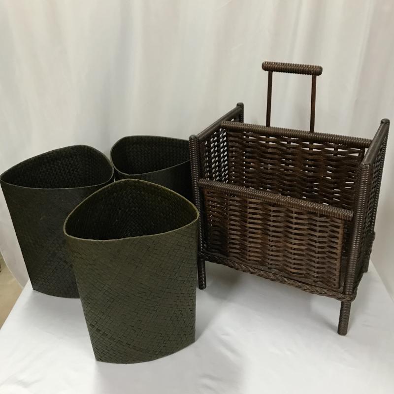 Three woven Trashcans and a wood and wicker magazine stand. Lot is available for local pick up in Asheville, NC only.