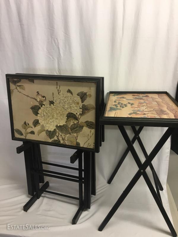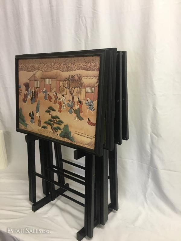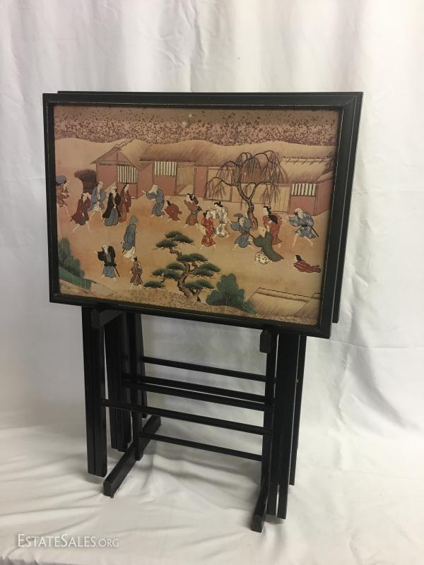 4 uniquely designed Japanes trays on stand. This lot is available for local pick up in Waynesville, NC only.
