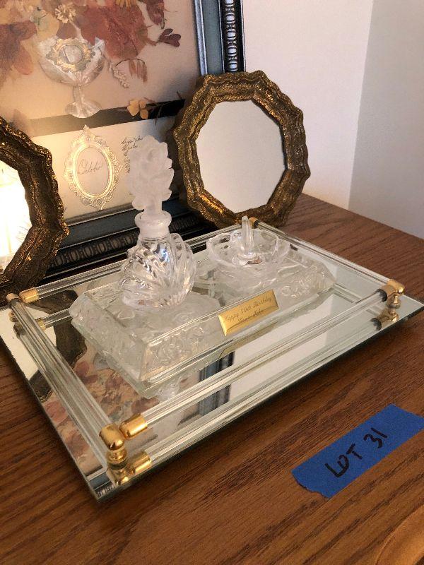 Lot 31 - Large Standing Oak Jewelry Chest w/Wall Art, Mirrors and Vanity Items