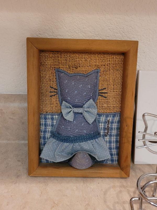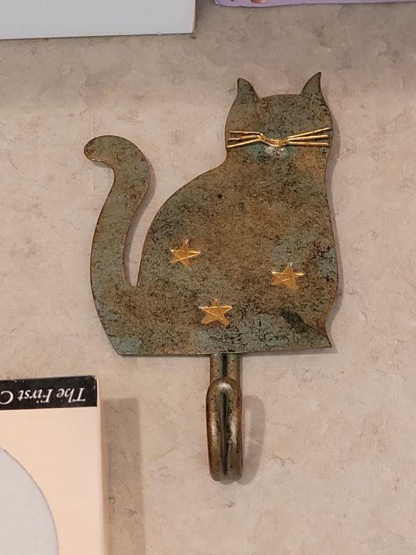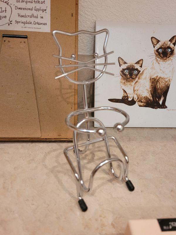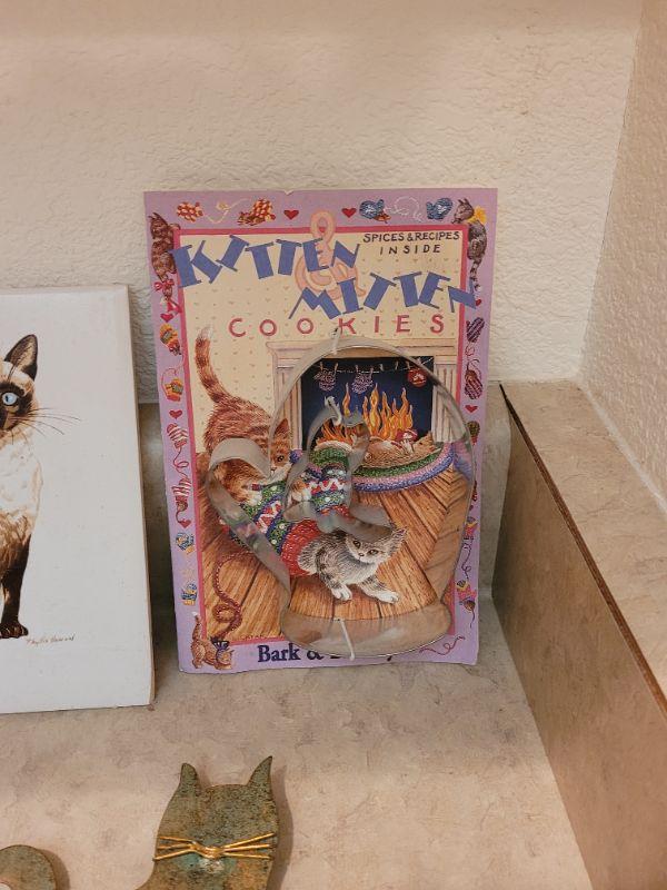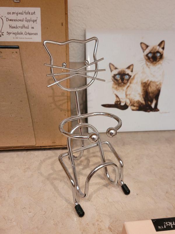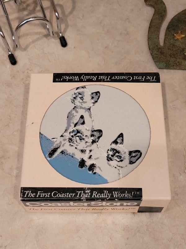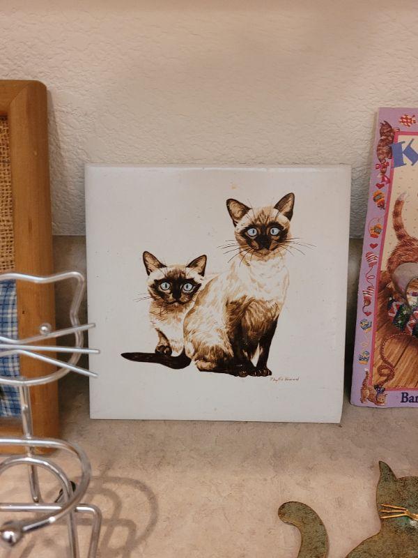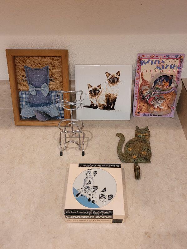 Lot 31: Cat Folk Art Picture, Siamese Cats Tile, Cookie Cutters, Cat with Hook & CoasterStones