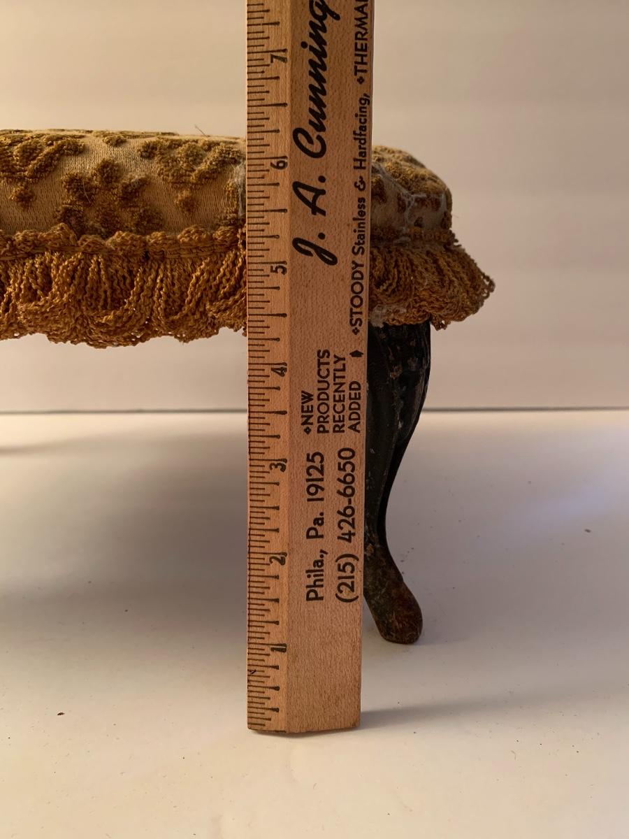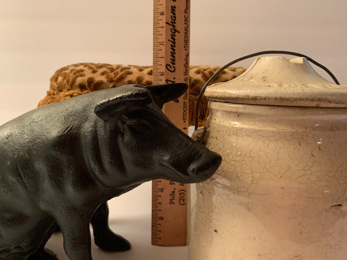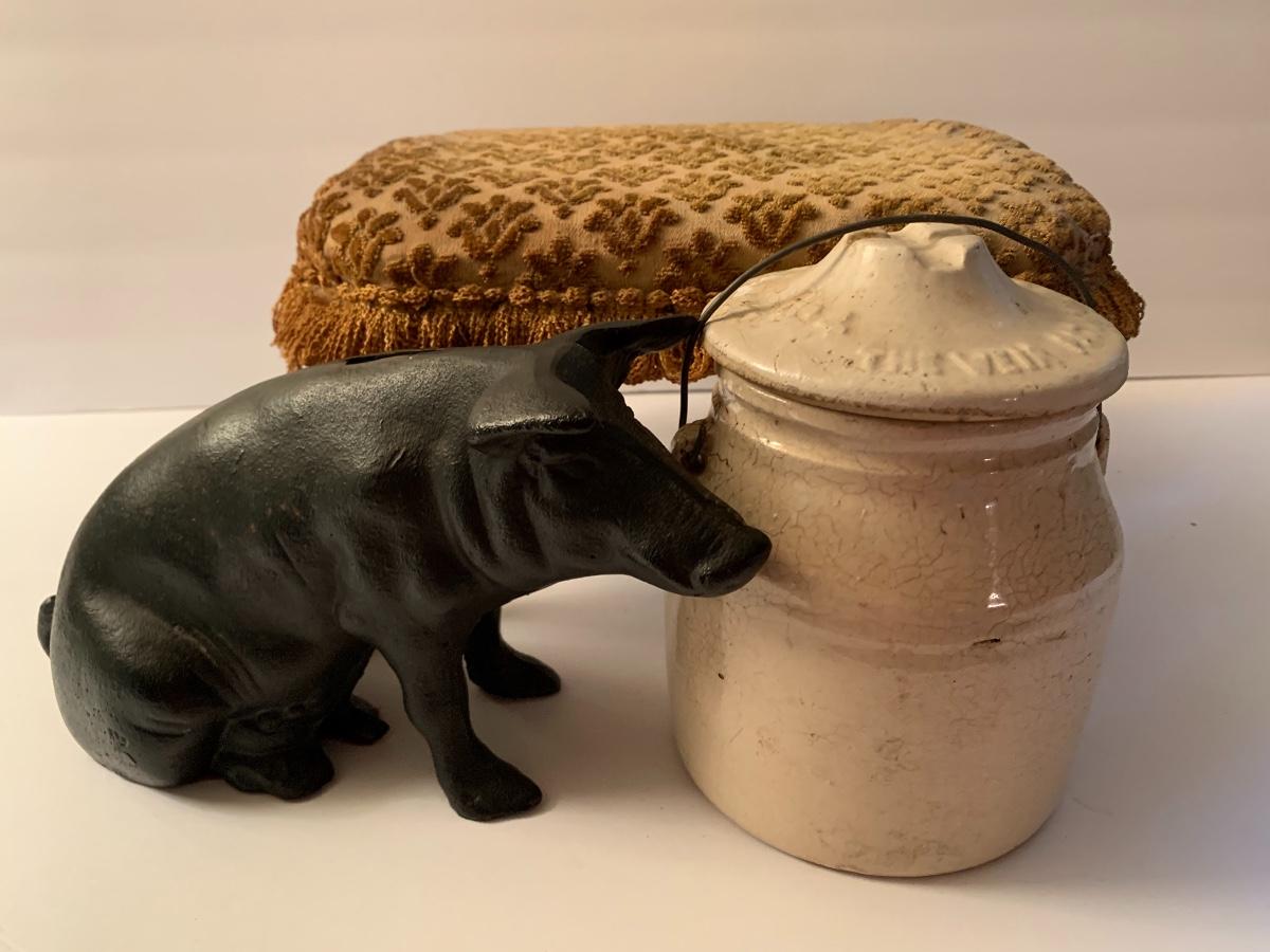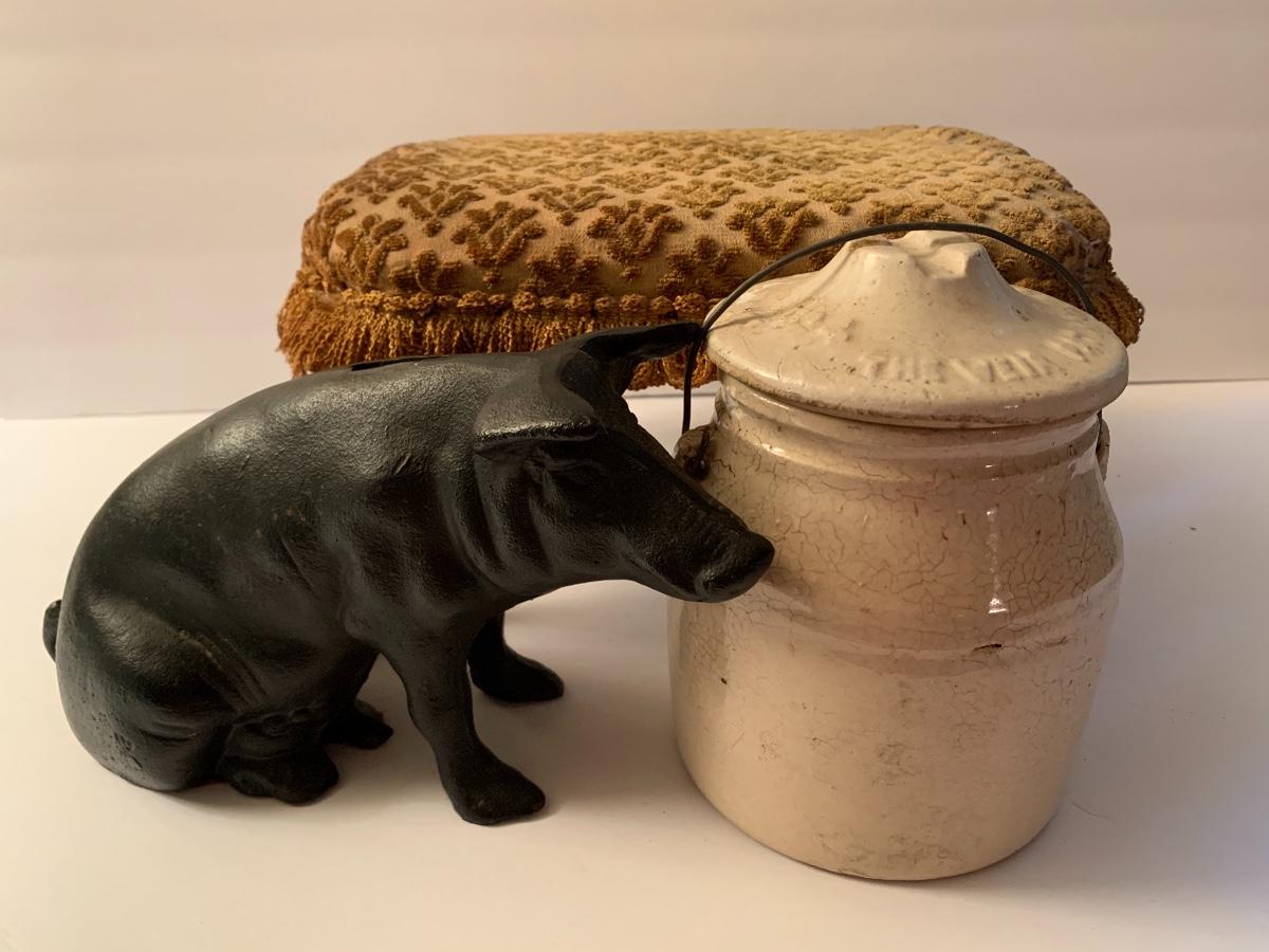 Lot 31: Weir Stoneware Crock, Vintage Cast Iron Pig Bank, and Antique Foot Stool