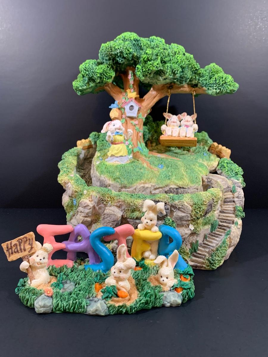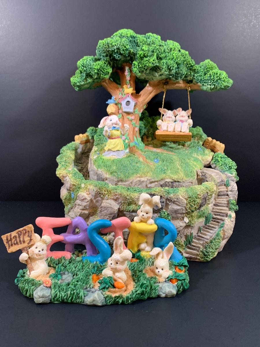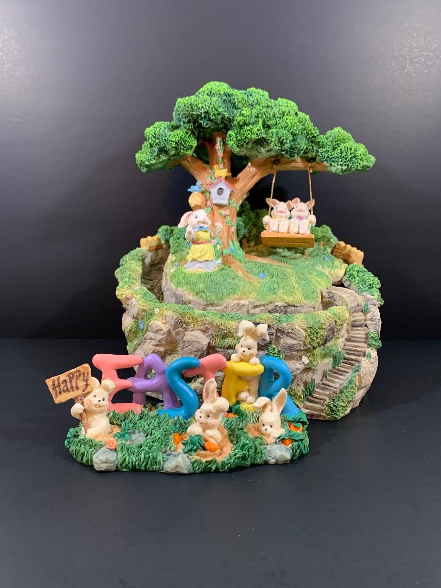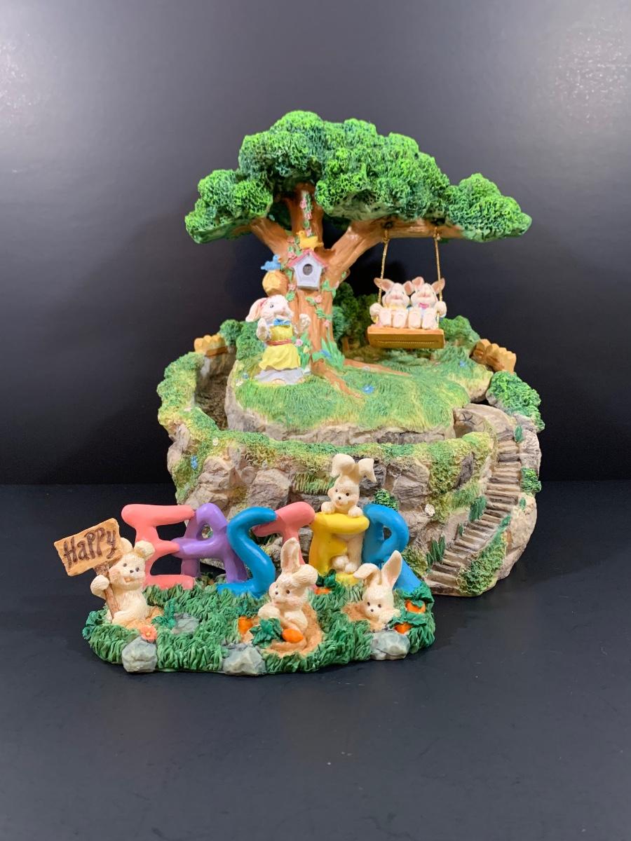 Bunnies on swing with mom watching close by is actually a fountain. The pump is missing yet still a nice piece along with a Happy Easter decoration. Both pieces are made of resin