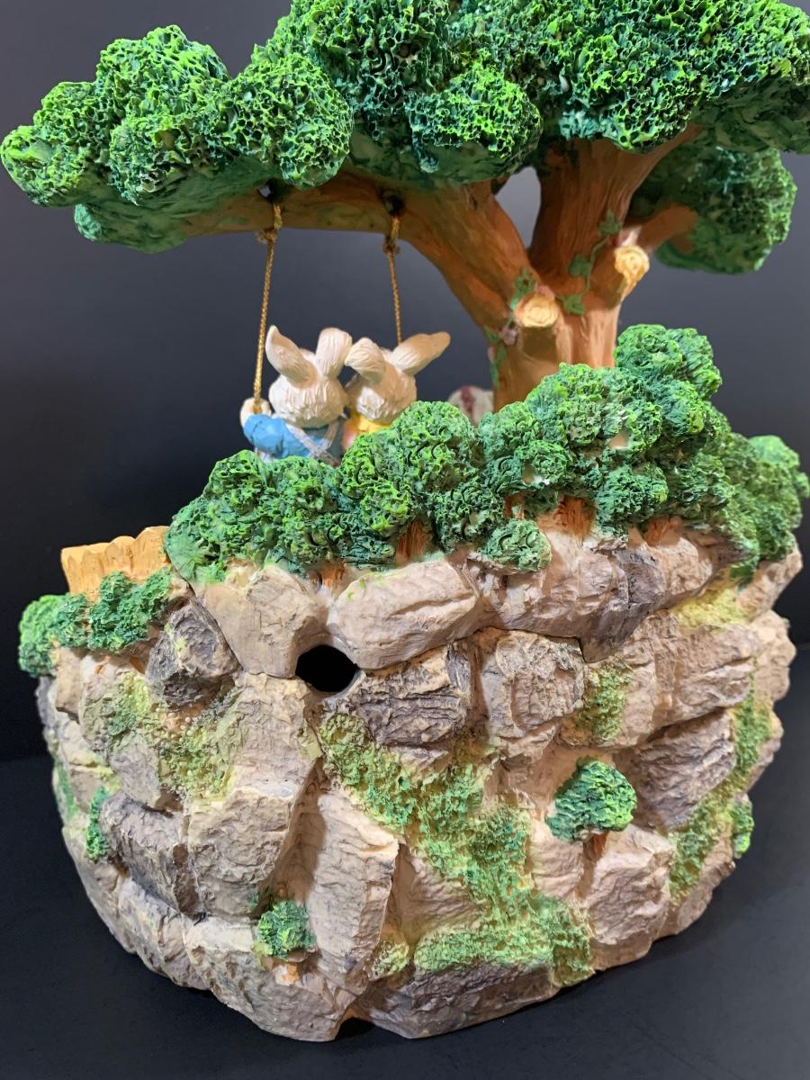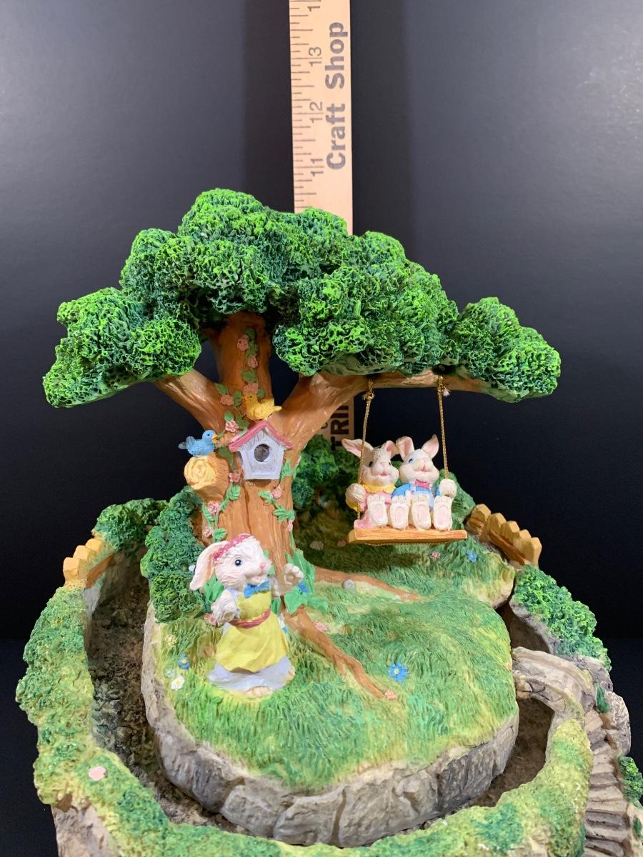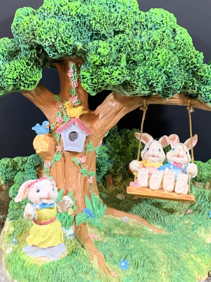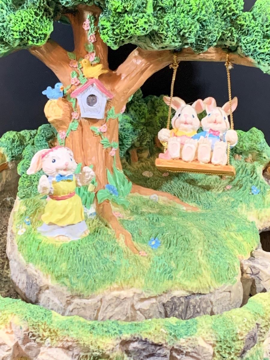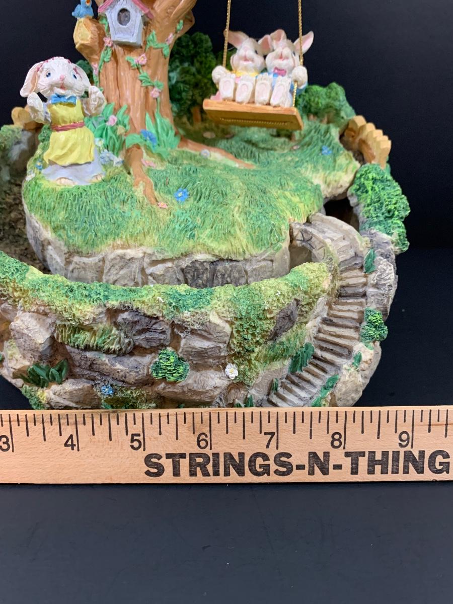 Bunnies on swing with mom watching close by is actually a fountain. The pump is missing yet still a nice piece along with a Happy Easter decoration. Both pieces are made of resin