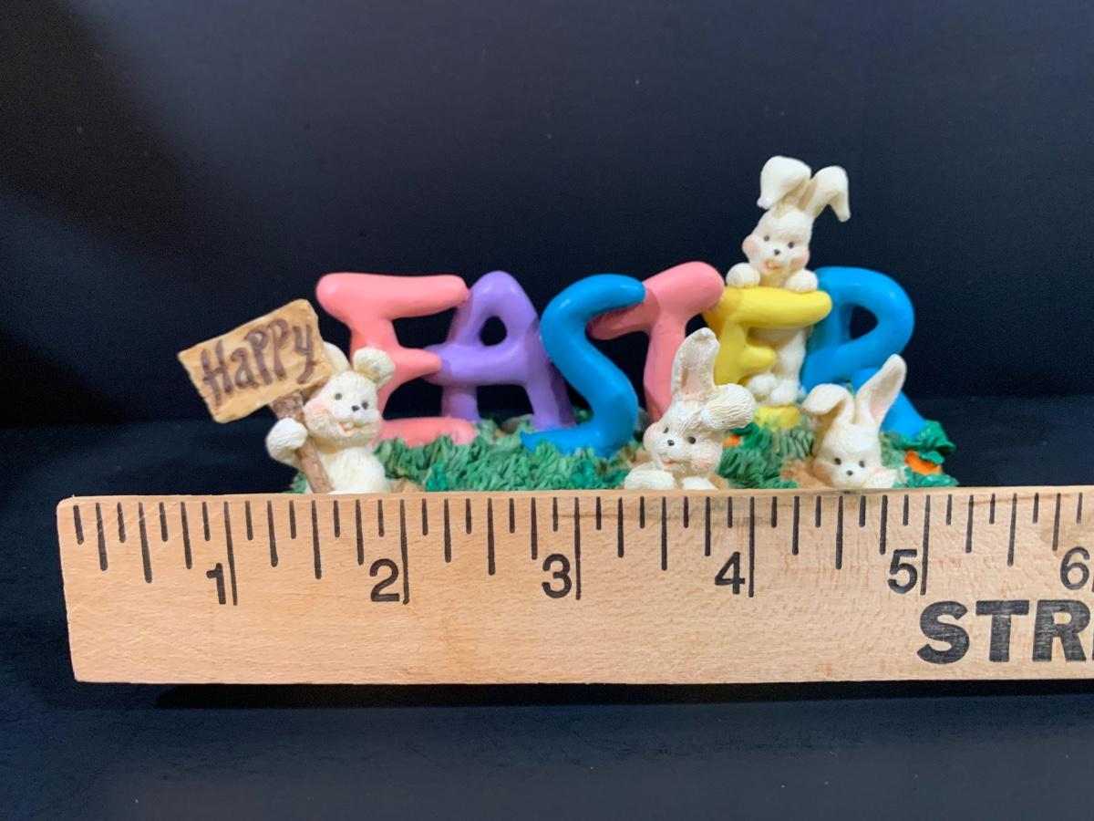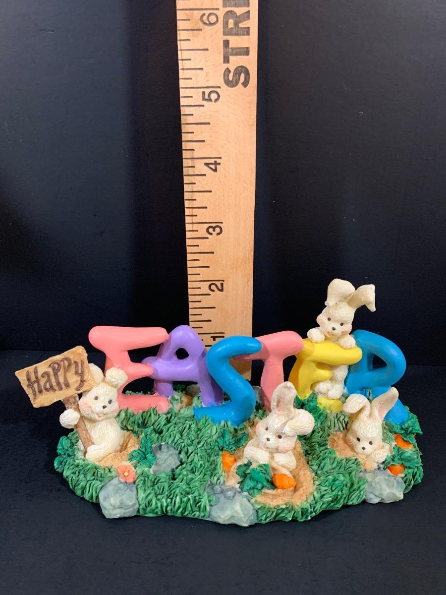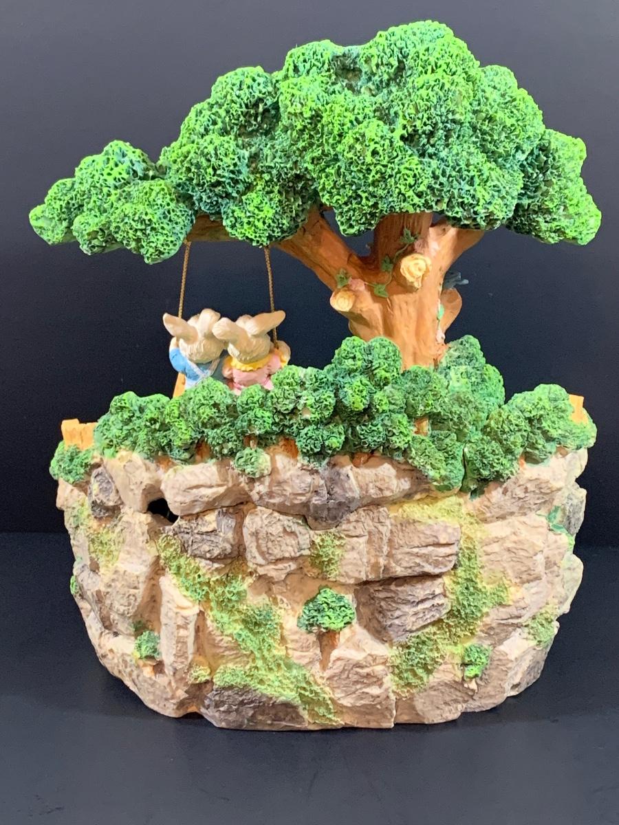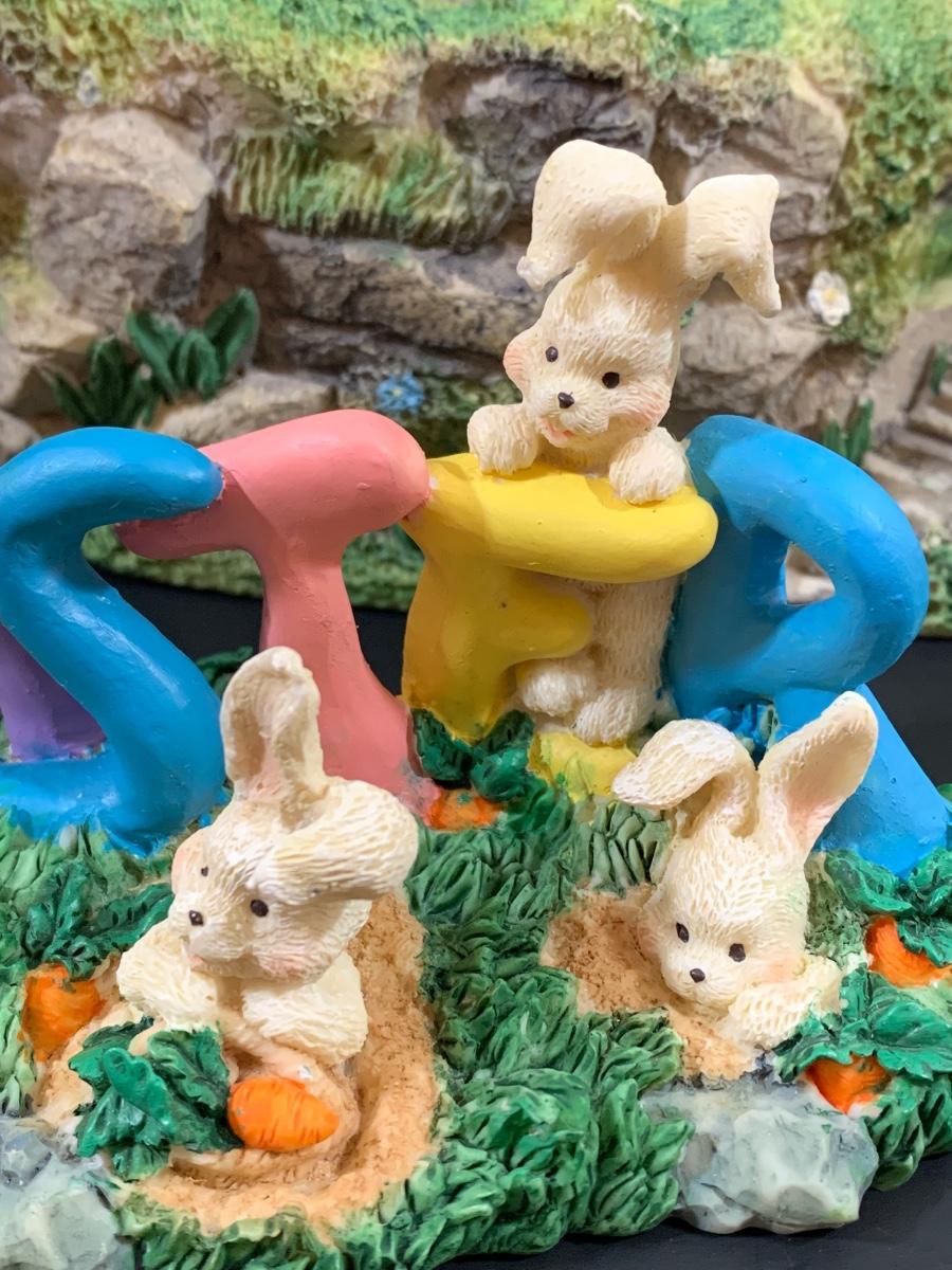 Bunnies on swing with mom watching close by is actually a fountain. The pump is missing yet still a nice piece along with a Happy Easter decoration. Both pieces are made of resin