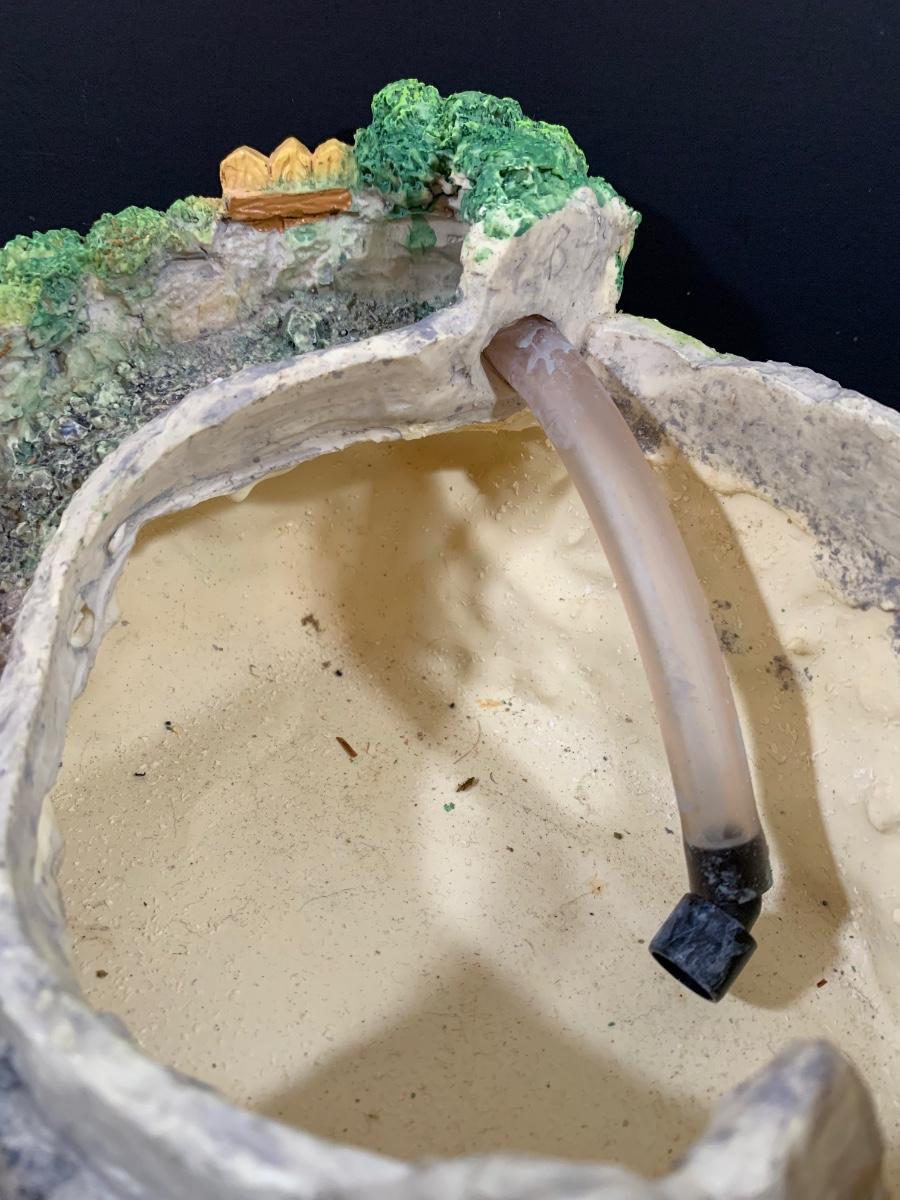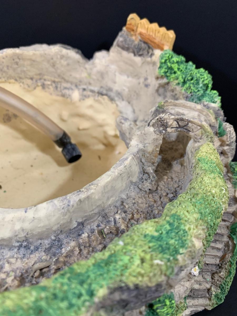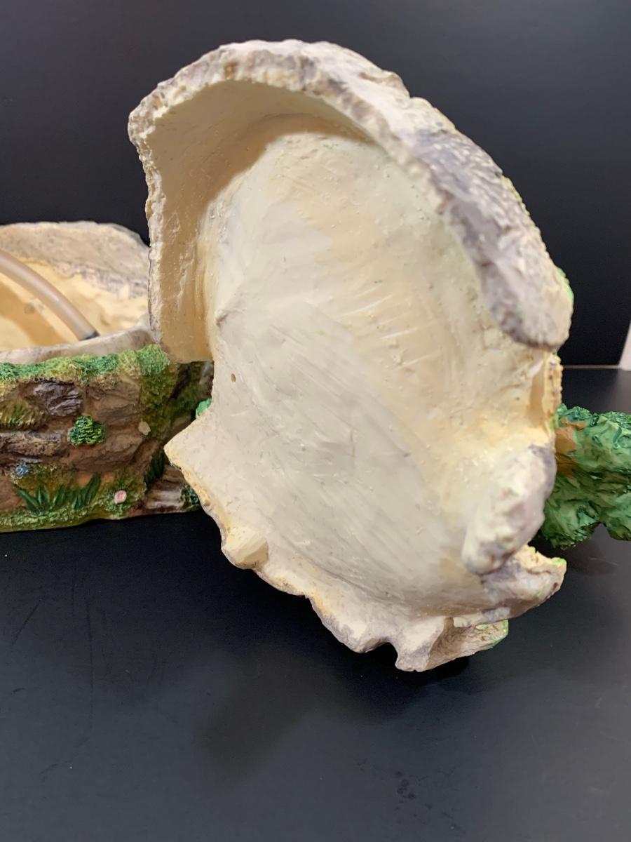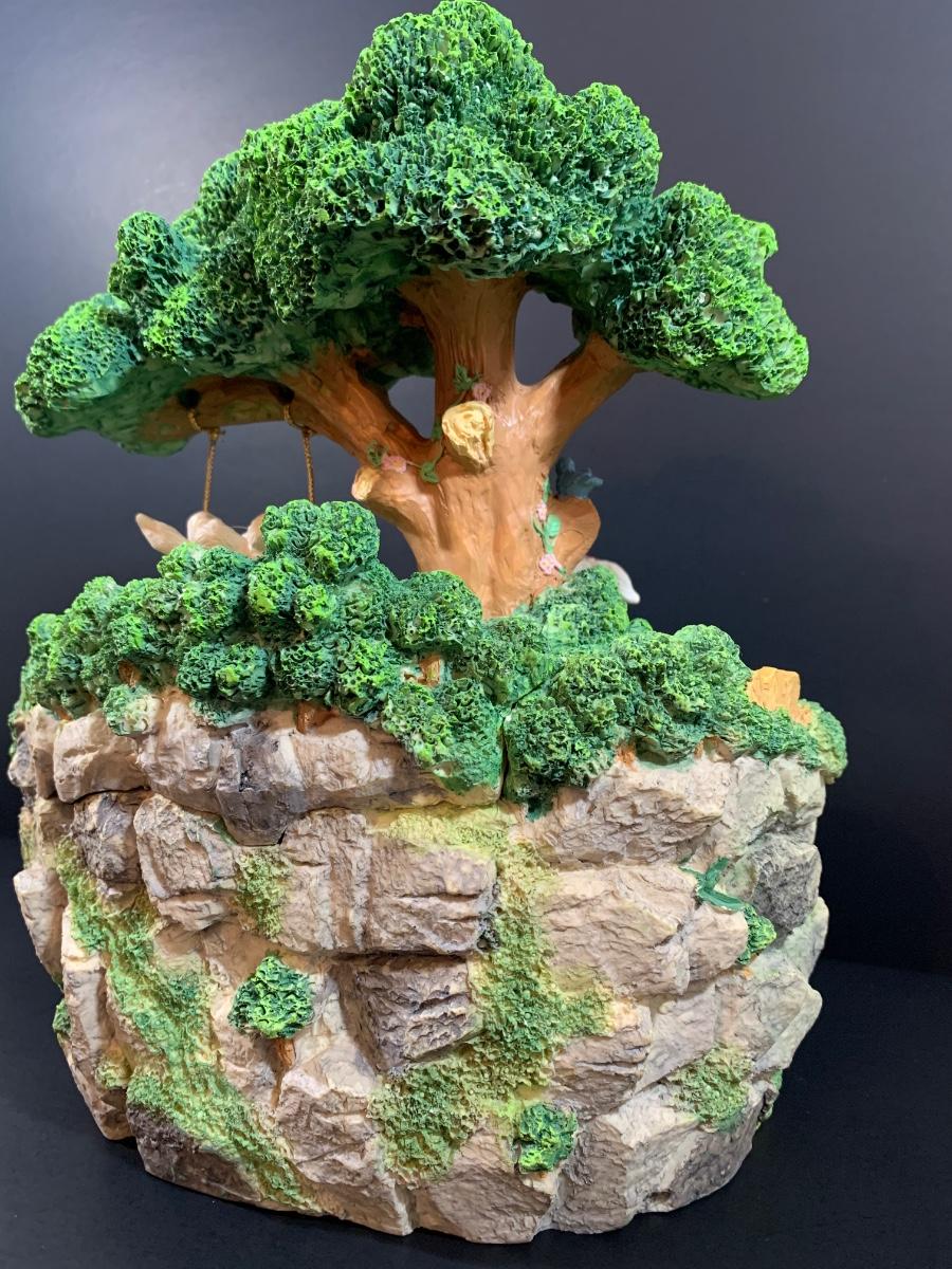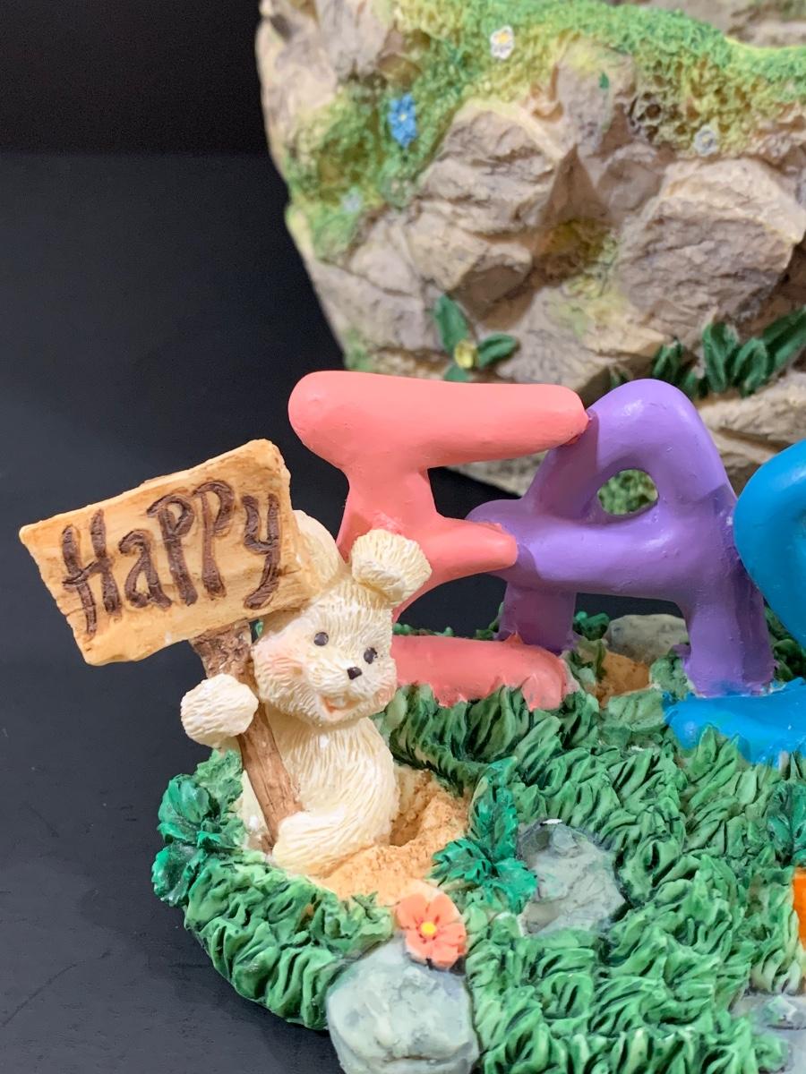 Bunnies on swing with mom watching close by is actually a fountain. The pump is missing yet still a nice piece along with a Happy Easter decoration. Both pieces are made of resin
