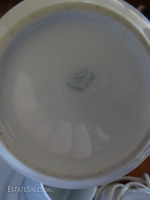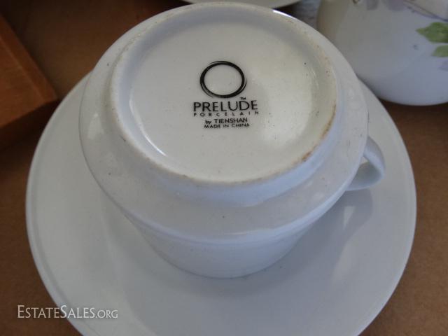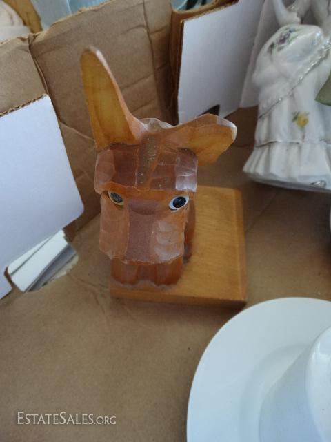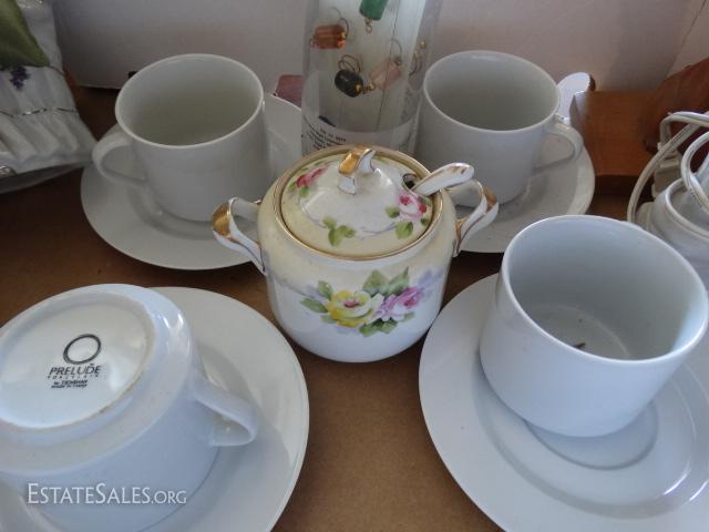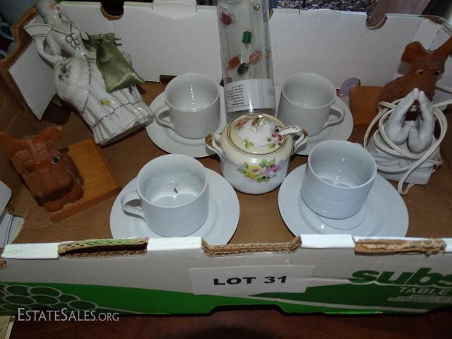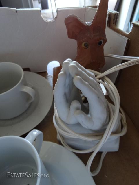 Porcelain coffee cups & saucers, Creamer bowl, figurines, praying hands, wooden dog bookends.
